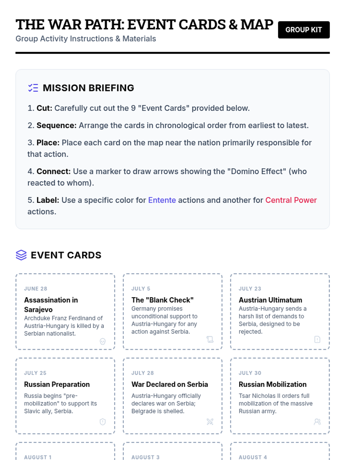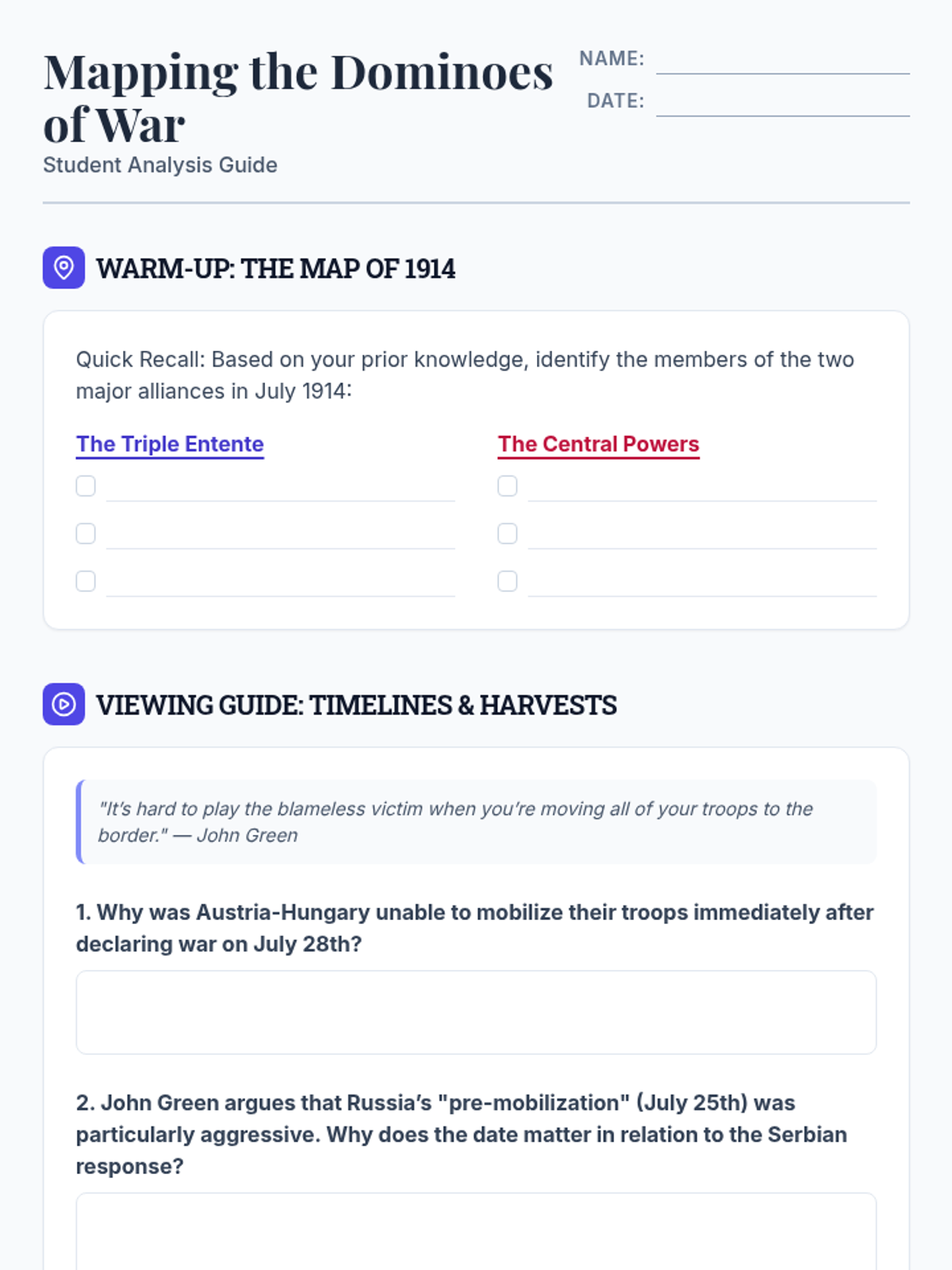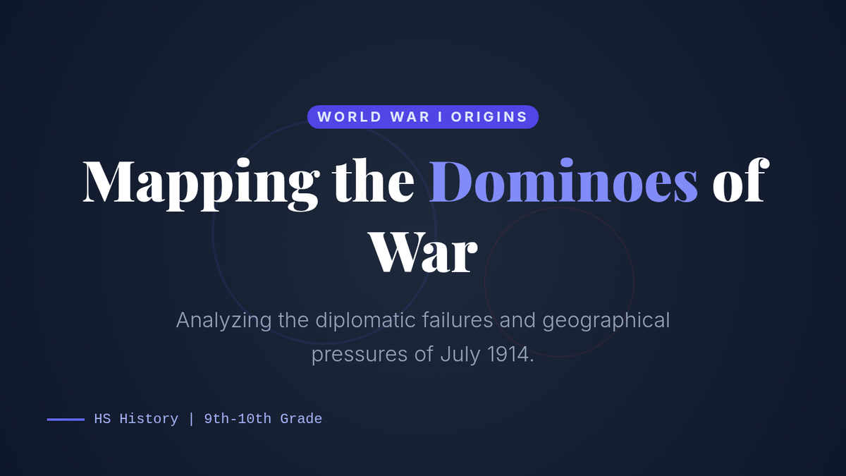 A 9th-10th grade history lesson exploring the diplomatic and geographical factors that led to the outbreak of World War I. Students analyze the 'July Crisis' through a chronological mapping activity and examine the role of Russian mobilization and geopolitics.
