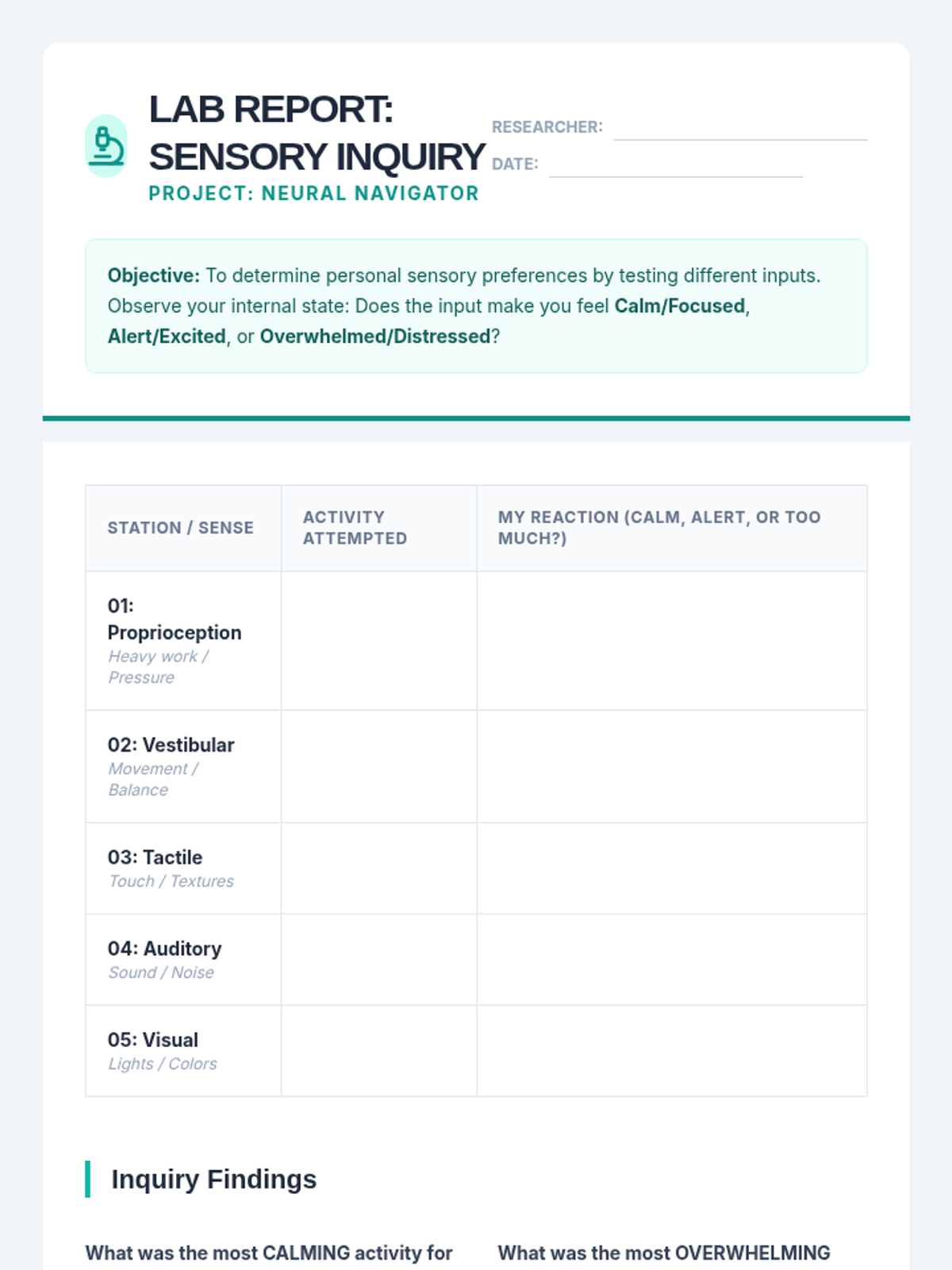 Discover the 8 sensory systems including proprioception, vestibular, and interoception. Students participate in station-based inquiry to determine their personal sensory preferences.