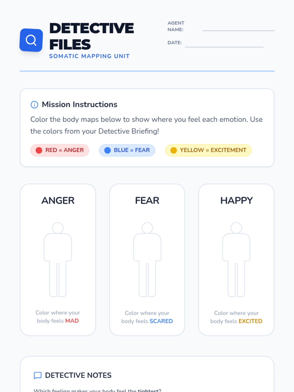 Students learn that emotions have a physical presence in the body by coloring body maps for anger, fear, and excitement.