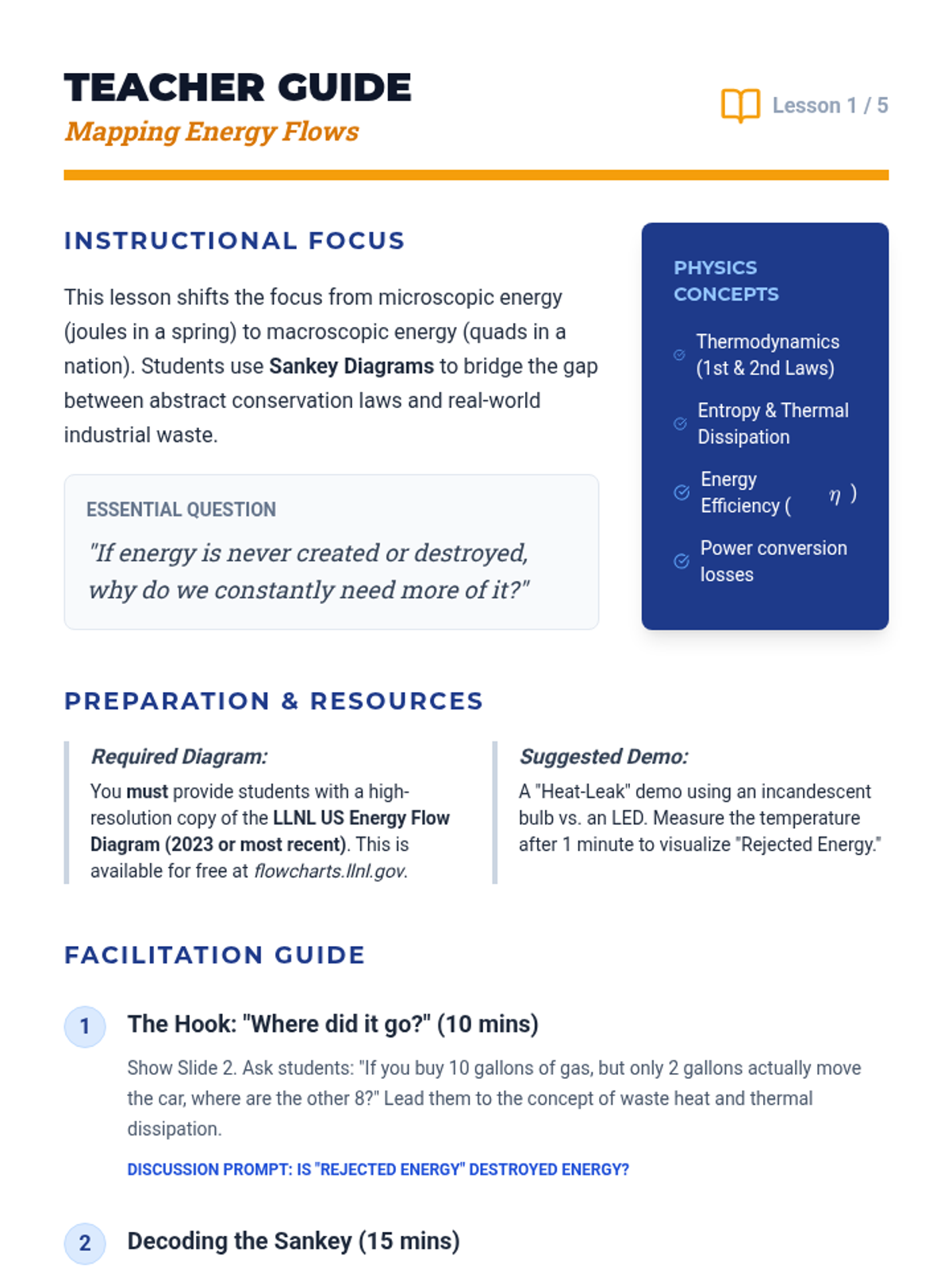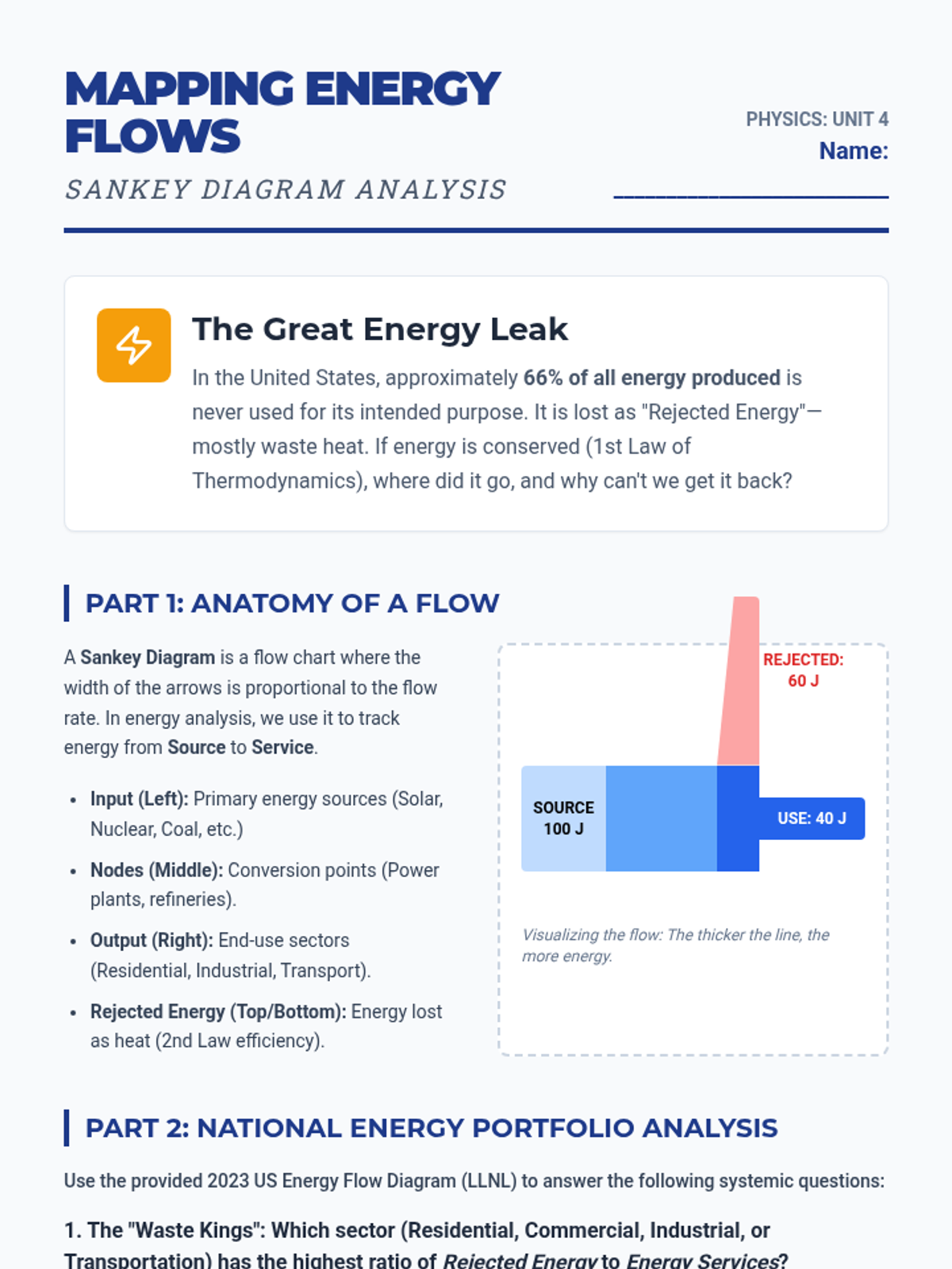 Students learn to read and create Sankey diagrams to visualize energy flow through national economies, identifying major points of systemic inefficiency and waste heat.