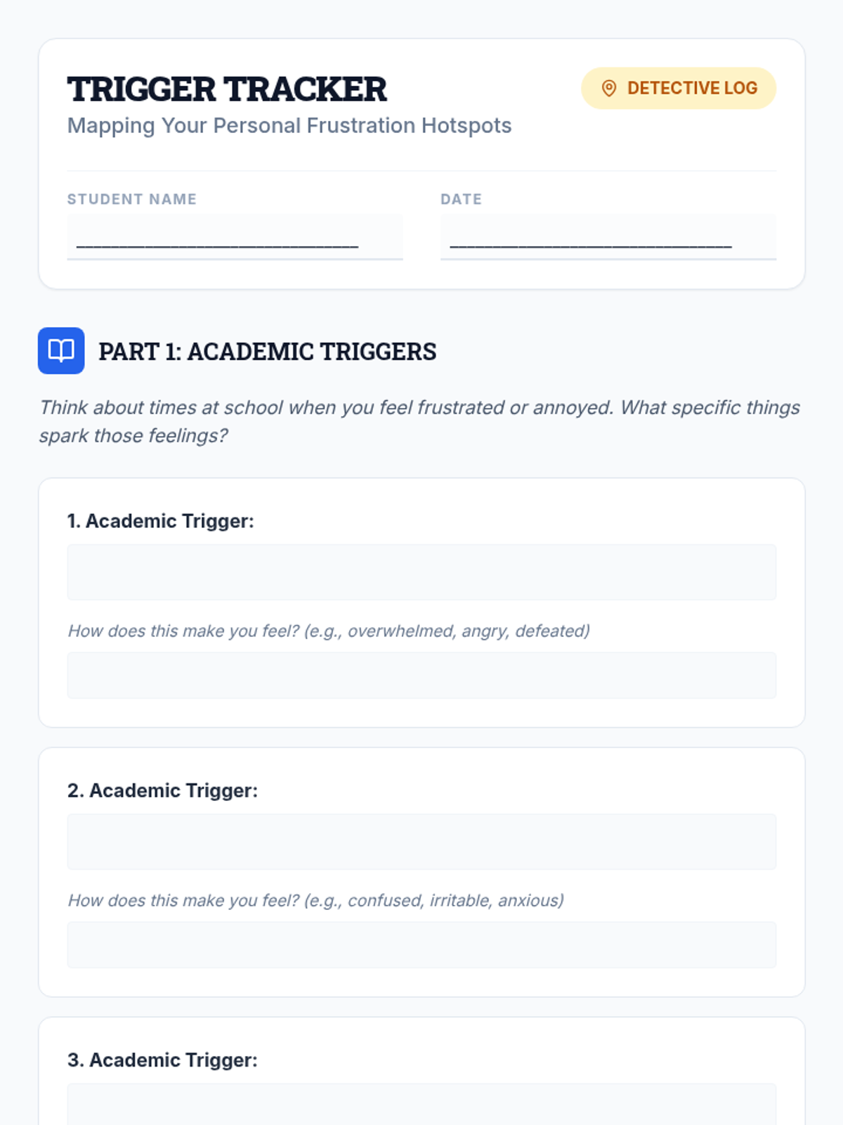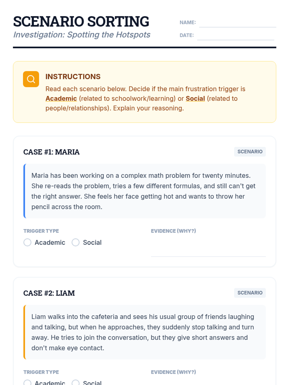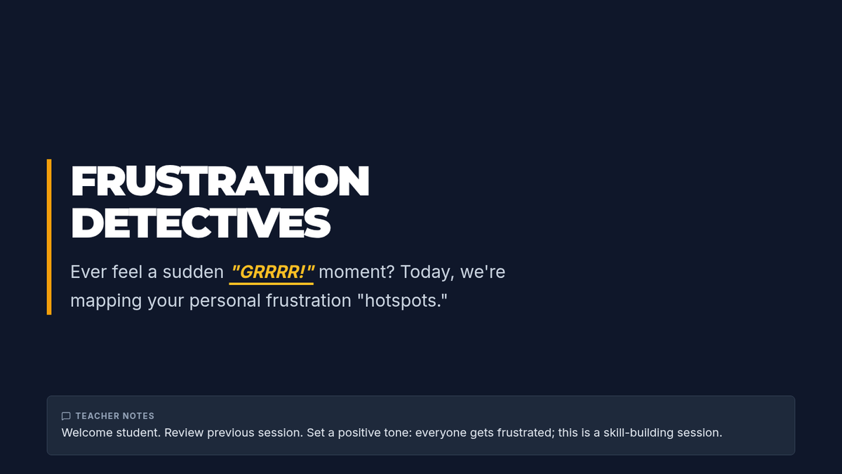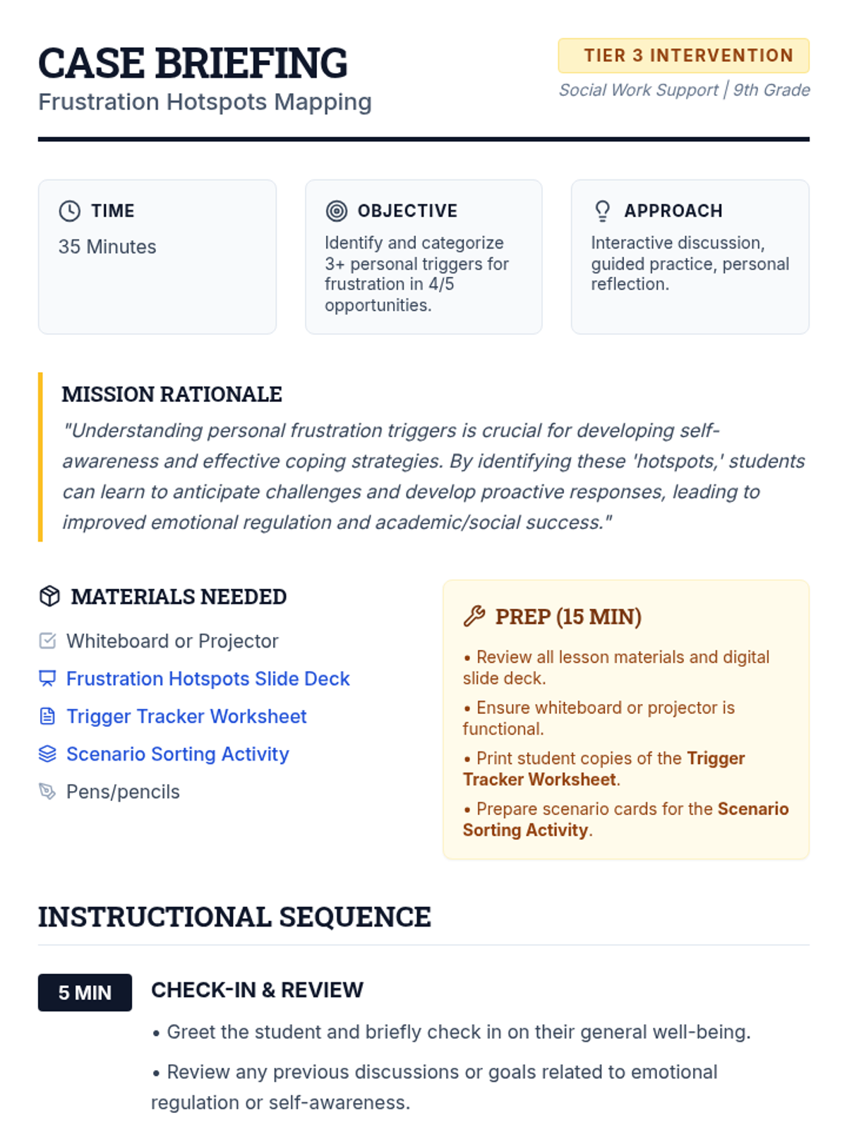 This 35-minute Tier 3 social work session helps 9th-grade students identify and categorize personal academic and social triggers for frustration, fostering self-awareness and proactive emotional regulation.