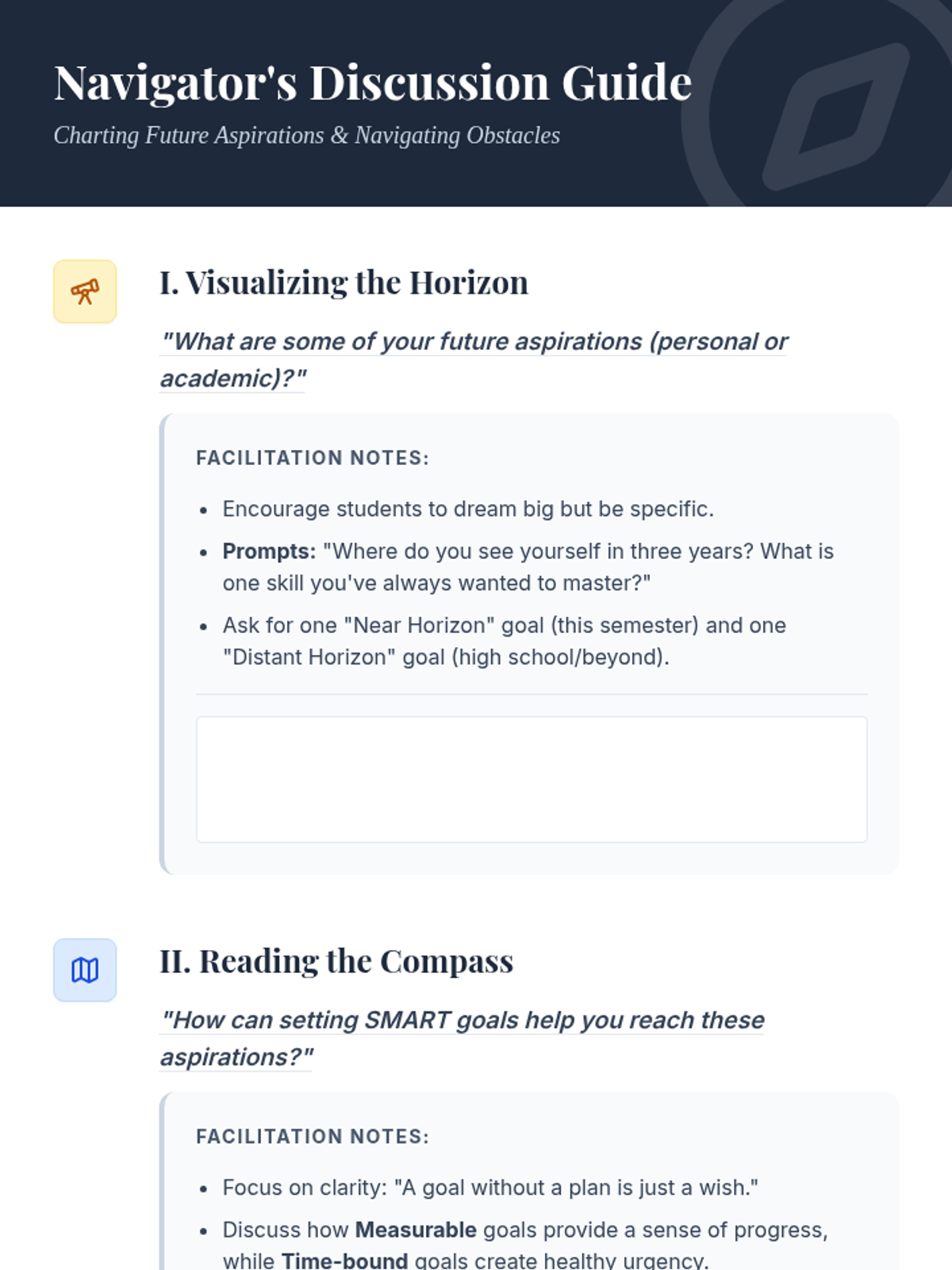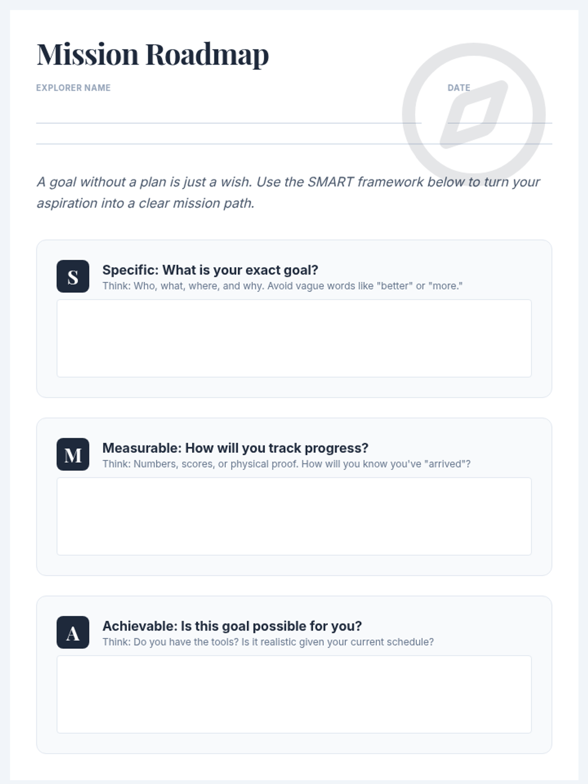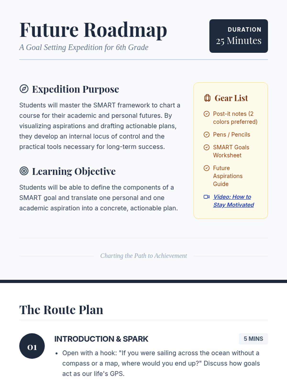 A comprehensive lesson designed for 6th-grade students to master SMART goal setting through the lens of a personal roadmap. Students will visualize aspirations, learn the SMART framework, and create actionable plans for academic and personal success.