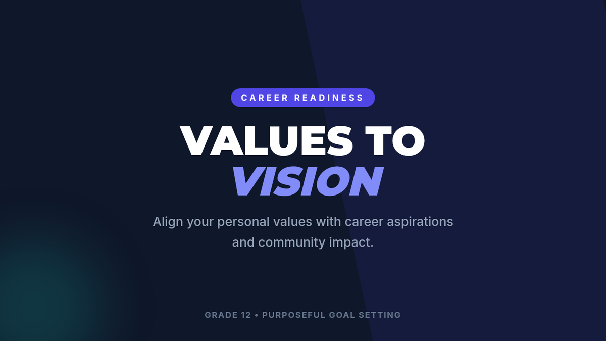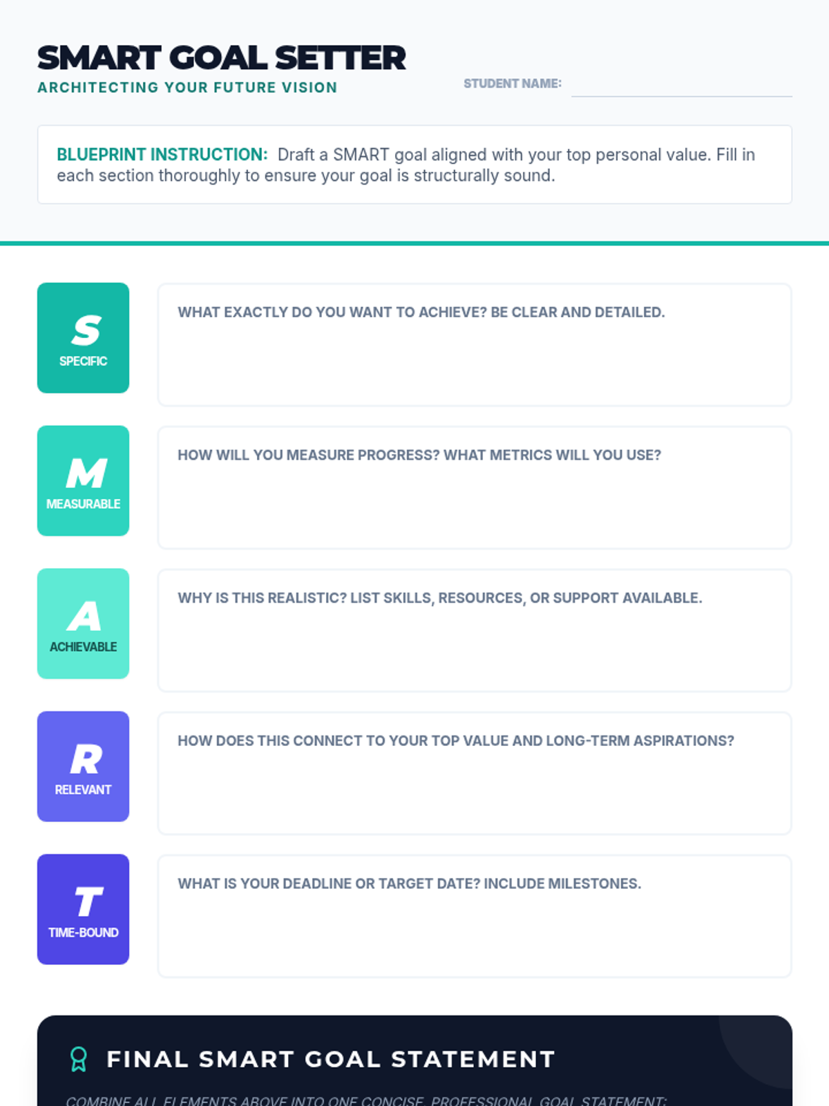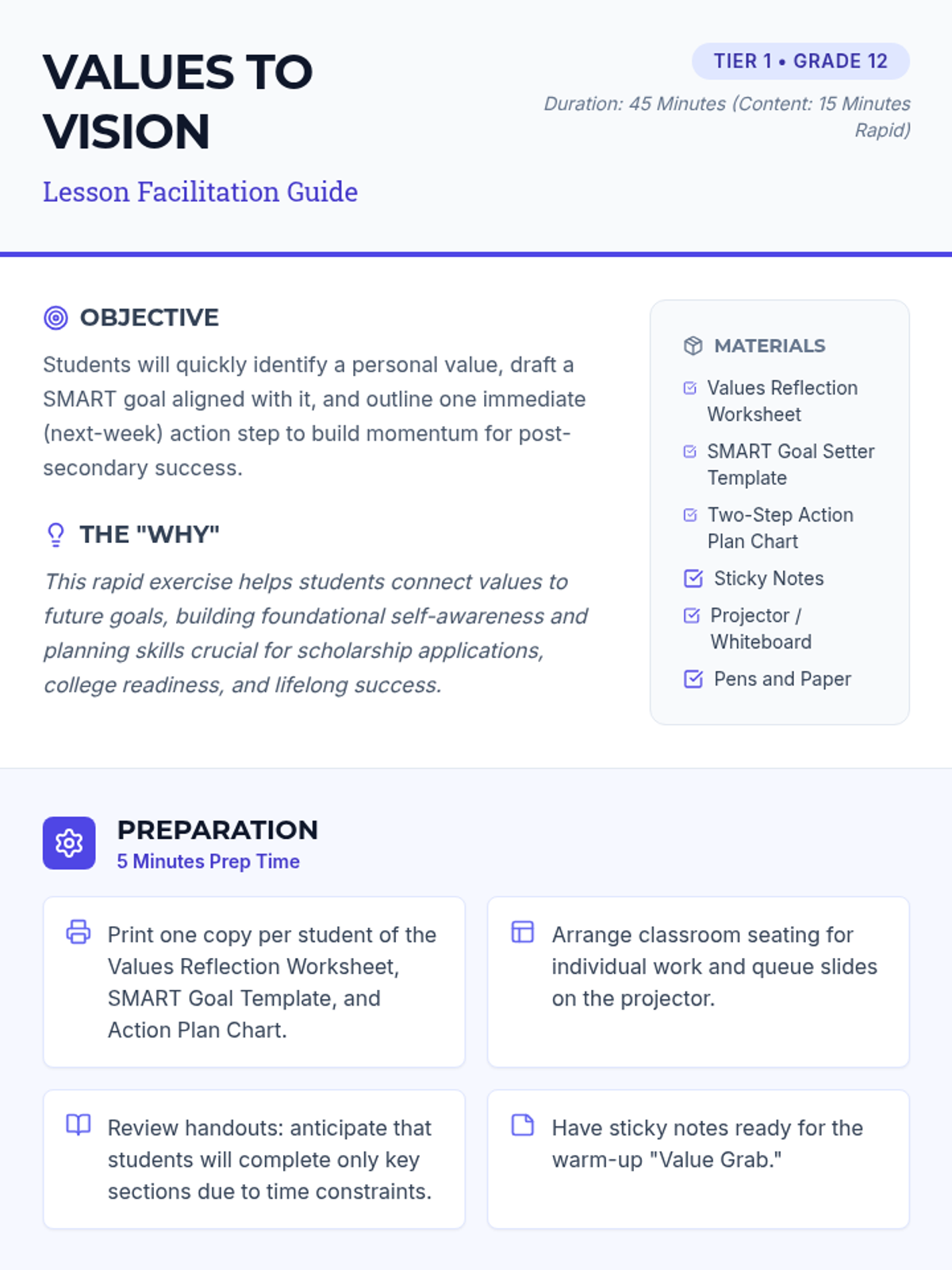 A high-impact Grade 12 lesson focused on aligning personal values with career goals through SMART goal setting and immediate action planning. Students connect their internal 'why' to concrete next steps for college and career readiness.