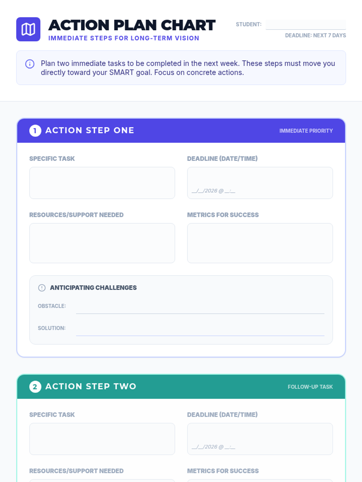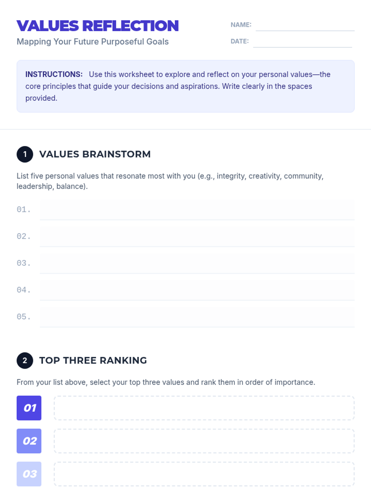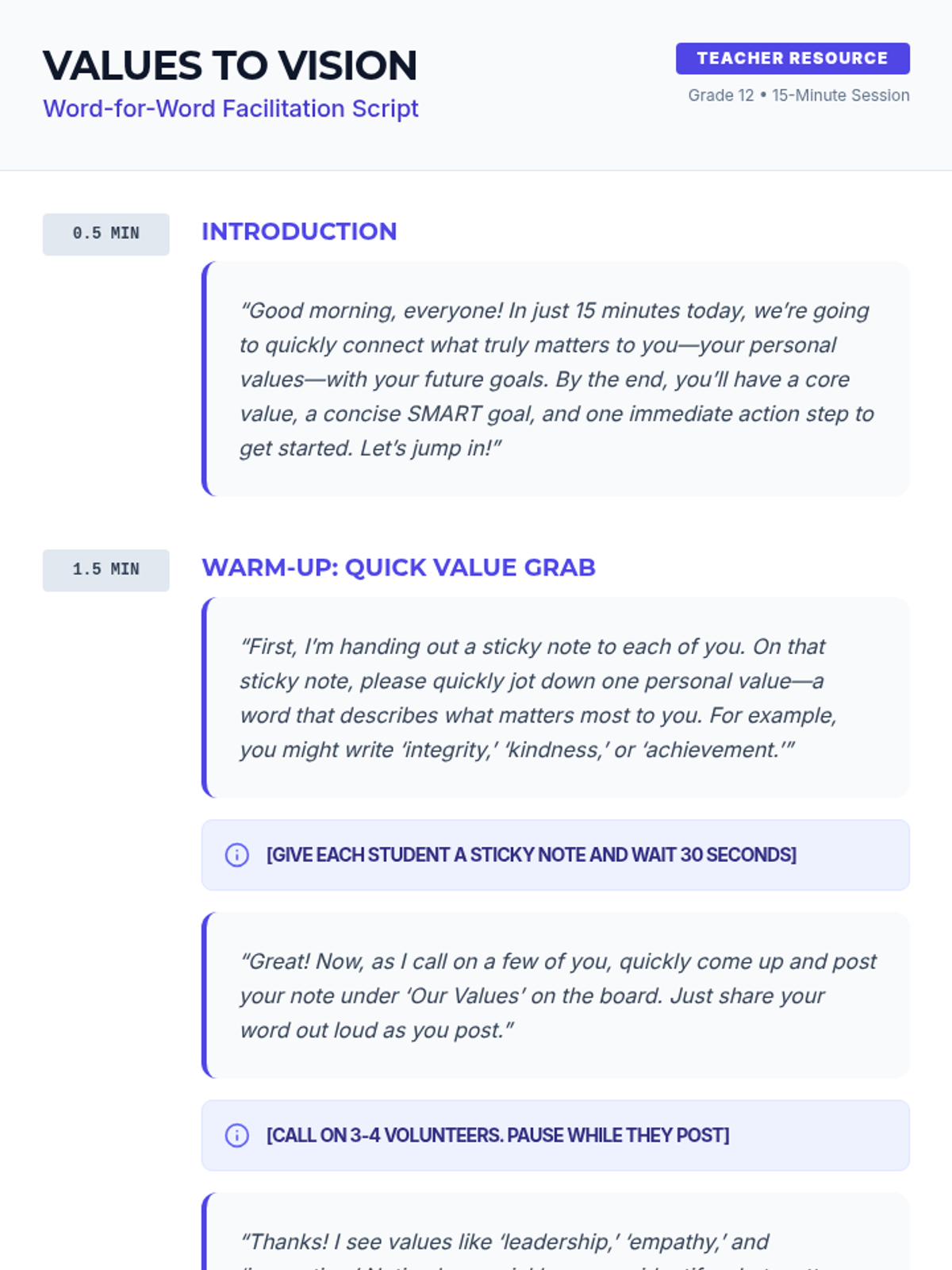 A high-impact Grade 12 lesson focused on aligning personal values with career goals through SMART goal setting and immediate action planning. Students connect their internal 'why' to concrete next steps for college and career readiness.