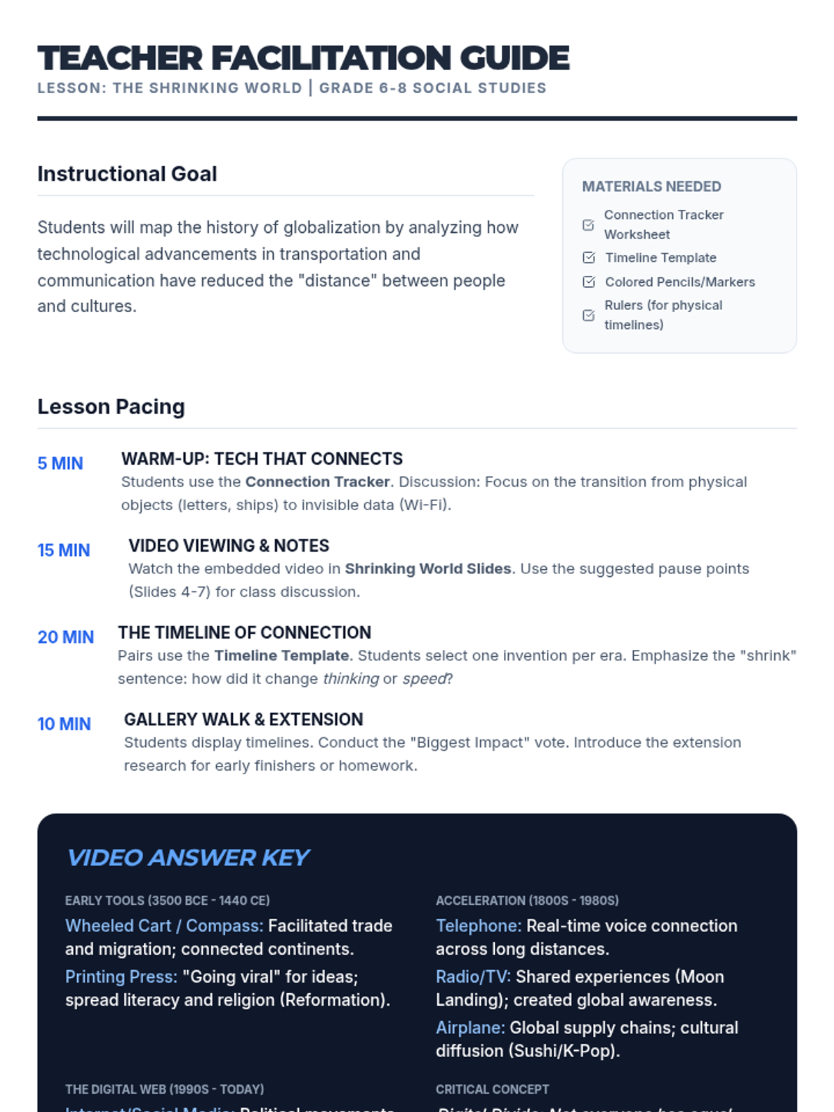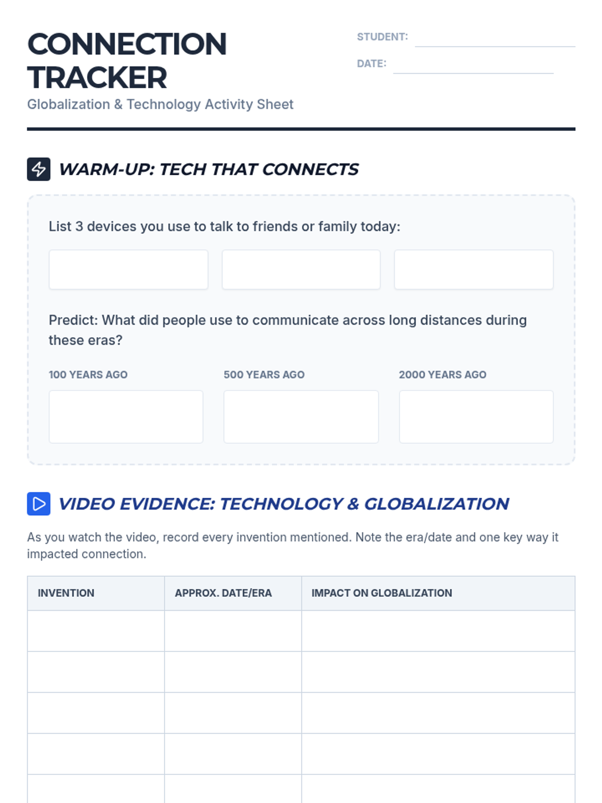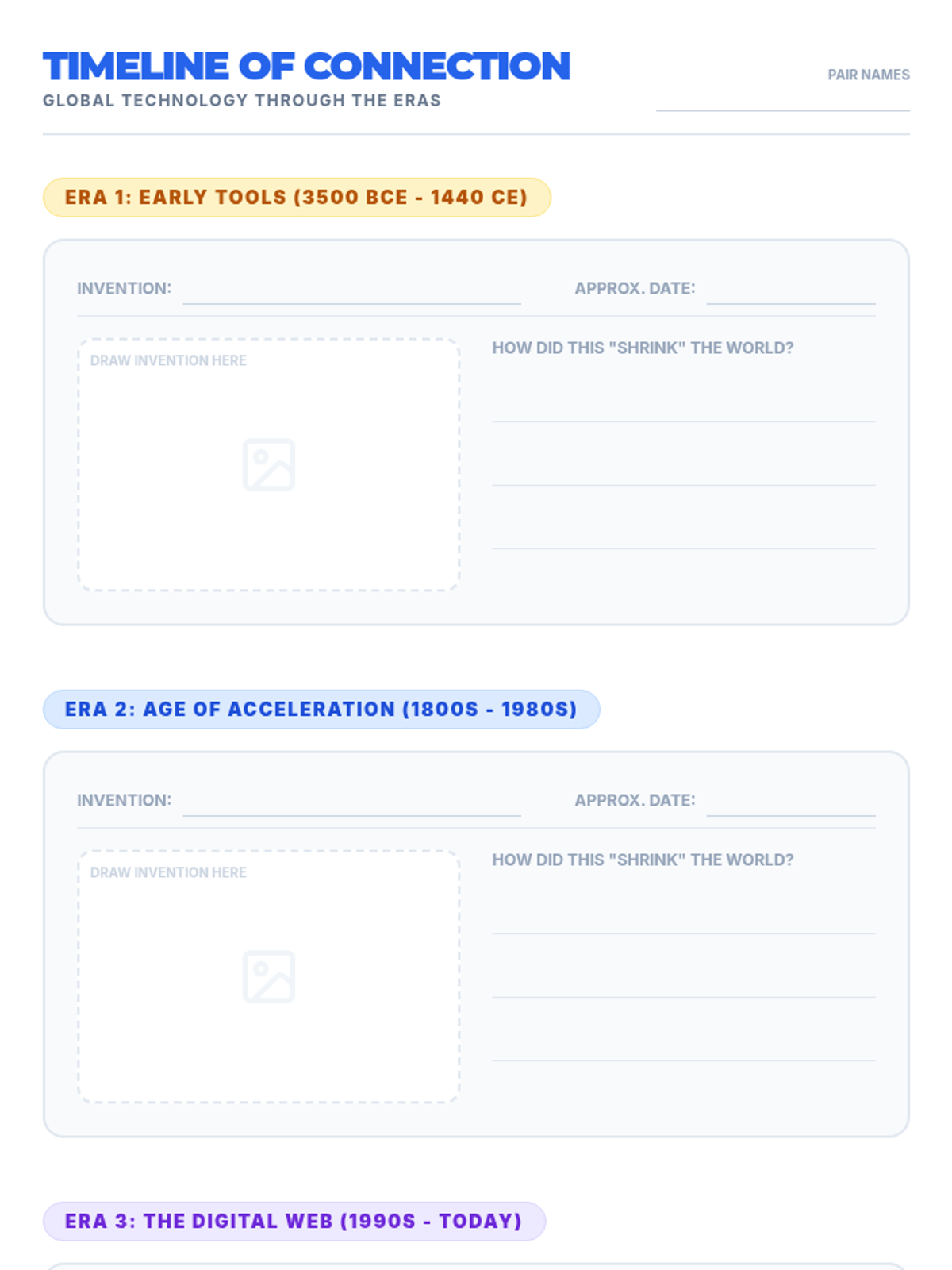 Students explore the history of globalization through technological advancement, mapping inventions from ancient wheels to modern social media and analyzing how these tools 'shrunk' the world.