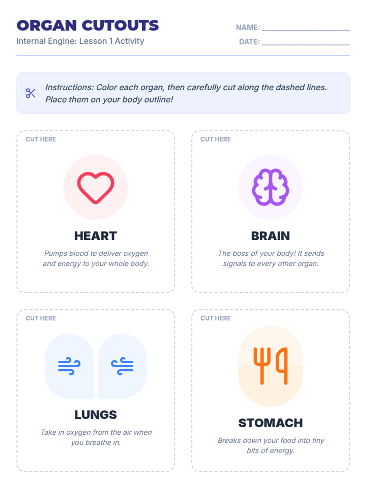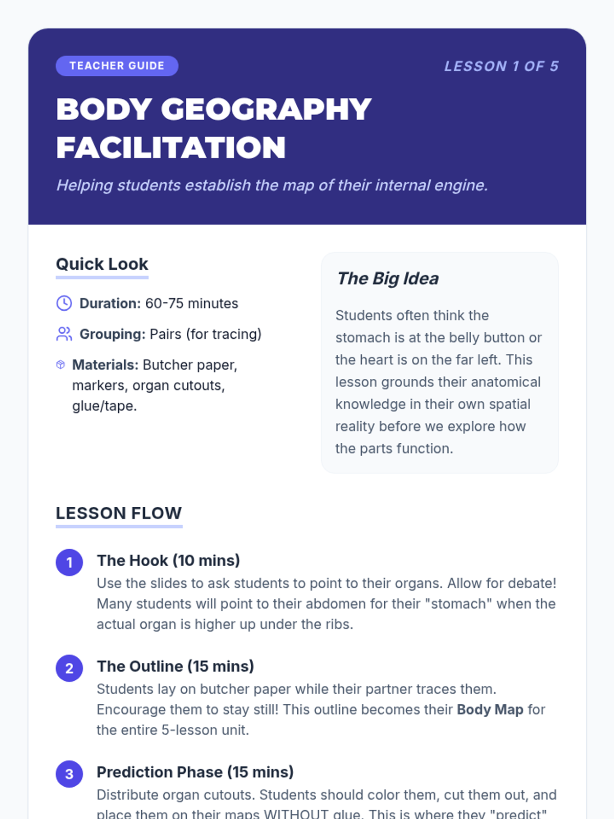 Students establish the geography of the human body by tracing their outlines and placing major organs, using a reference chart to correct their initial predictions.
