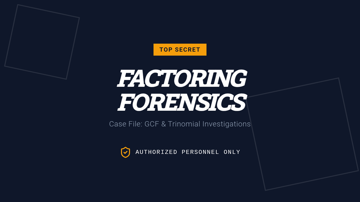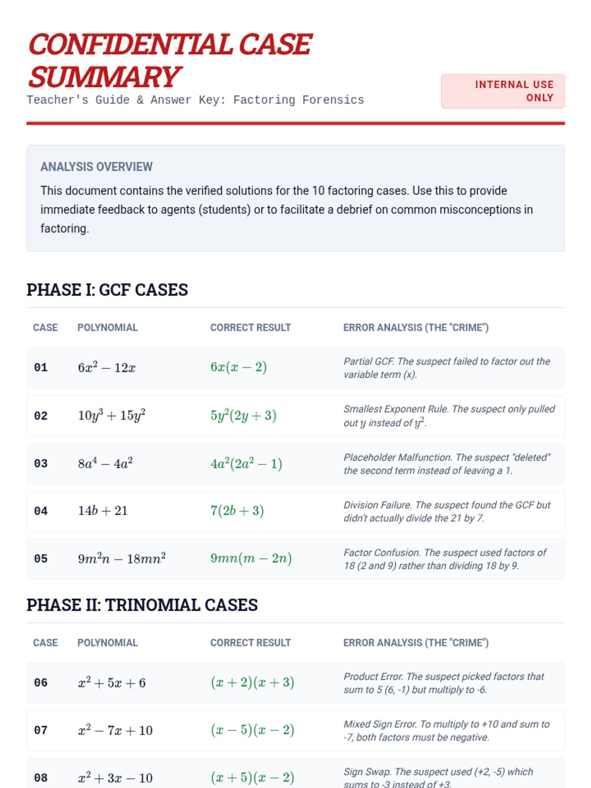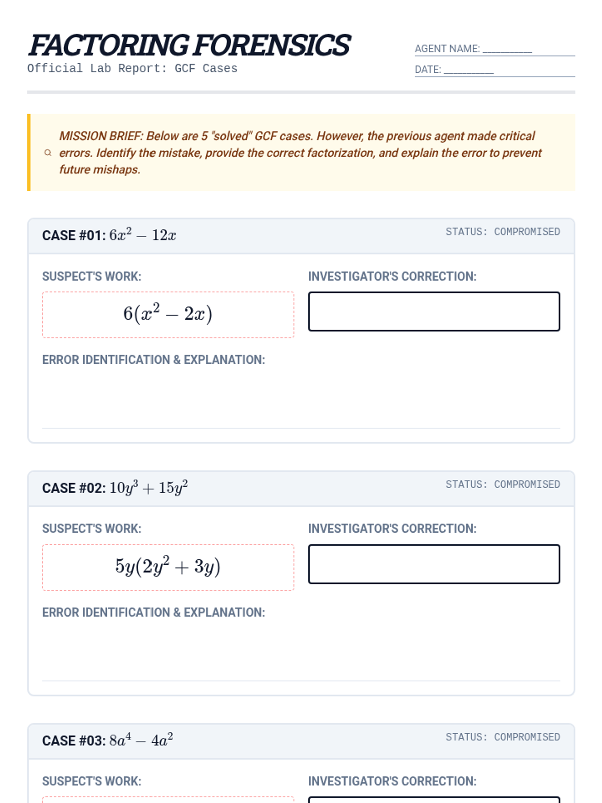 A lesson focused on identifying and correcting common mistakes in factoring, specifically GCF and basic trinomials. Students take on the role of 'Math Detectives' to solve factoring 'crimes'.
