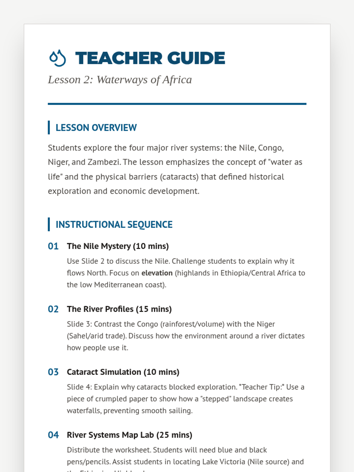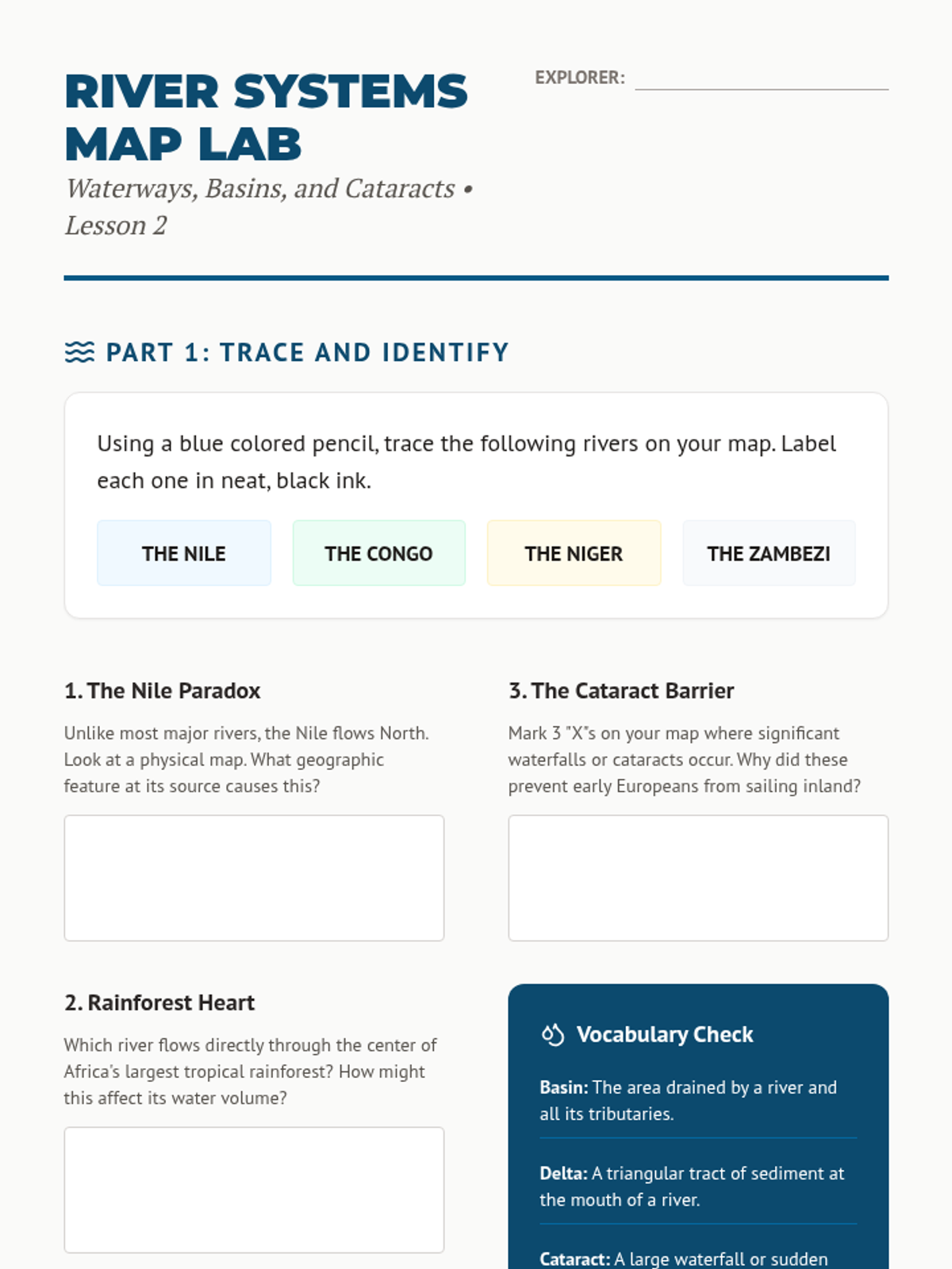 Focusing on the Nile, Congo, Niger, and Zambezi, students trace major rivers and analyze their impact on geography, trade, and exploration.
