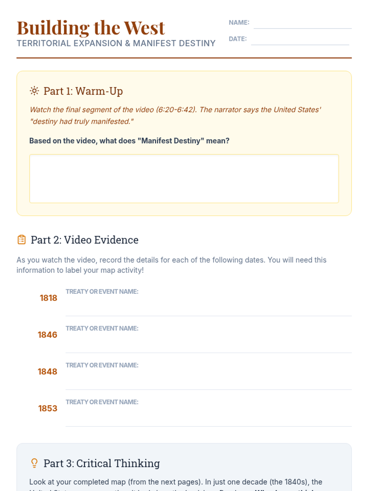 A comprehensive lesson exploring U.S. Westward Expansion and the concept of Manifest Destiny. Students watch a video, analyze key dates (1818, 1846, 1848, 1853), and construct a chronological map of territorial acquisitions to visualize the nation's rapid growth.