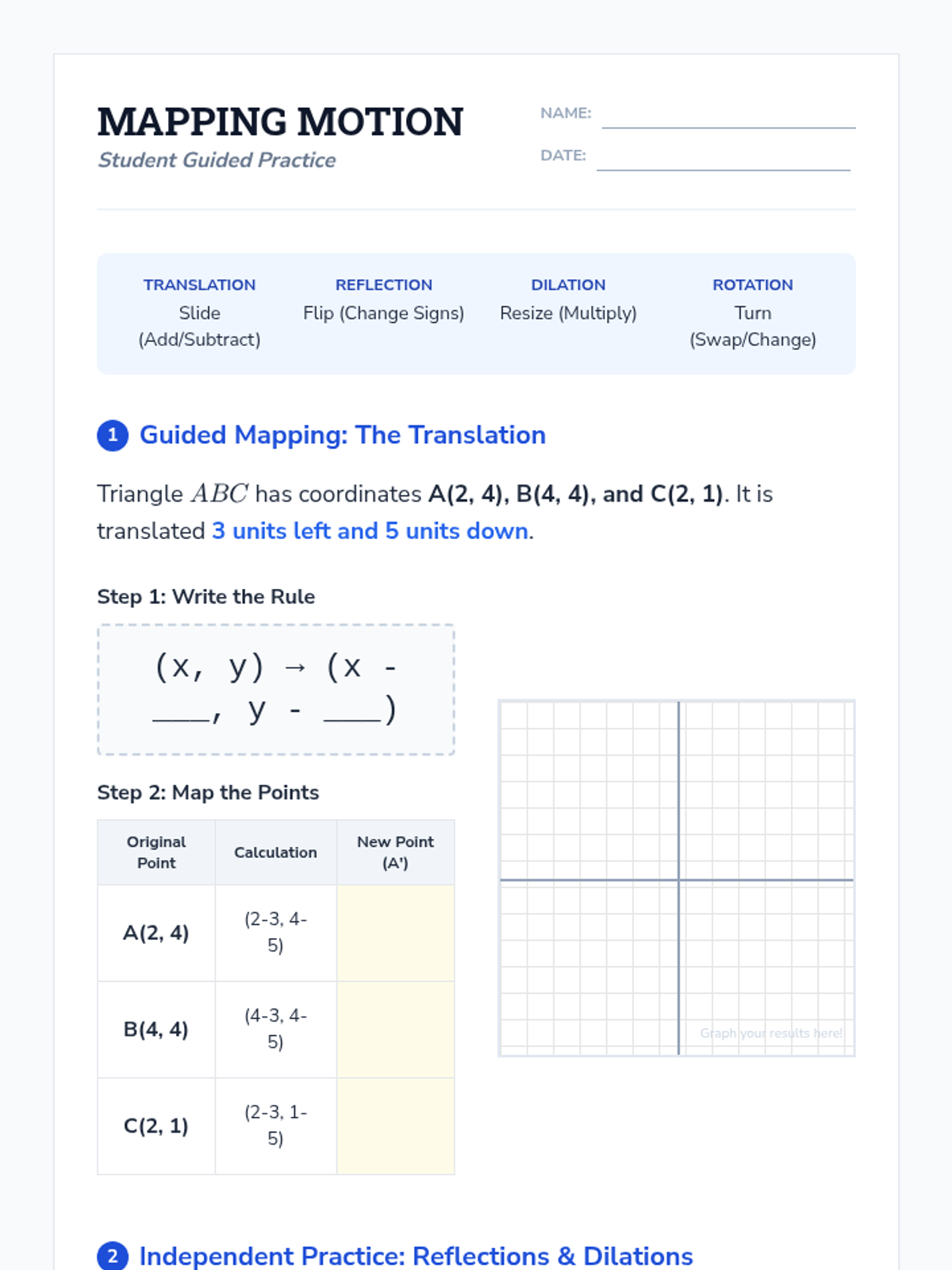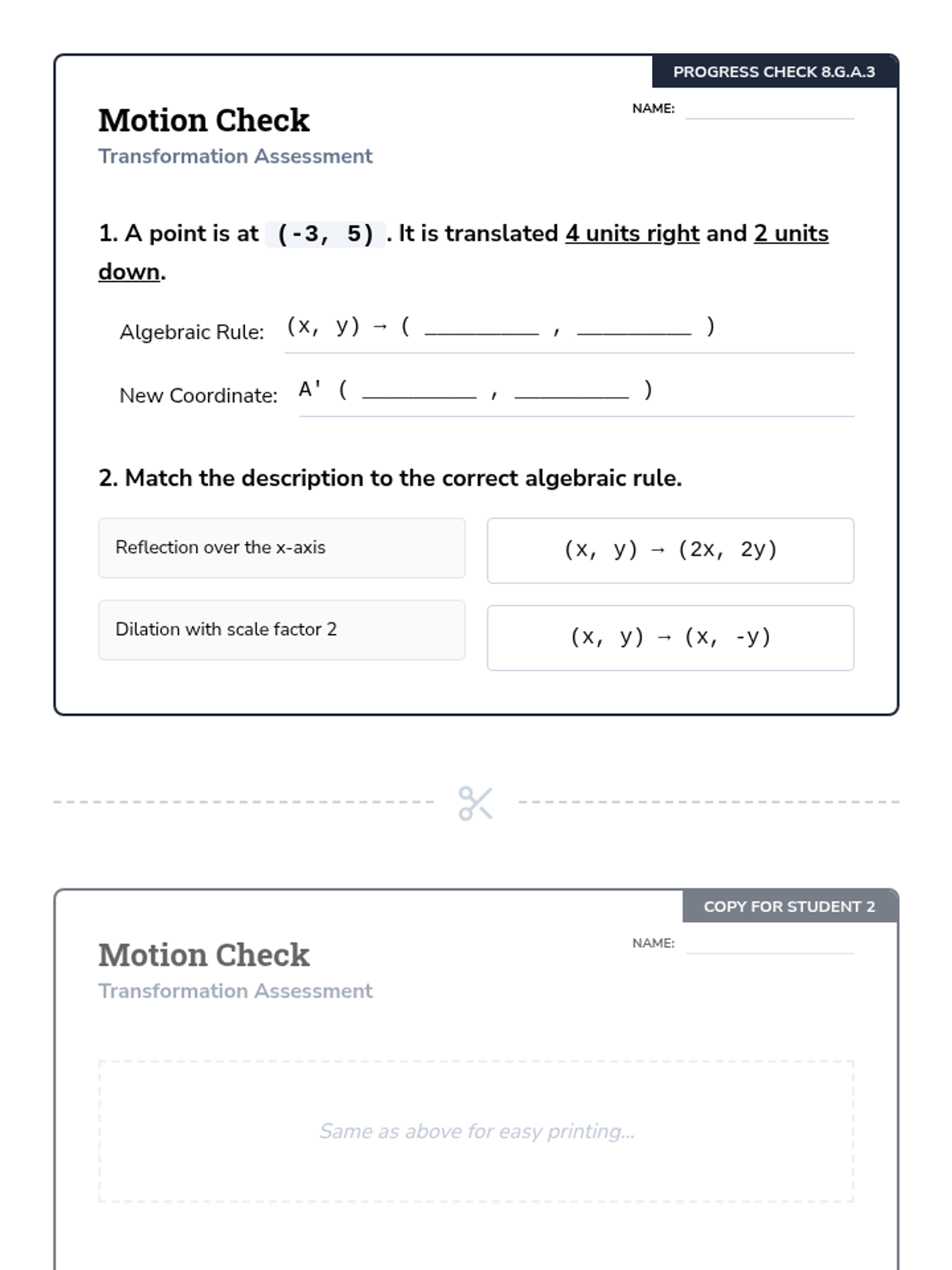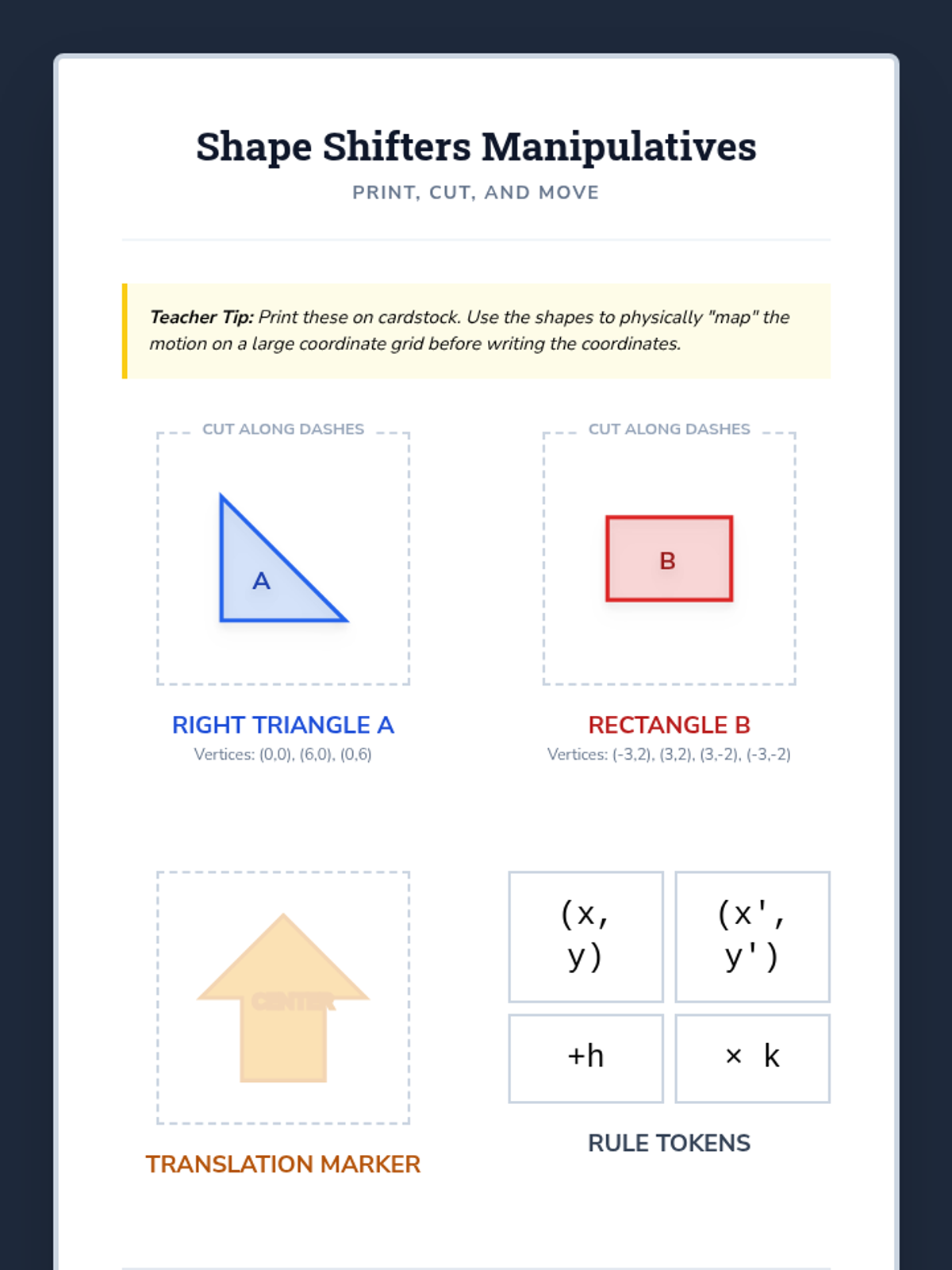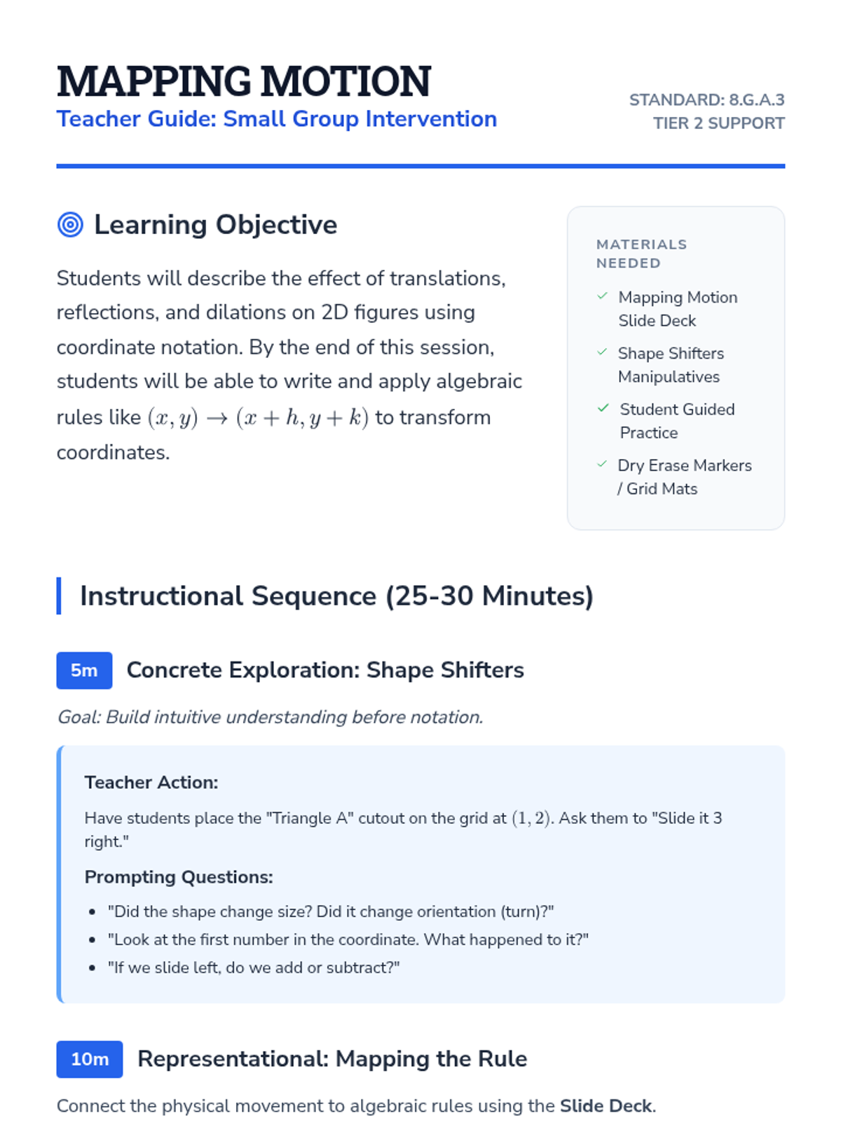 A targeted Tier 2 small group intervention lesson focused on describing the effects of transformations (dilations, translations, rotations, and reflections) on 2D figures using coordinate notation. Includes scaffolded instruction, hands-on manipulatives, and progress monitoring tools.