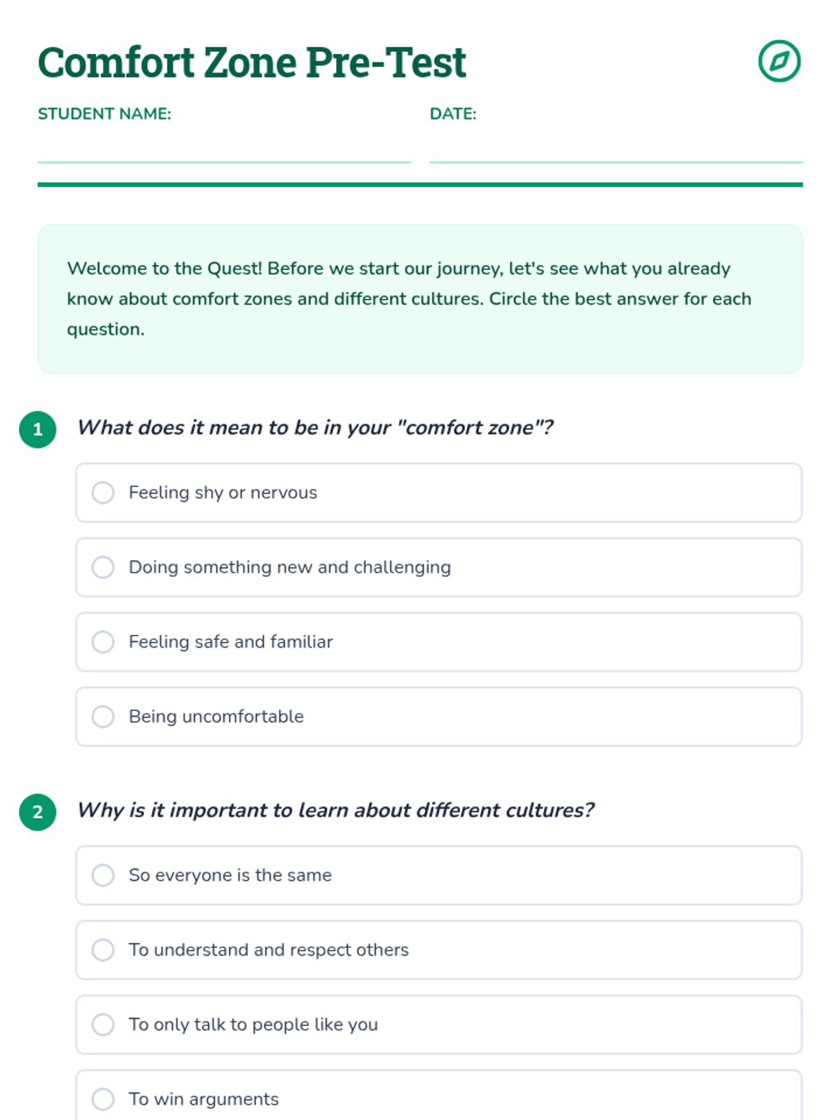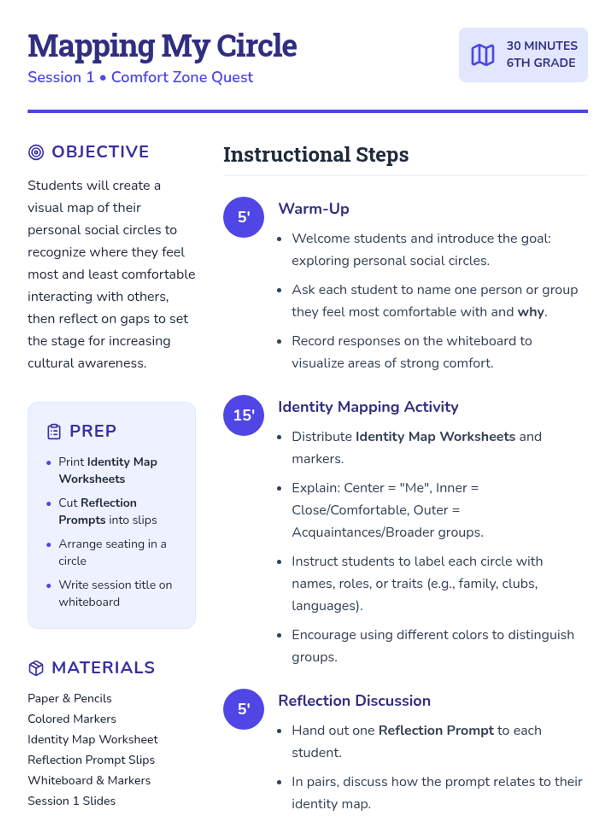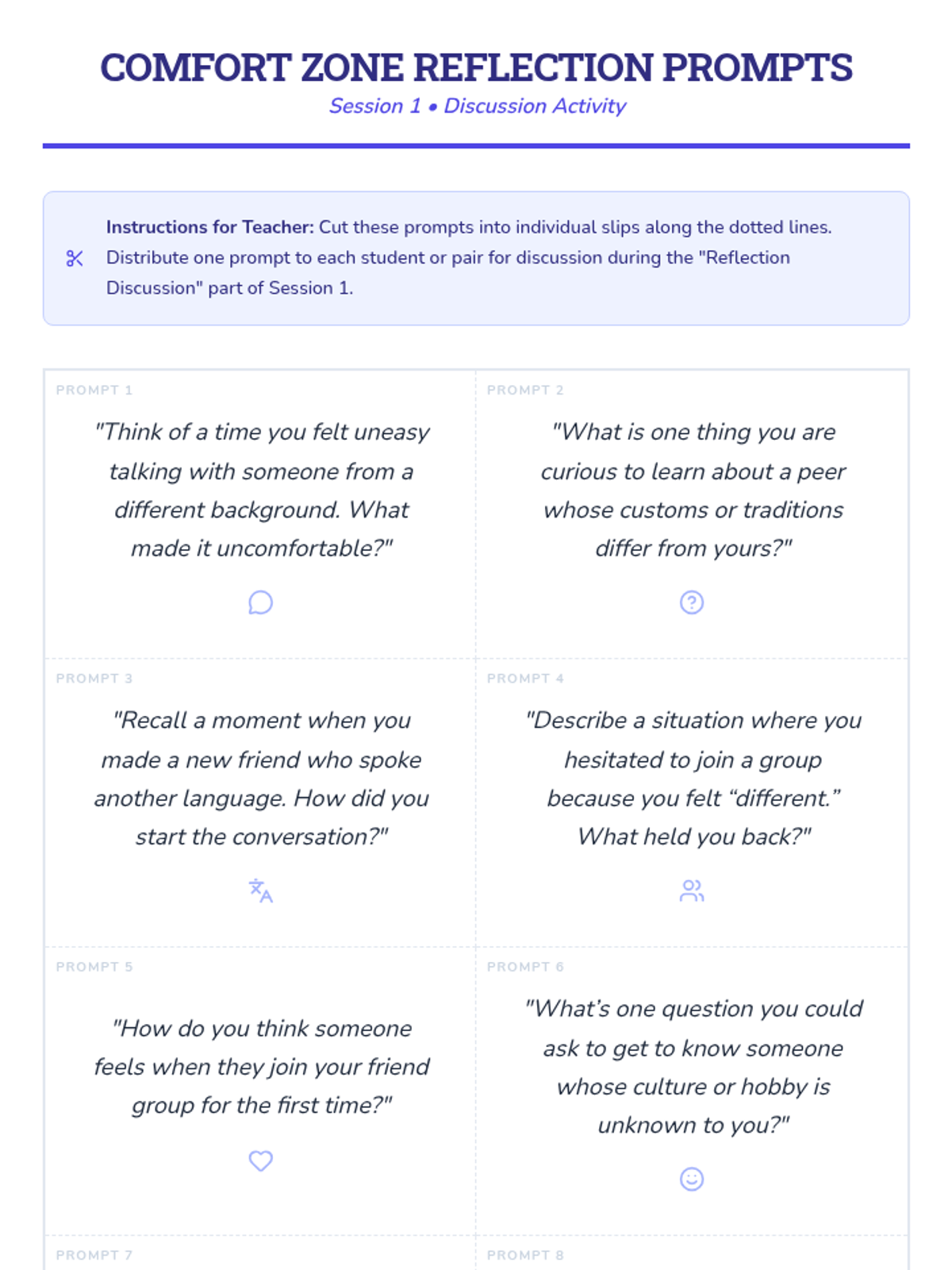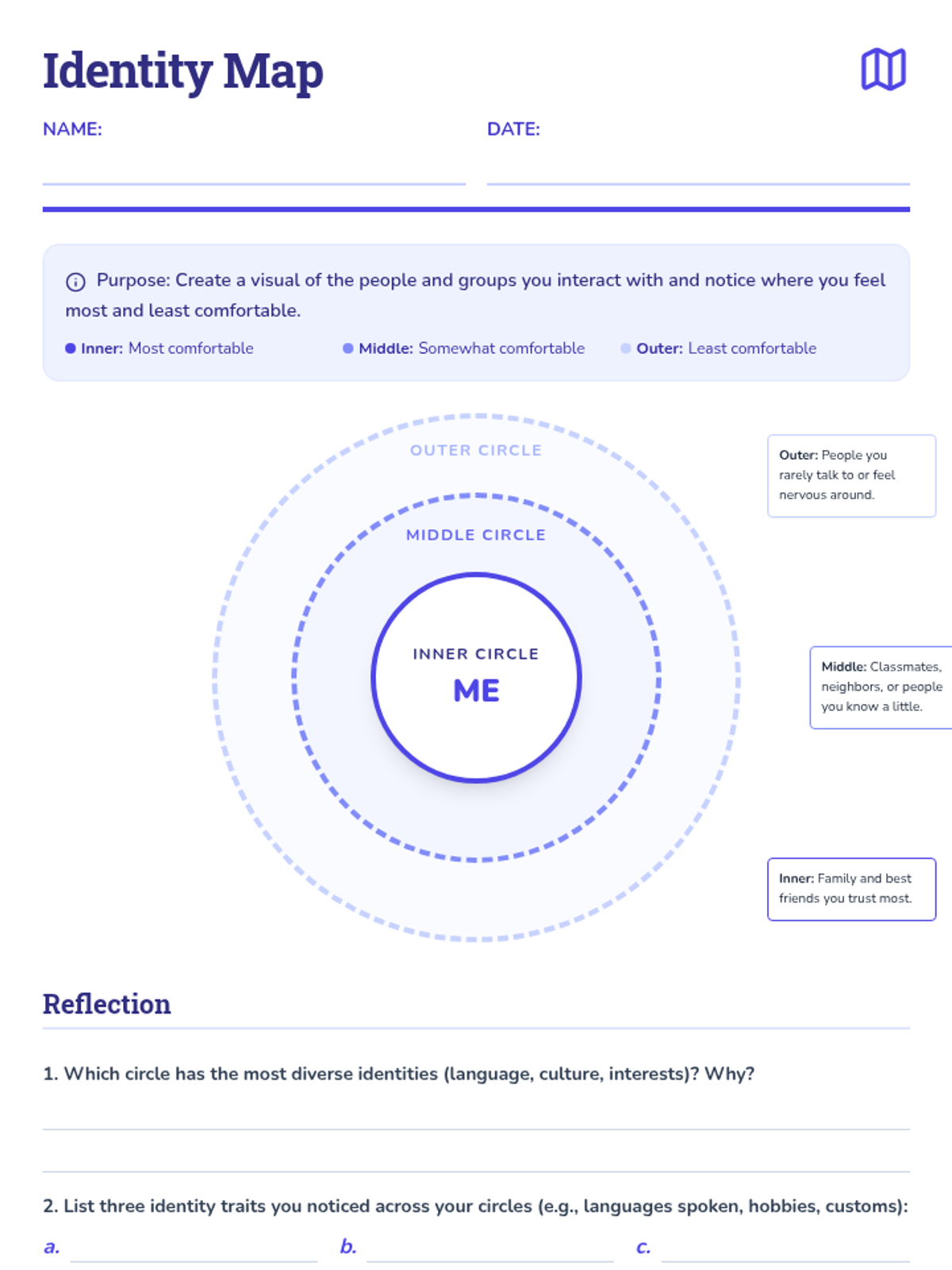 Students define comfort zones and create a visual map of their own social circles to identify areas for growth.