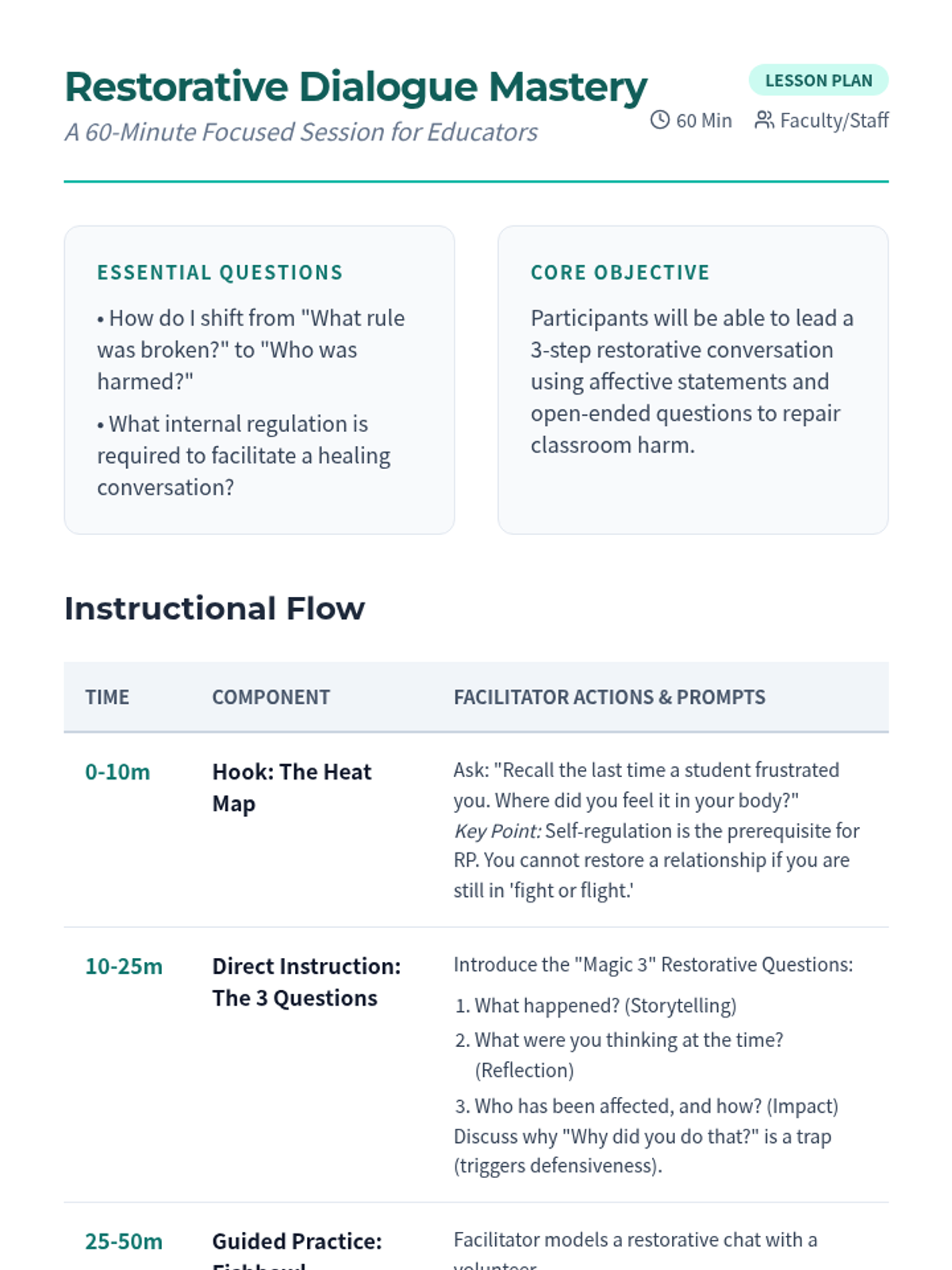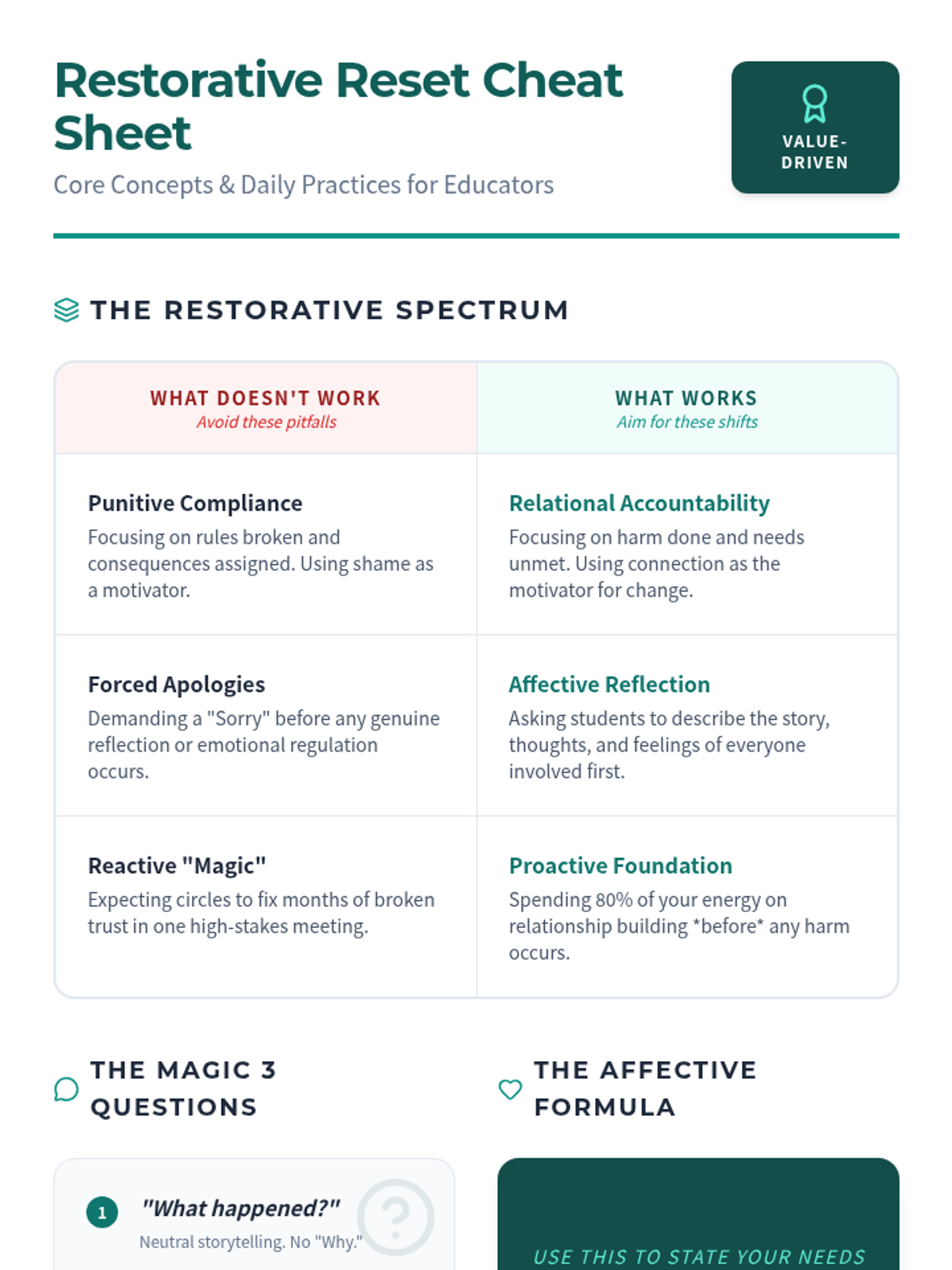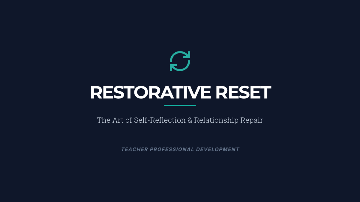 A professional development workshop for educators focused on deepening self-reflection and implementing effective restorative practices while identifying common pitfalls in school environments.