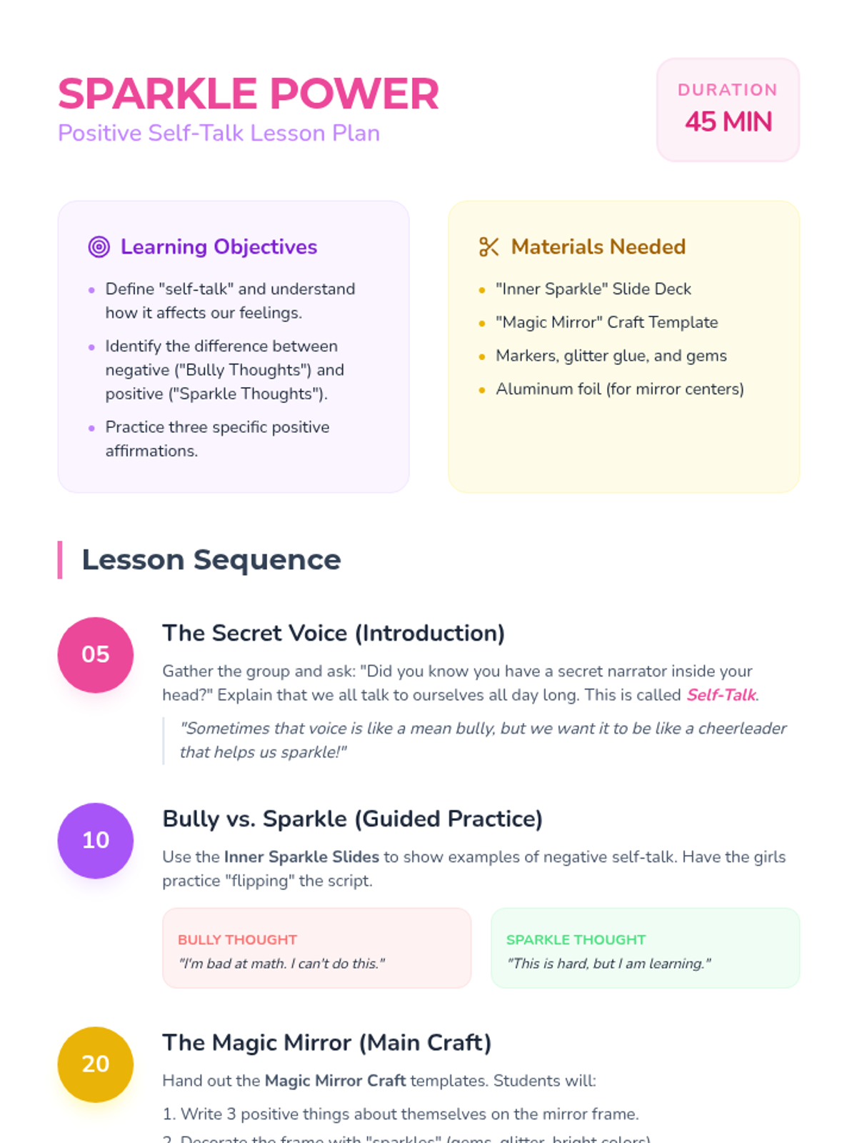 A social-emotional learning lesson for 2nd grade girls focused on identifying and practicing positive self-talk to build confidence and resilience. Students will learn the difference between 'bully thoughts' and 'sparkle thoughts' through interactive discussion and a creative mirror craft.