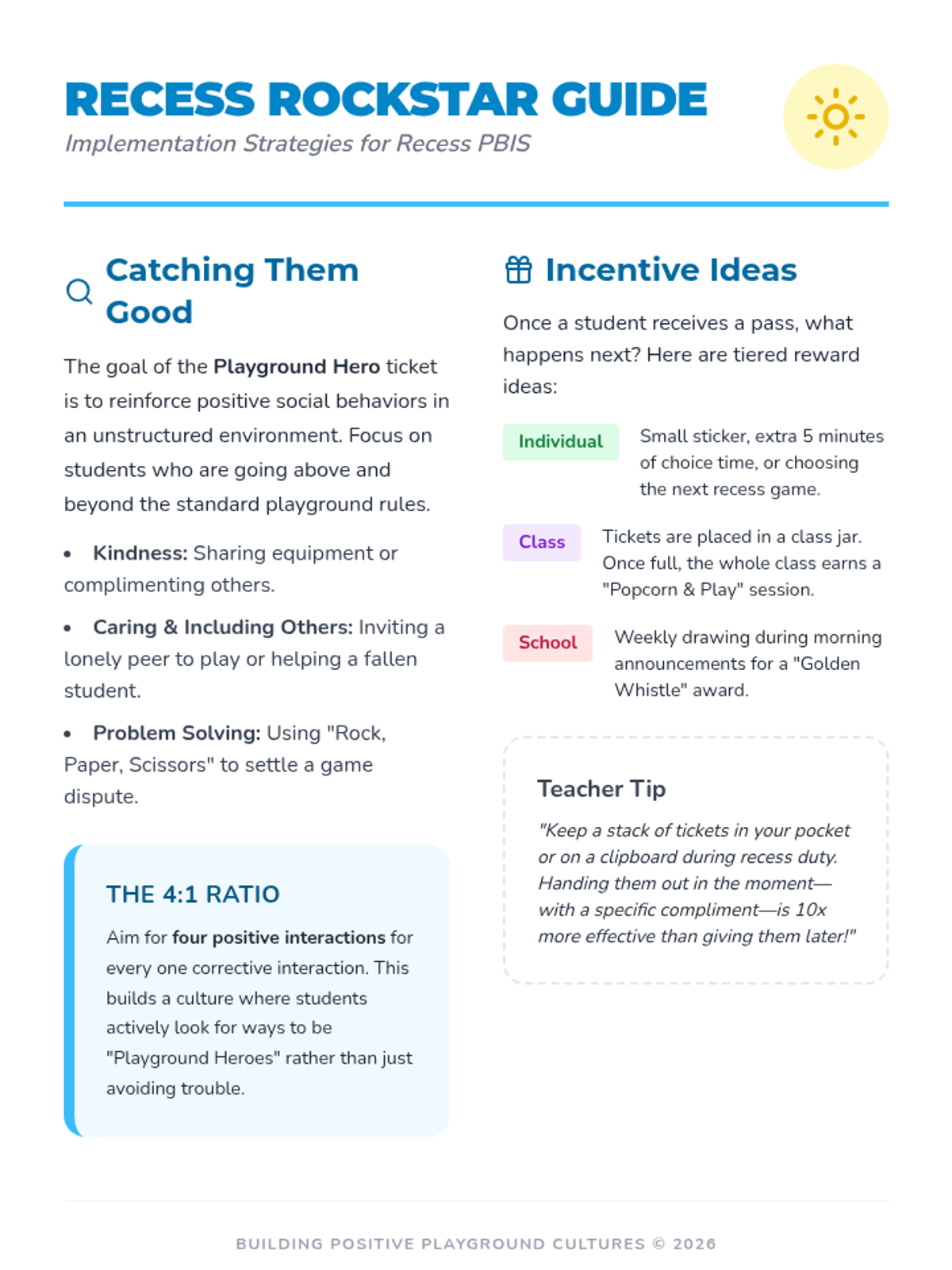 A PBIS-focused lesson set designed to promote positive behavior during recess, including printable incentive tickets and a guide for consistent implementation by school staff.