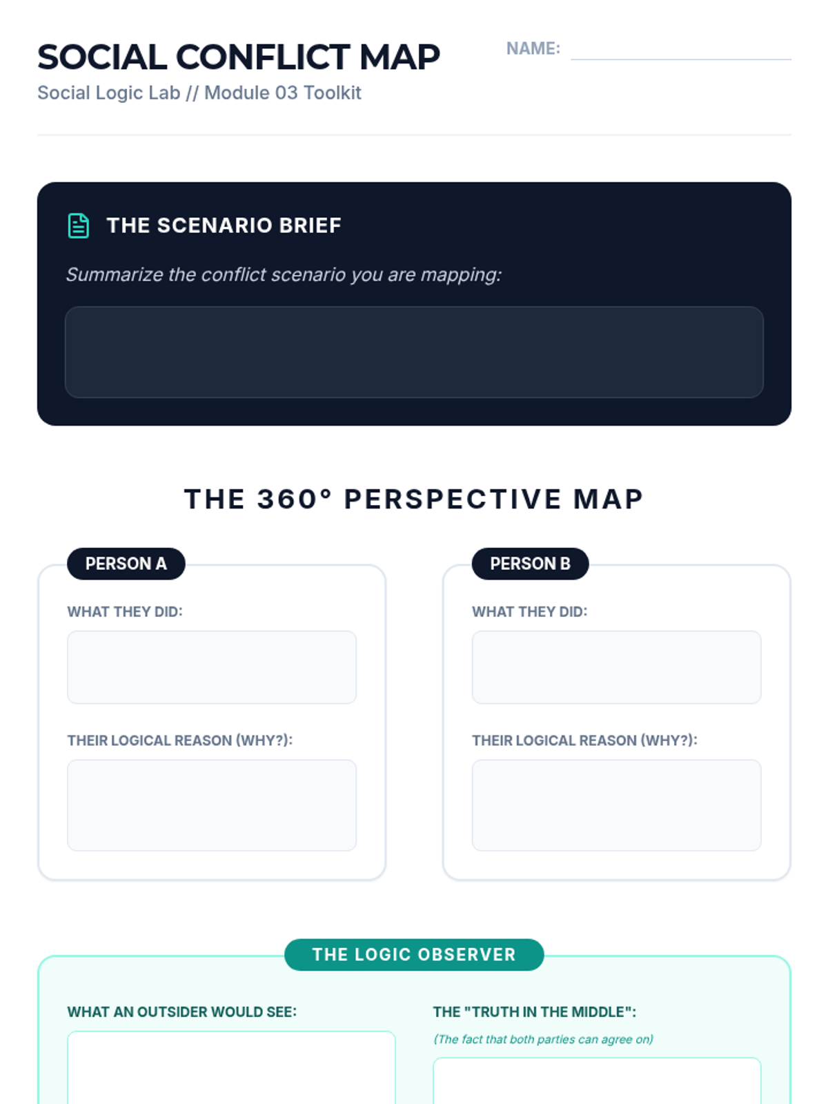 Uses a 'conflict map' graphic organizer to break down social events from multiple viewpoints, moving beyond binary 'good guy/bad guy' thinking.