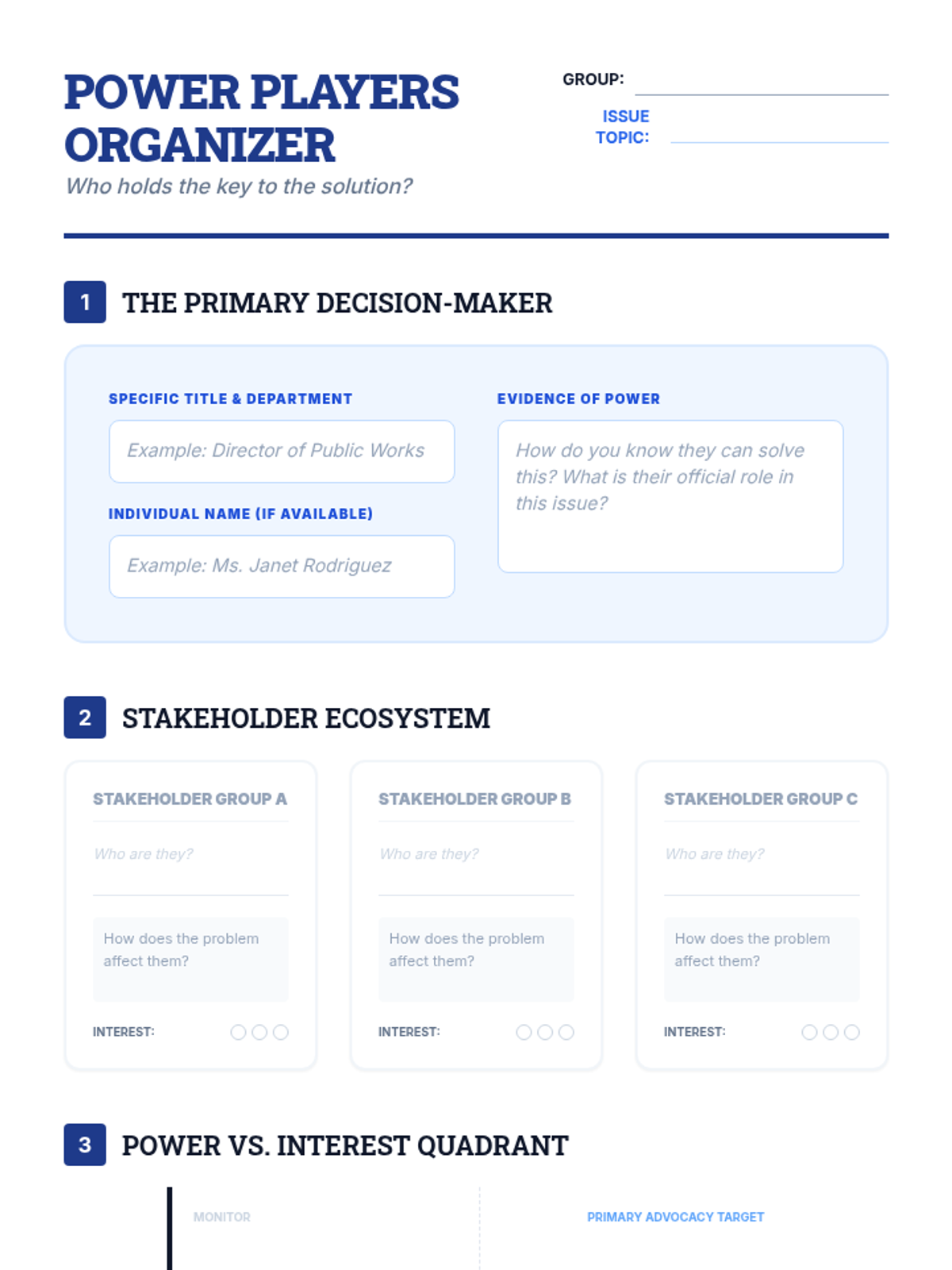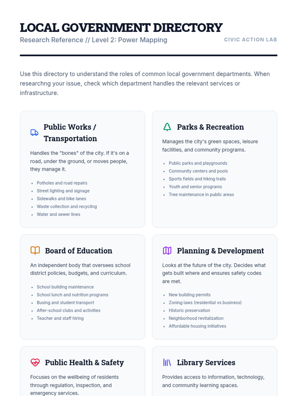 Students research local government structures to identify decision-makers and stakeholders related to their chosen issues, participating in a matching game to connect community problems with the correct government departments.