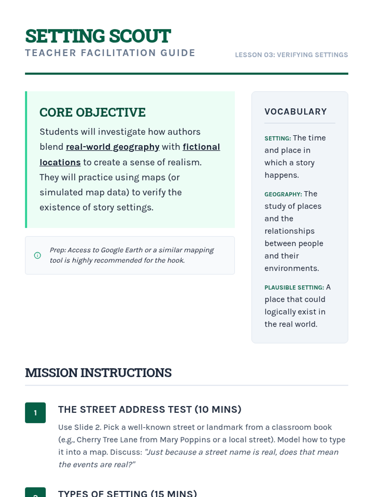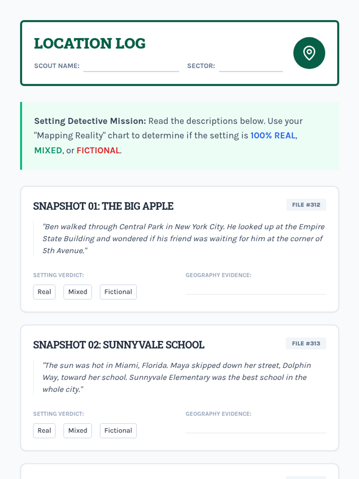 Students investigate story settings to see if they exist in the real world and discuss why authors blend real geography with fiction.