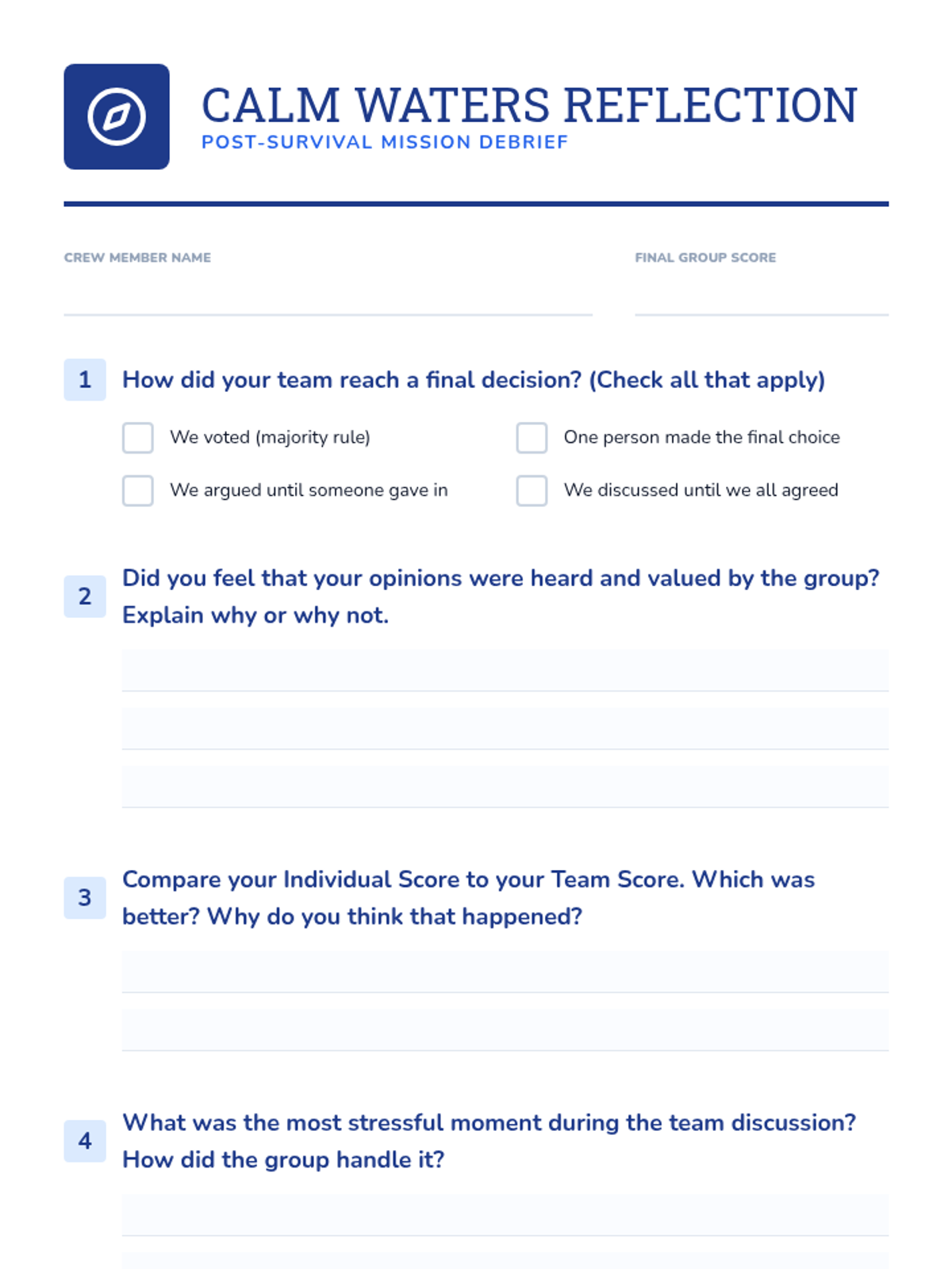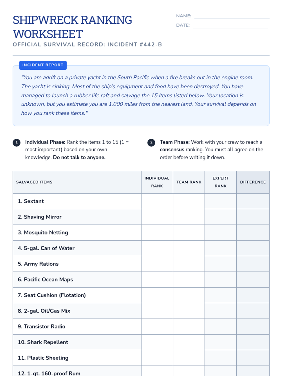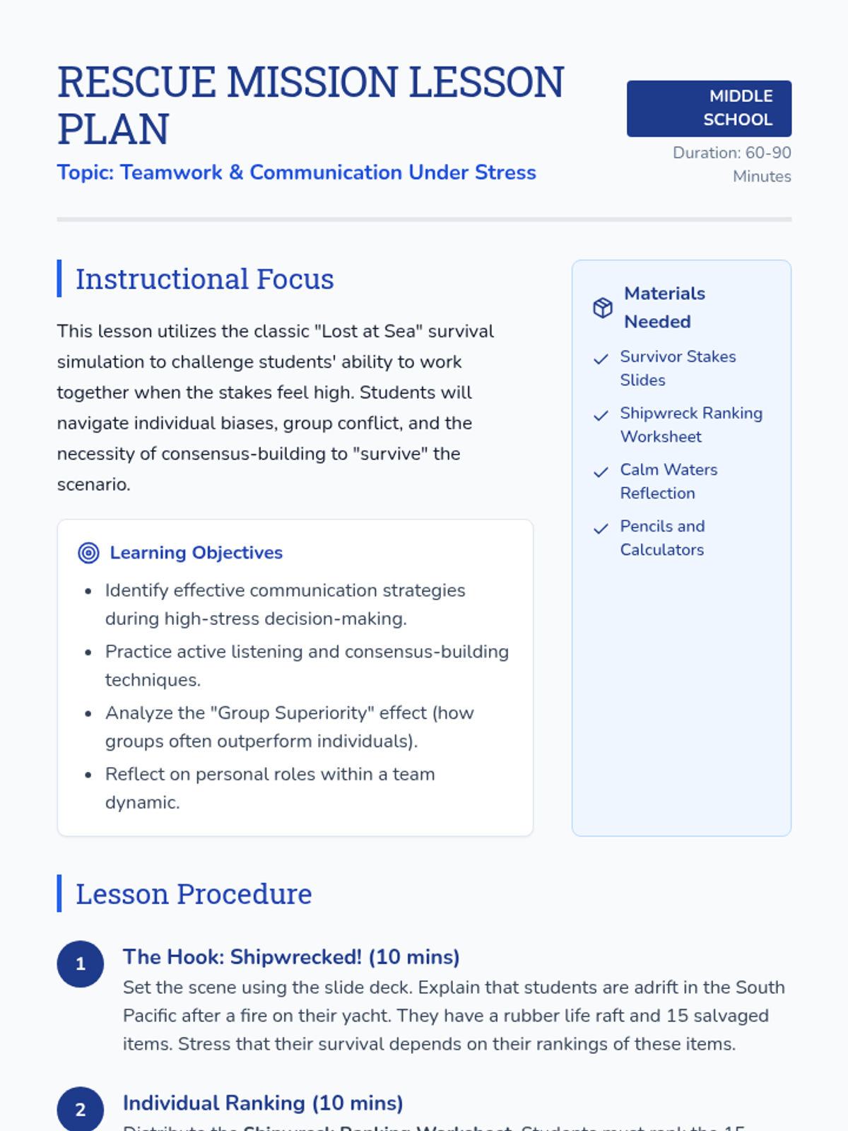 A comprehensive lesson focused on teamwork, consensus-building, and communication under stress using a classic maritime survival scenario. Students must collaborate to rank items for survival after a shipwreck.