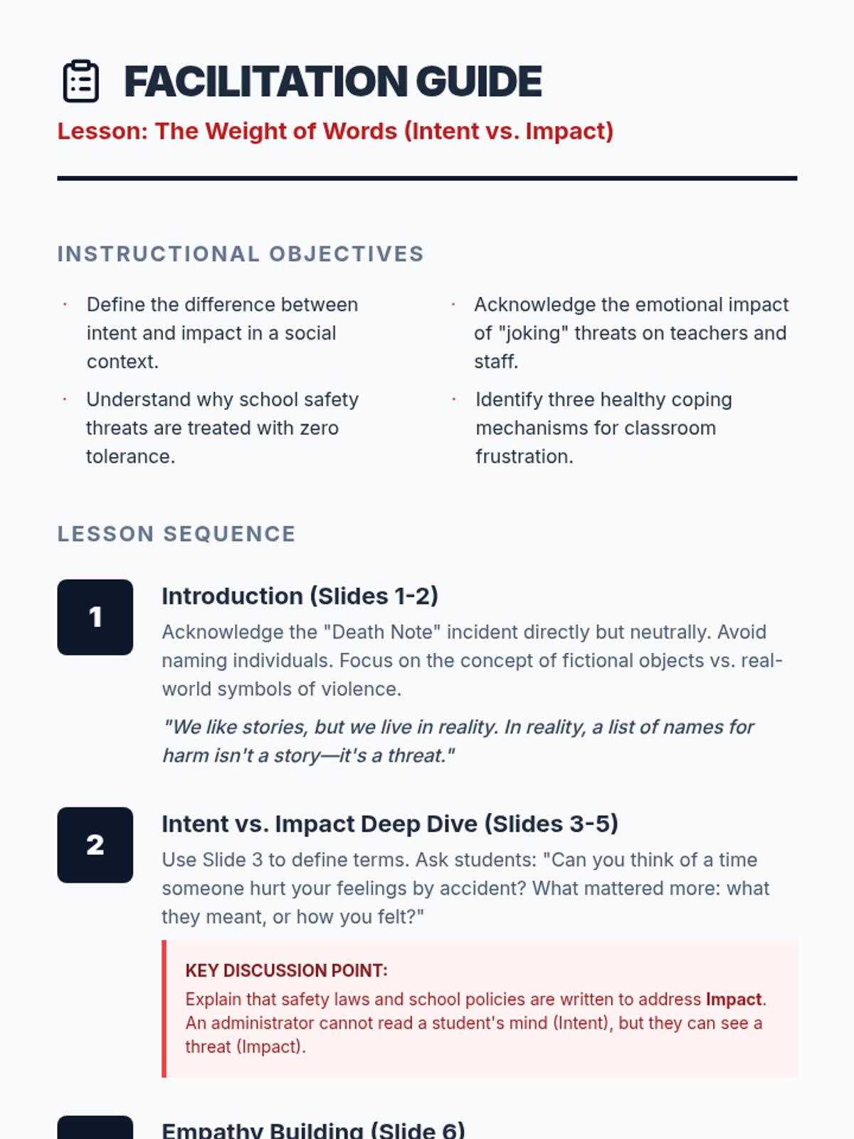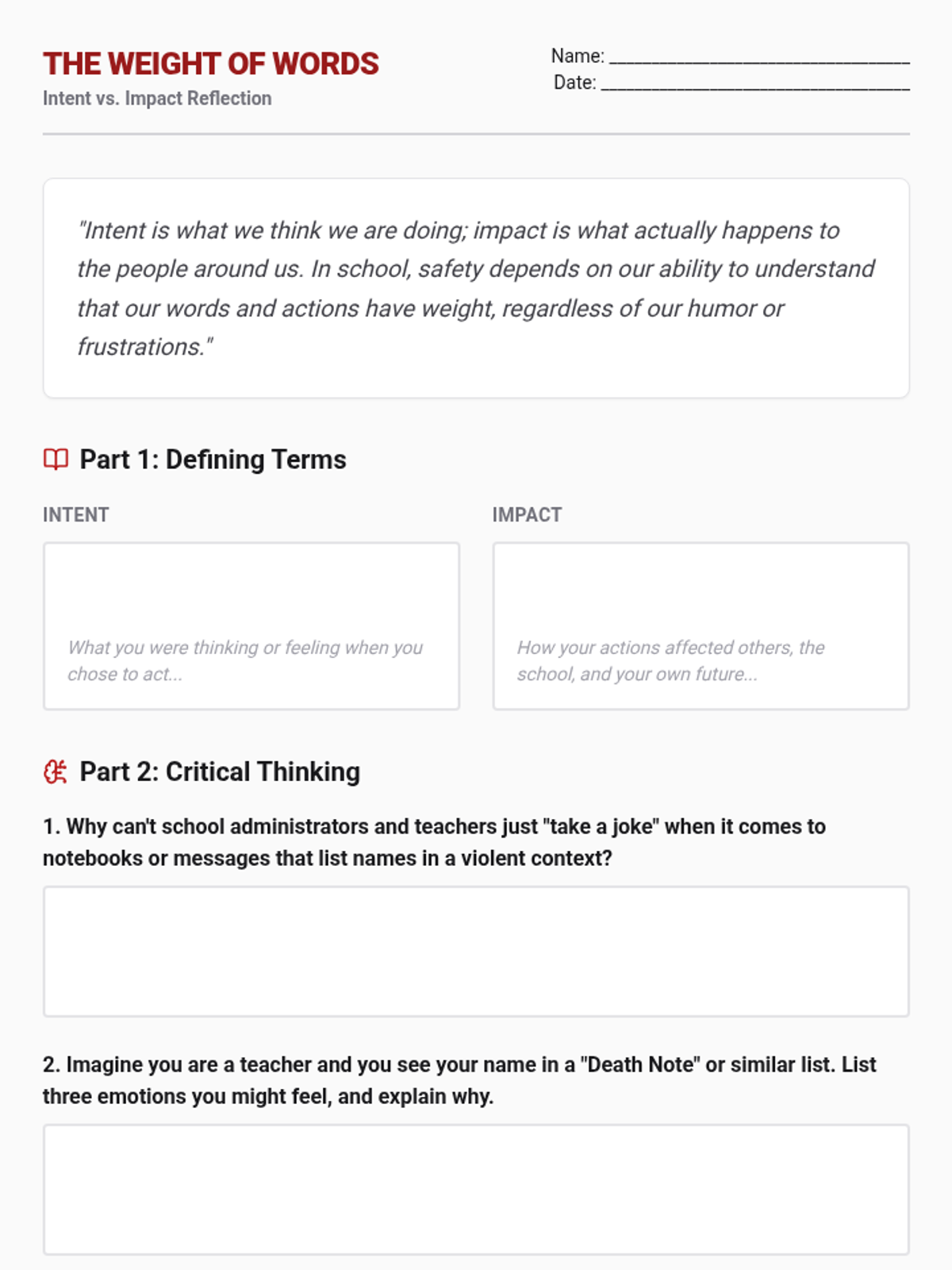A psychoeducation lesson designed to address the severity of school threats following a 'Death Note' incident, focusing on the critical difference between intent and impact.