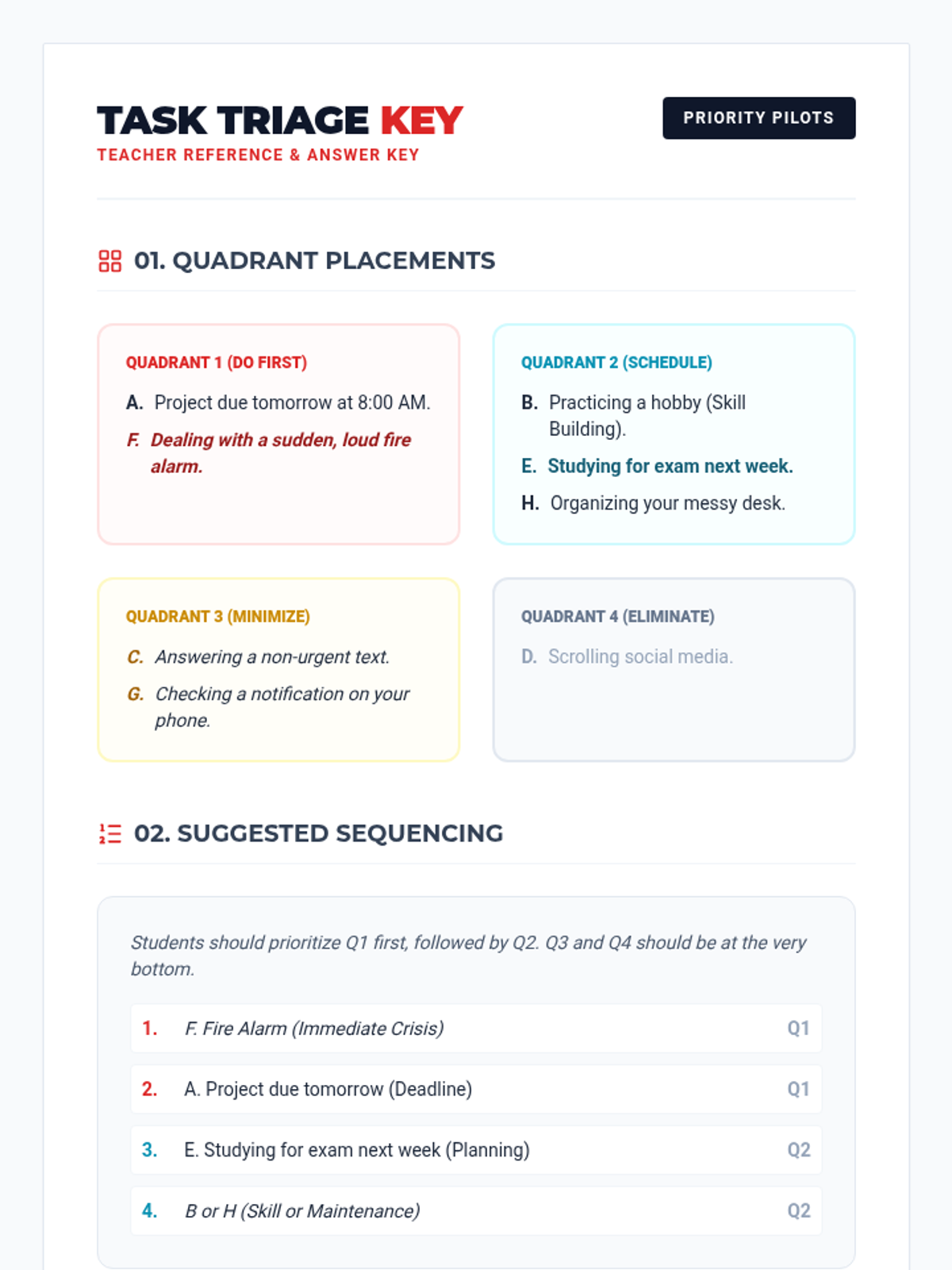 A comprehensive lesson on task prioritization where students learn to distinguish between urgent and important tasks and use a matrix to sequence their daily activities.