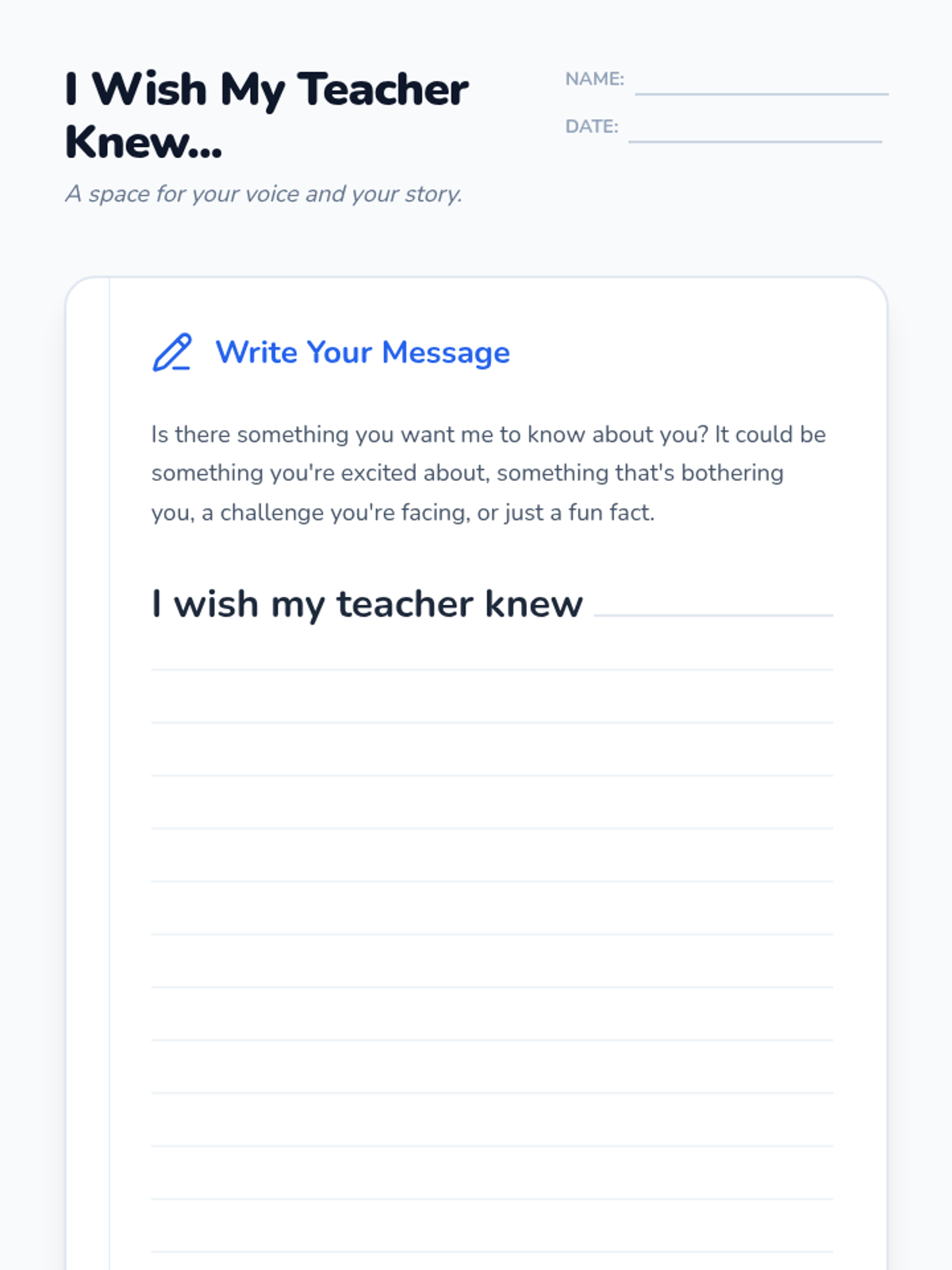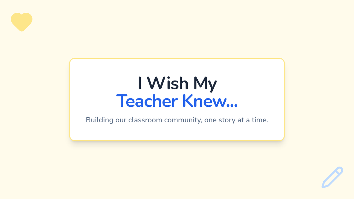 A short, impactful community-building lesson based on the "I Wish My Teacher Knew" project. Students share personal insights, needs, or stories with their teacher to build trust, empathy, and a stronger classroom community.