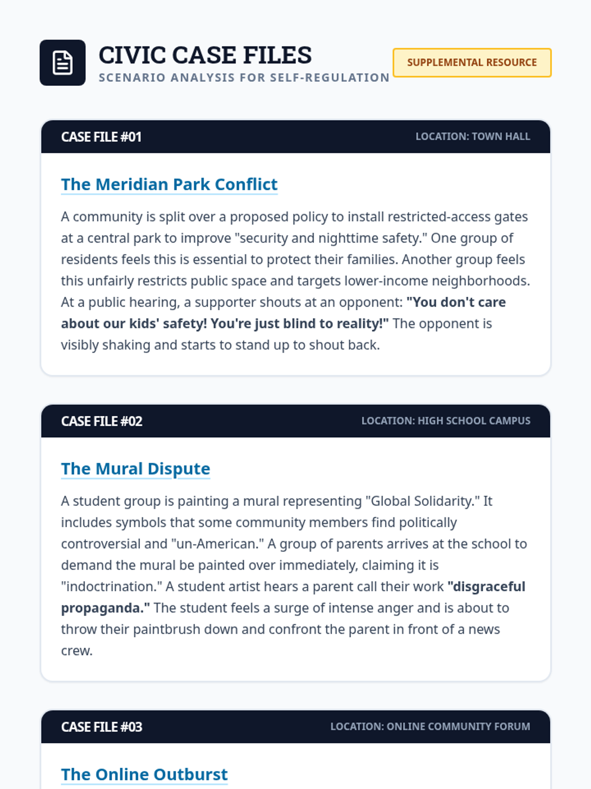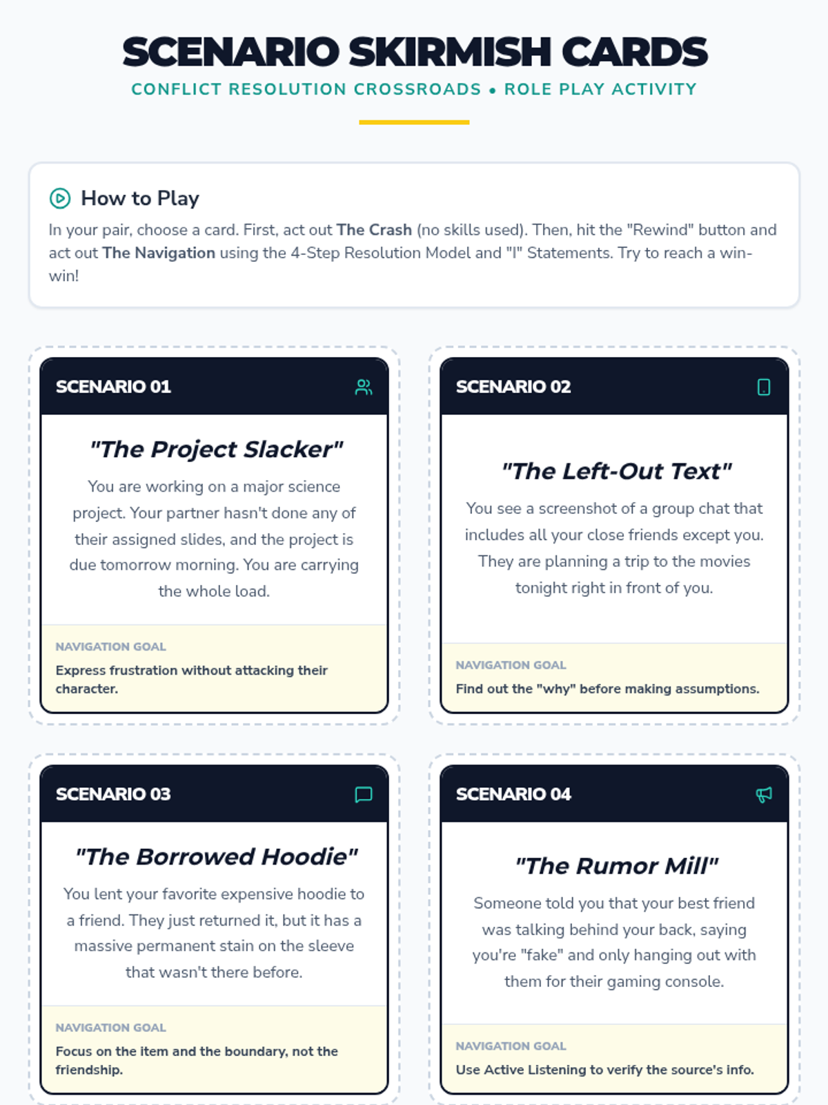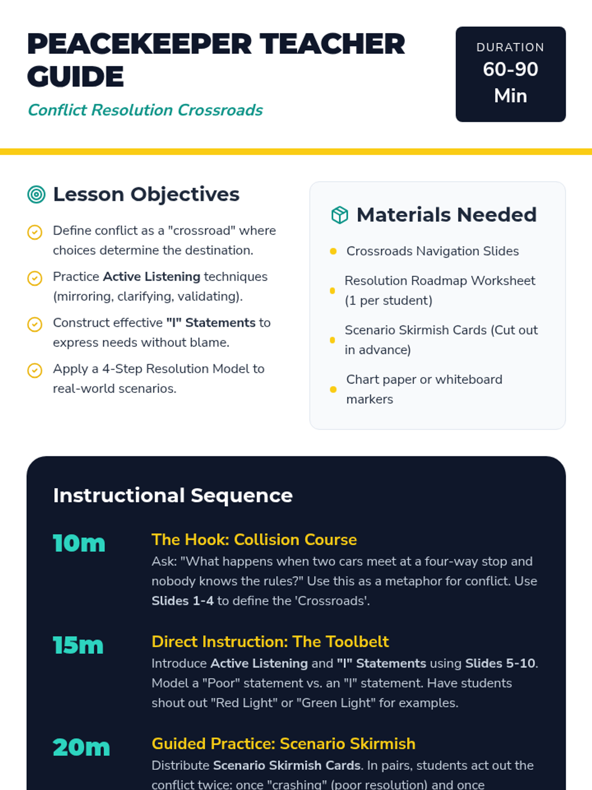 A comprehensive lesson for middle and high school students to master conflict resolution through a structured resolution model, active listening, and role-playing scenarios. Students learn to navigate 'conflict crossroads' using empathy and clear communication.