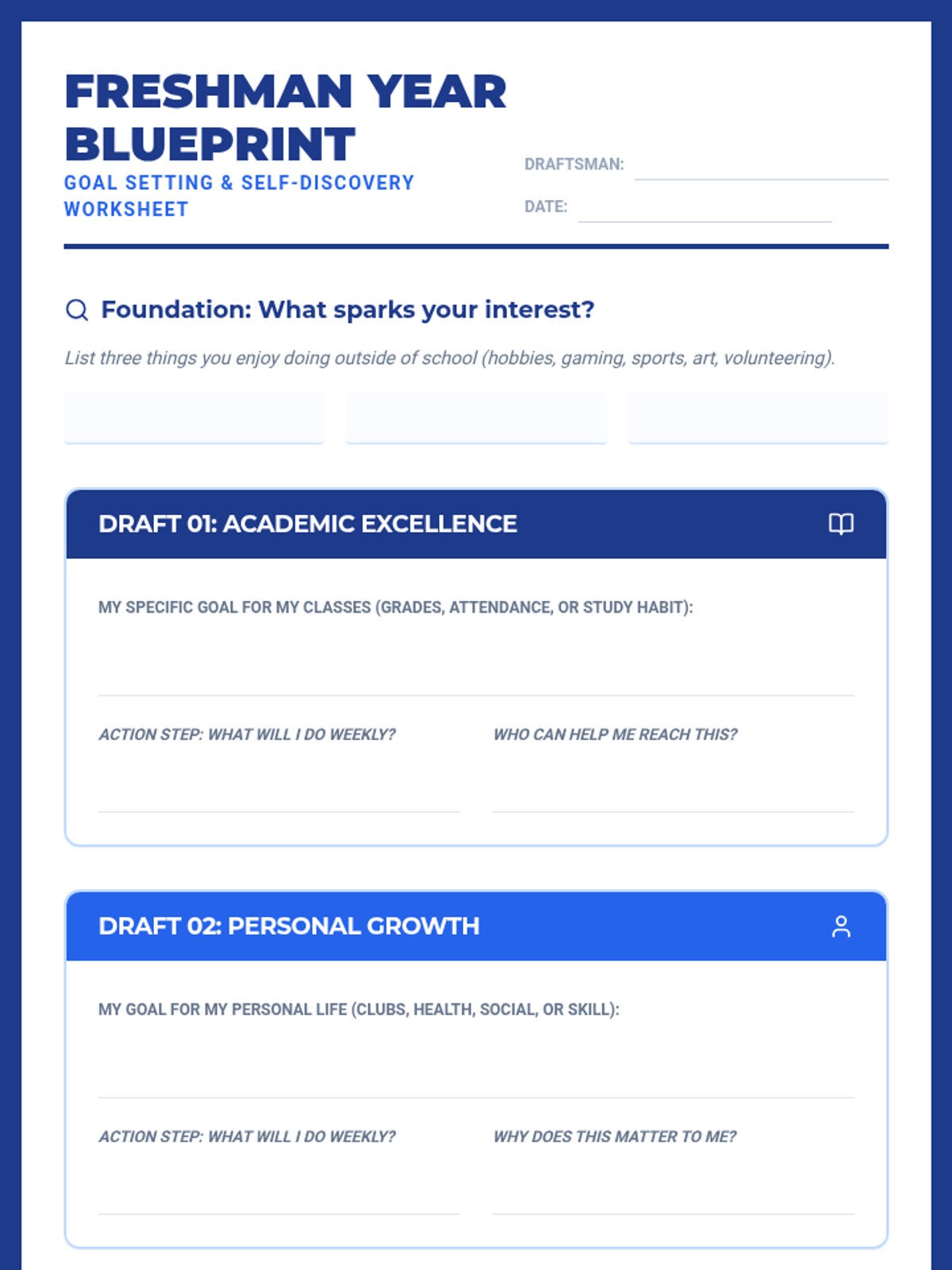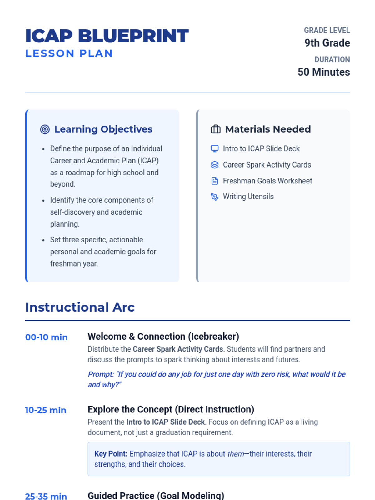 A 50-minute introductory lesson for 9th graders to understand Individual Career and Academic Plans (ICAP) and establish early high school goals through a 'Blueprint for Success' theme.