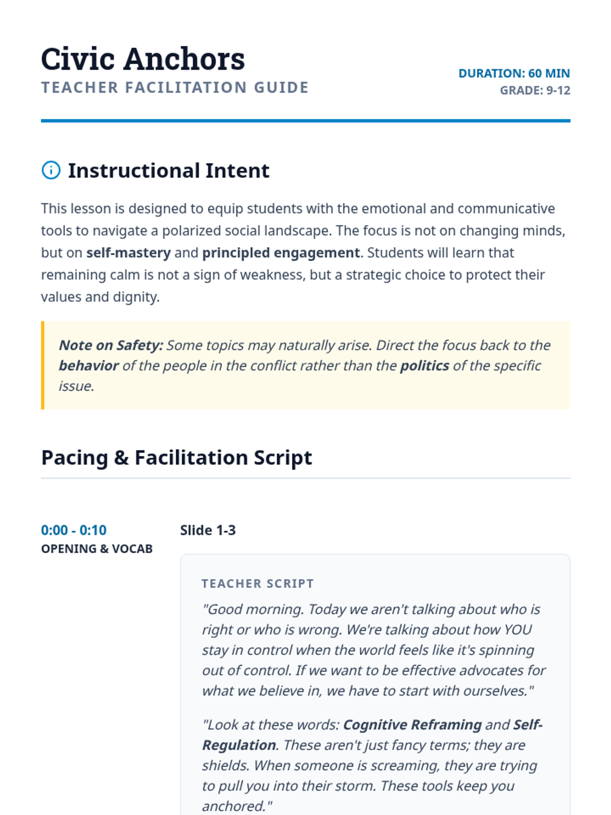A one-hour high school lesson focused on self-regulation, communication, and perspective-taking within a divided political climate, helping students stay true to their values without escalating conflict.