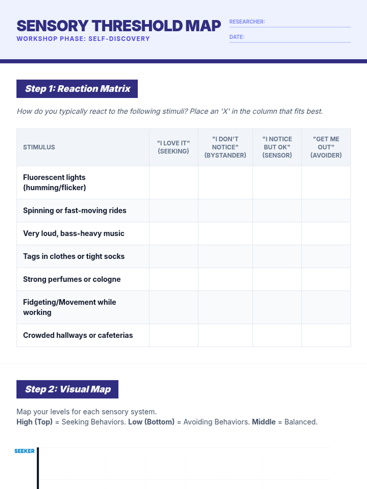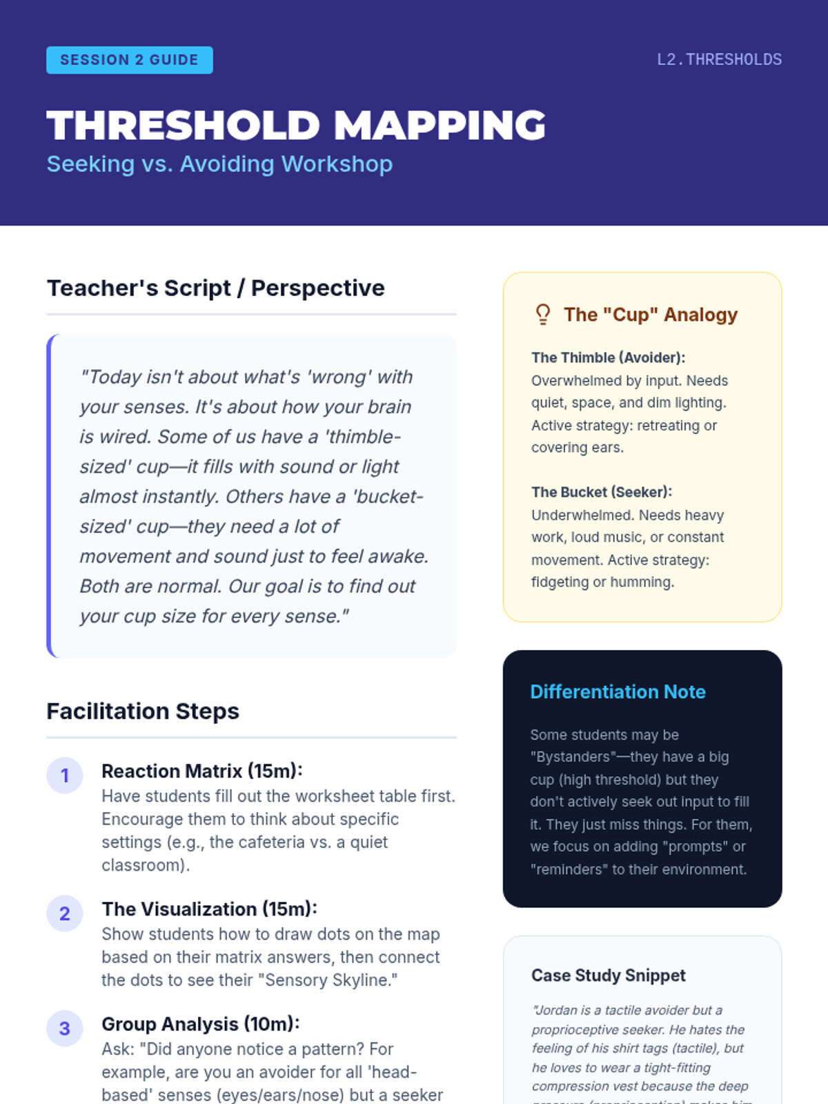 Students map their neurological thresholds by distinguishing between seeking and avoiding behaviors, categorizing their reactions to stimuli using Winnie Dunn’s model of sensory processing.
