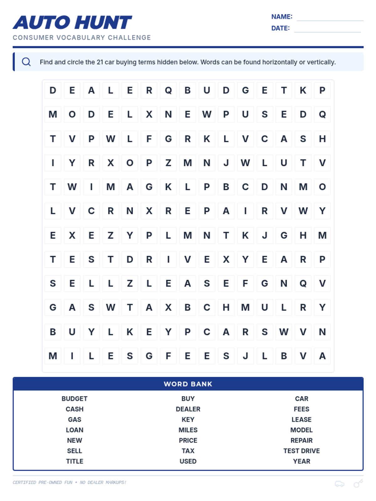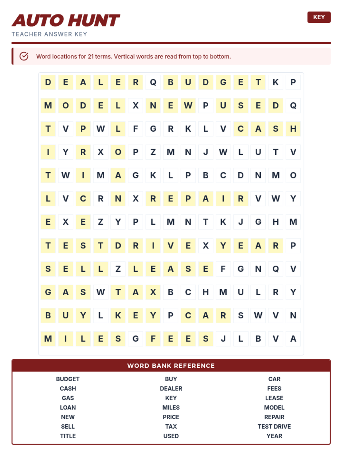 A focused lesson on car buying vocabulary and consumer basics, featuring a themed word search activity and answer key.