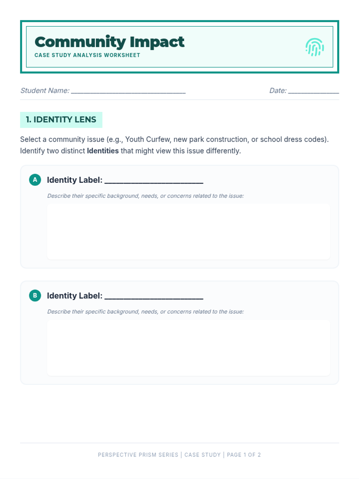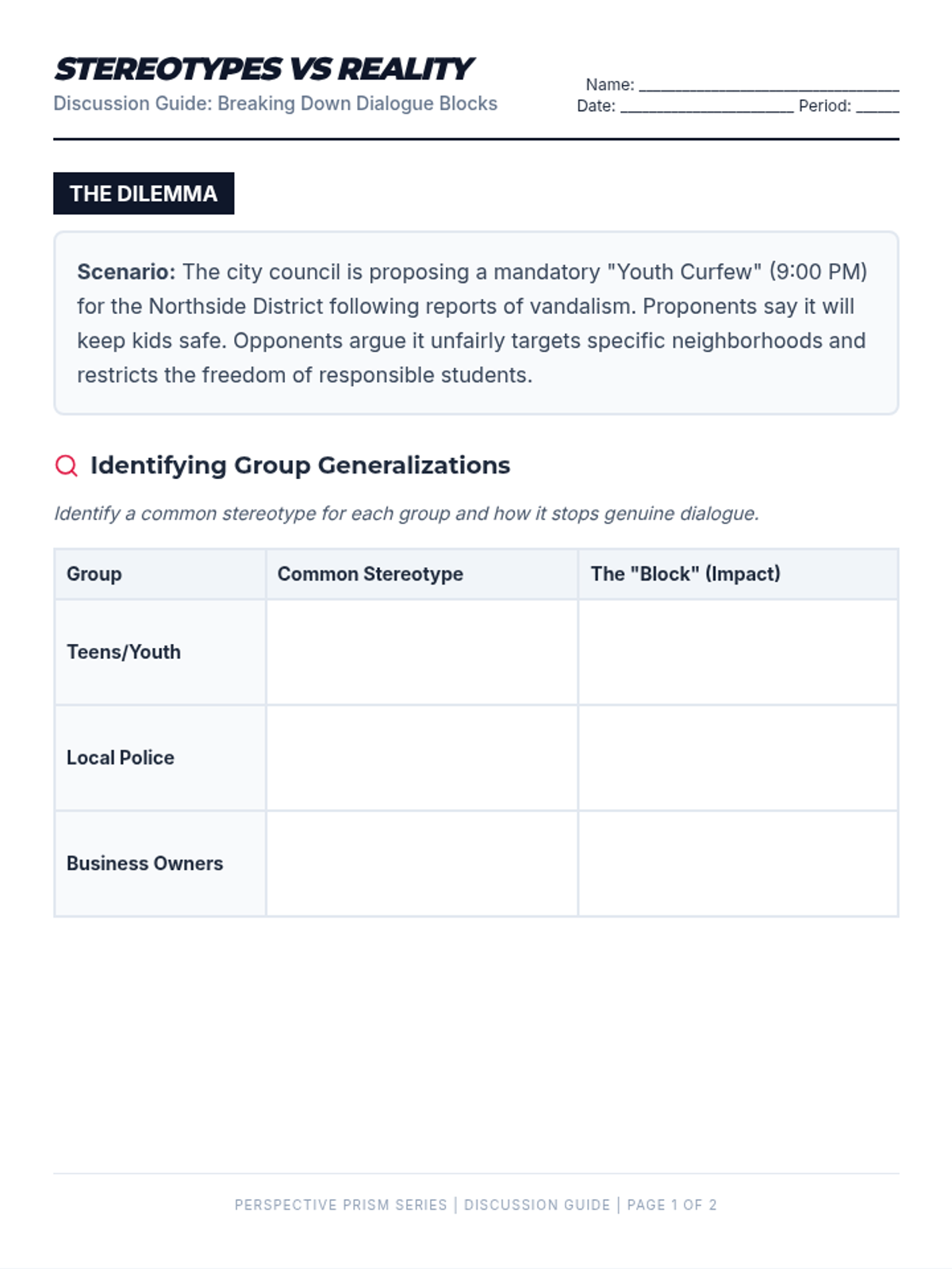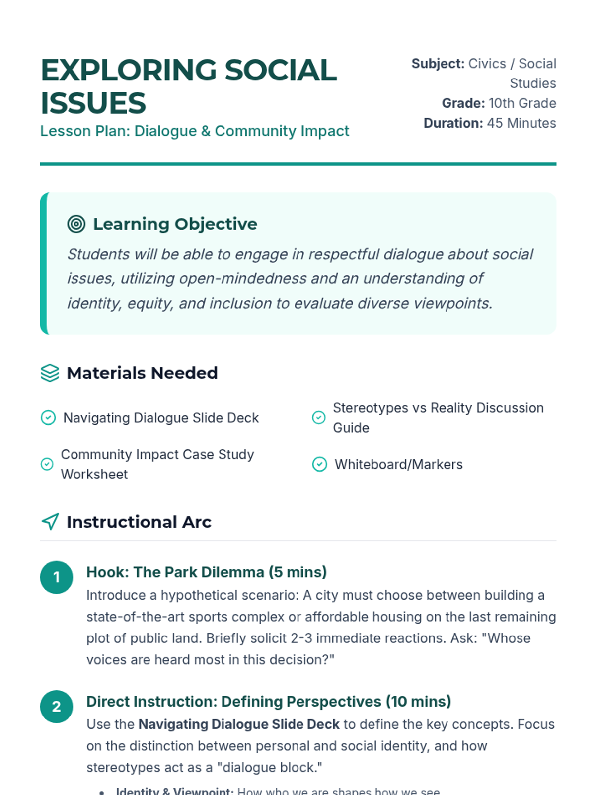 A high school lesson focused on developing empathy and critical thinking through respectful dialogue about social issues, identity, and community impact.