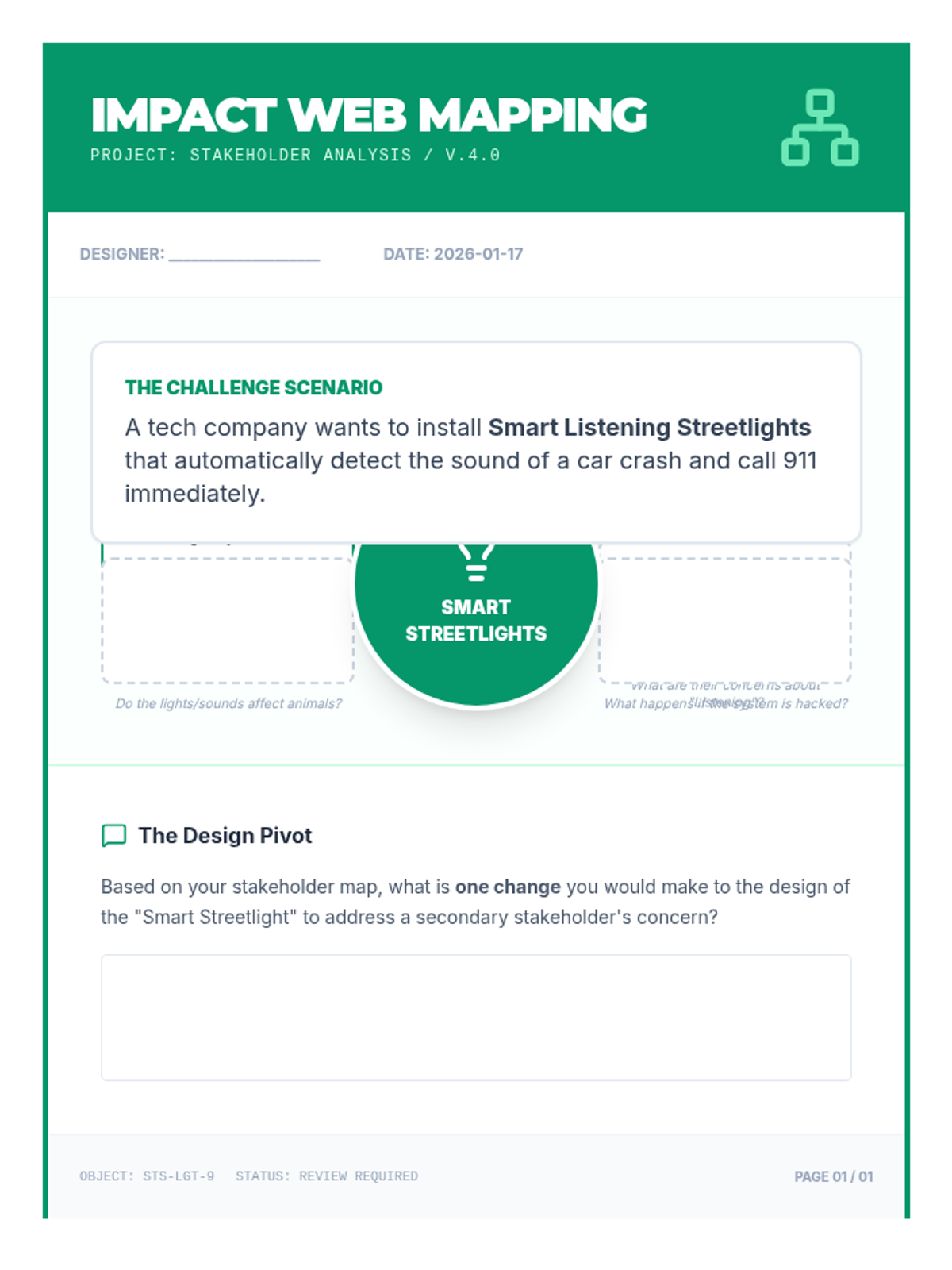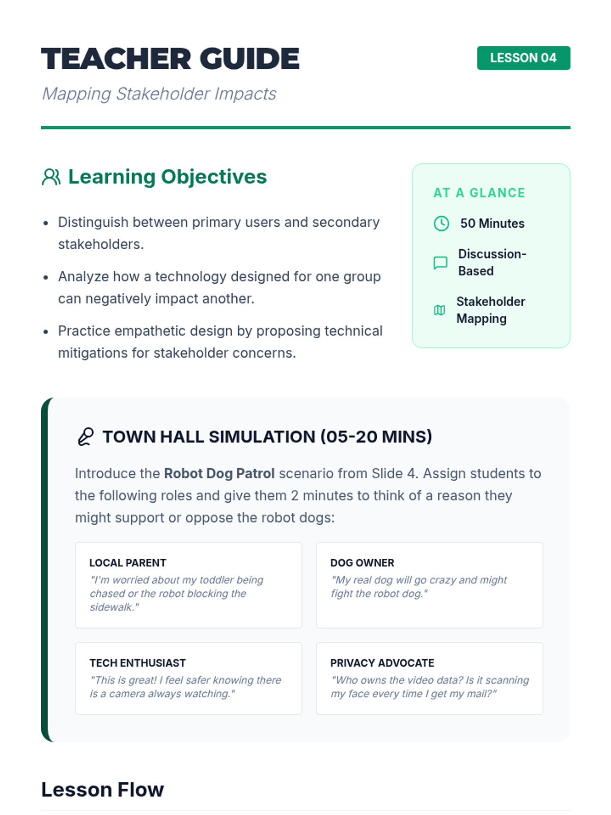 Students learn to identify primary users and secondary stakeholders, creating impact maps for technologies like delivery drones and robot dogs.