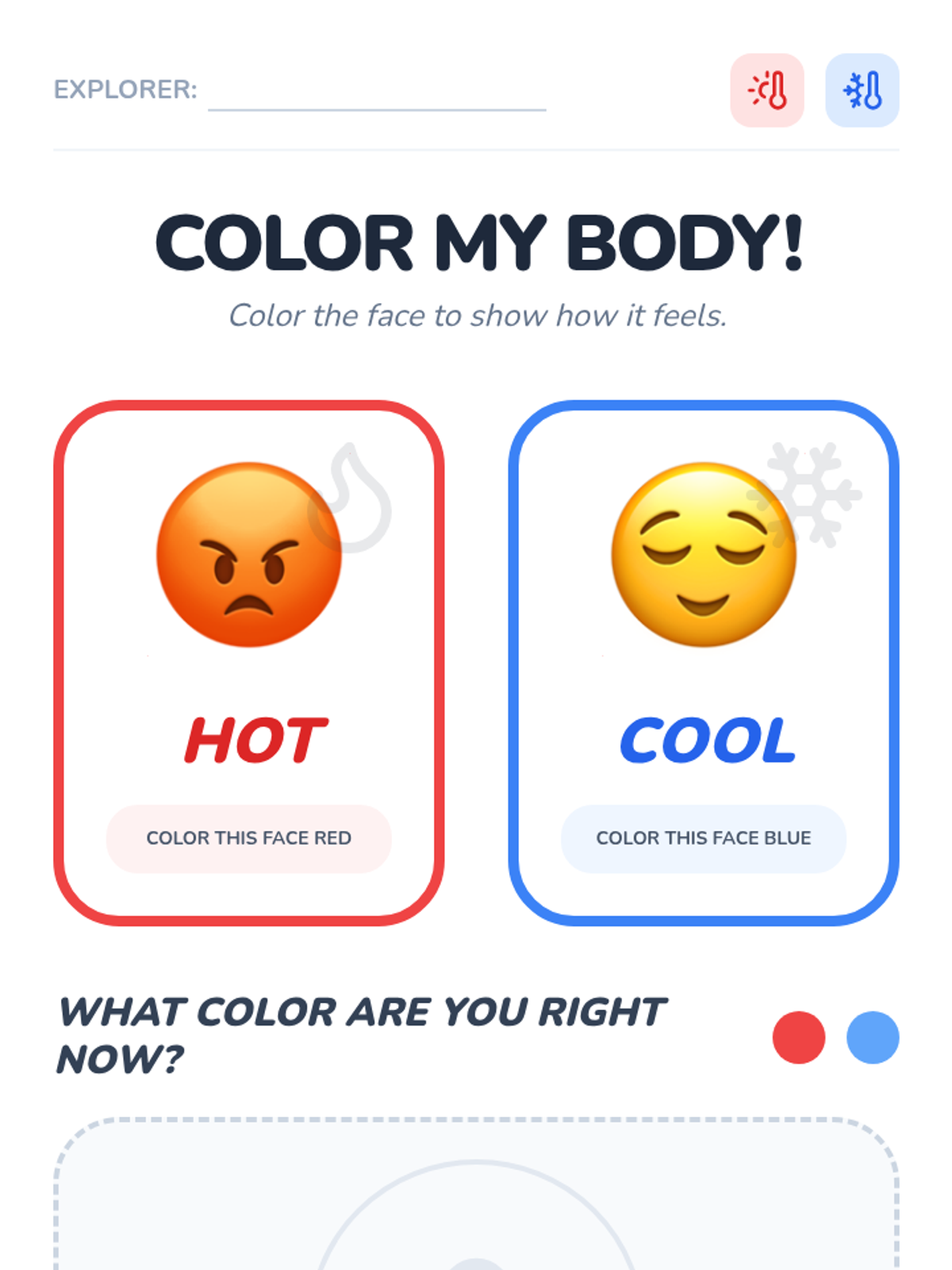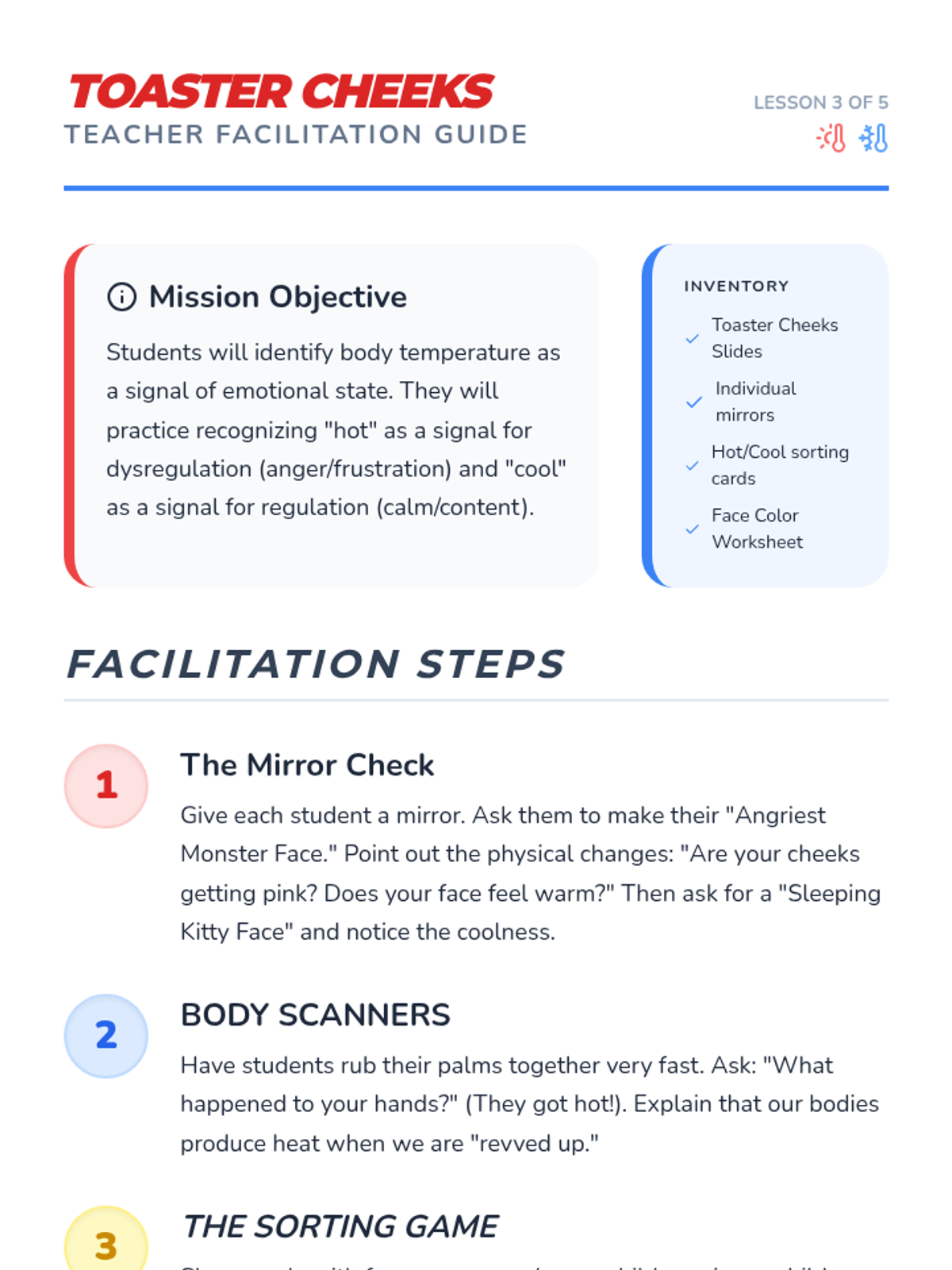 Students use visual aids and mirrors to observe changes in face color or feelings of heat during different emotional states. They sort pictures of faces into 'hot/red' (angry/frustrated) and 'cool' (calm/content) categories.