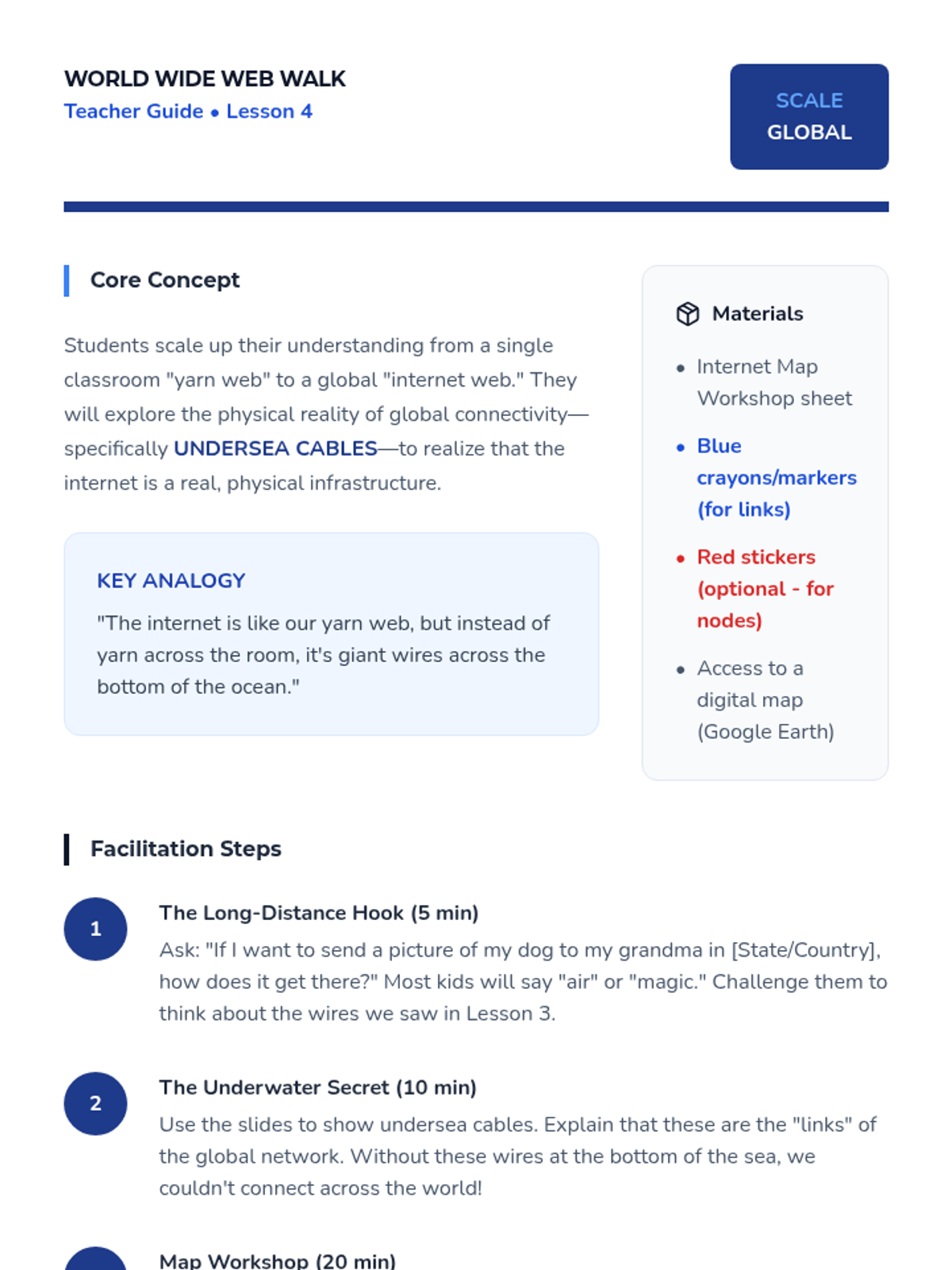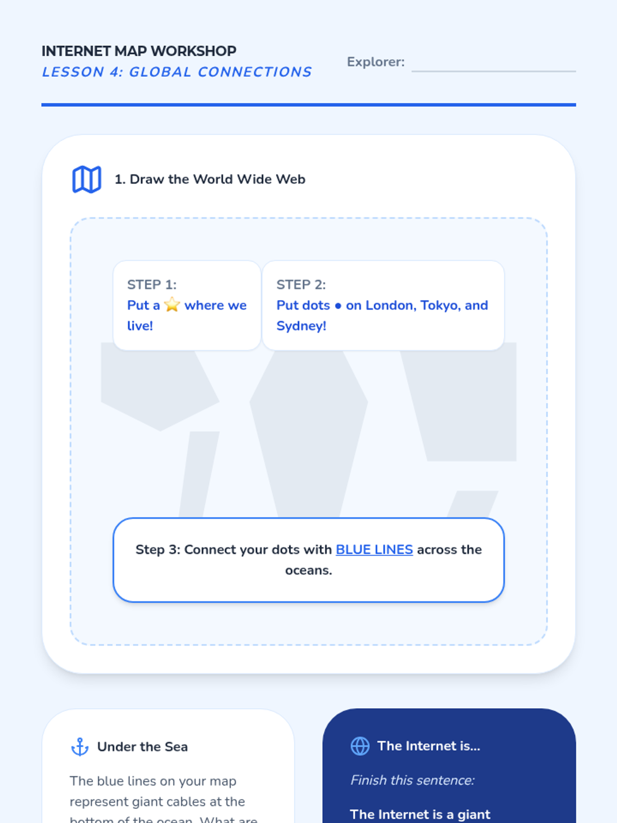Students transition from local networks to the global Internet, visualizing the world-wide web of connections using maps.