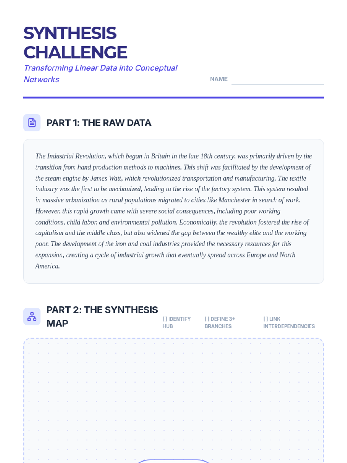 Converting linear notes into non-linear visual syntheses to identify gaps in understanding and reinforce conceptual connections.