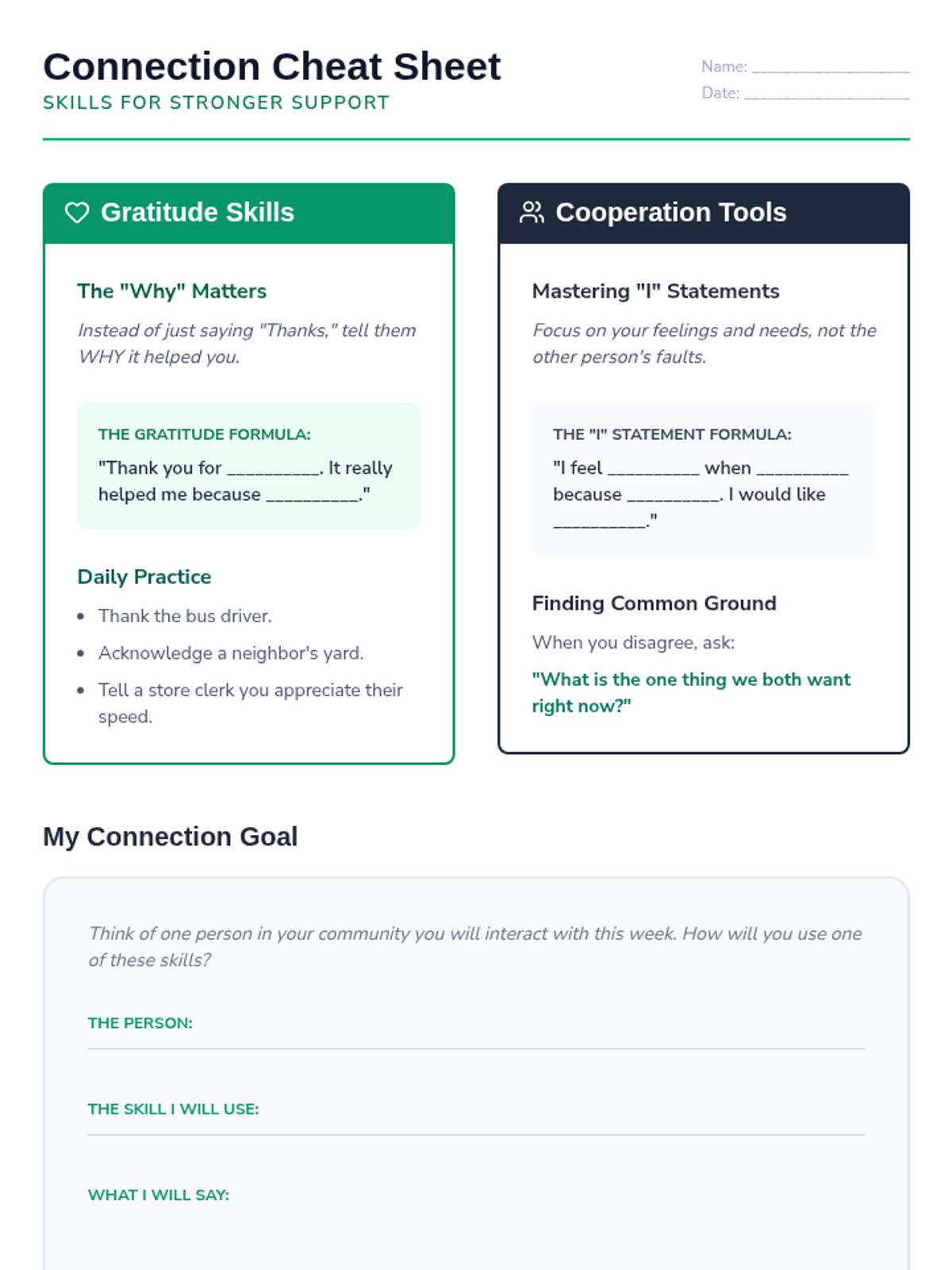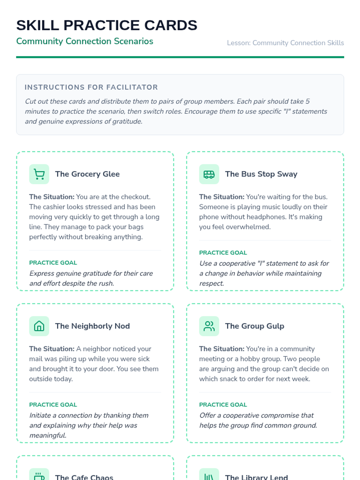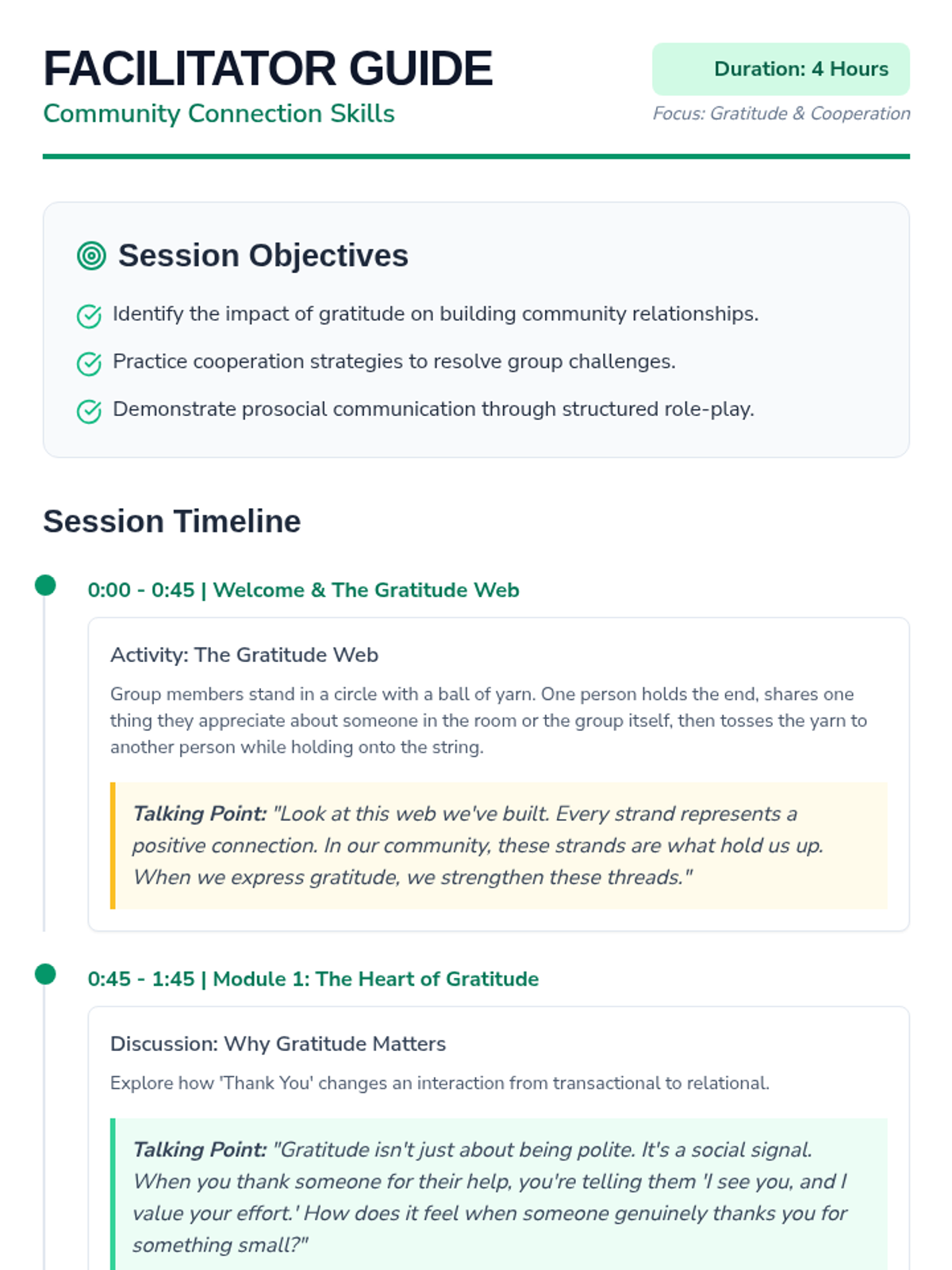 A 4-hour Psychosocial Rehabilitation (PSR) group session focused on enhancing community support through gratitude and cooperation skills. Includes a detailed facilitator guide, presentation slides, and role-play scenario cards.