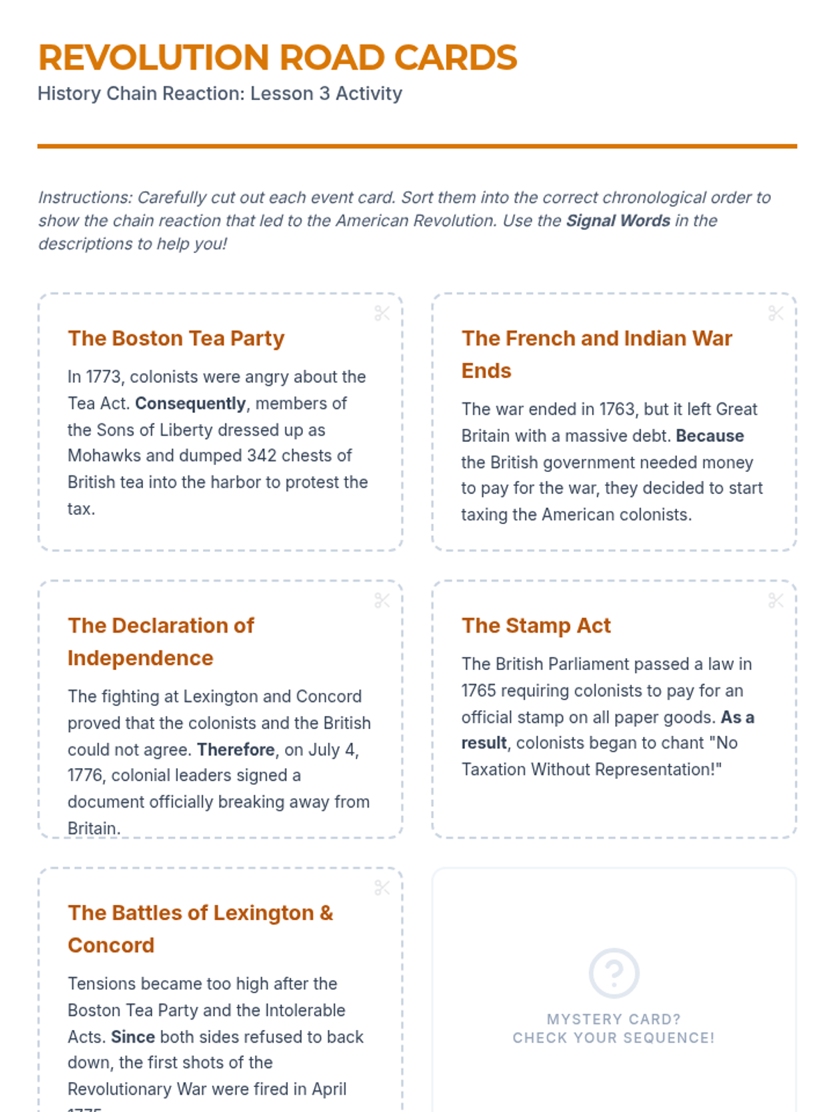 A comprehensive look at the escalating tensions and key events that led the thirteen colonies to break away from British rule. Students will explore the transition from loyal subjects to independent revolutionaries through the lens of taxes, protests, and early battles.