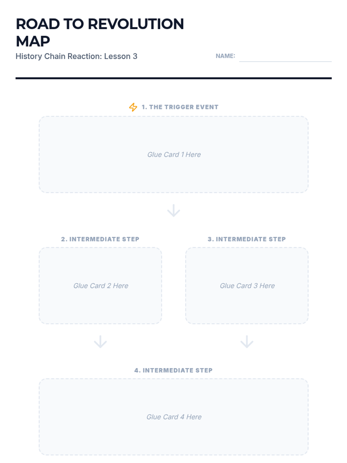 Students take a specific historical event and map it as a flowchart. They identify the initial event, intermediate steps, and the final outcome.