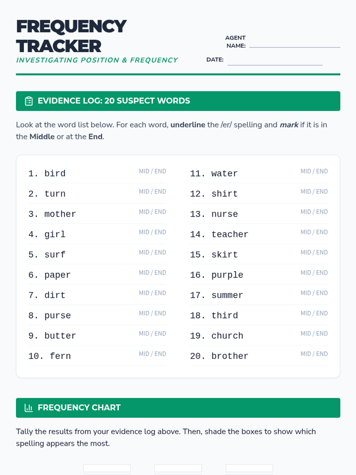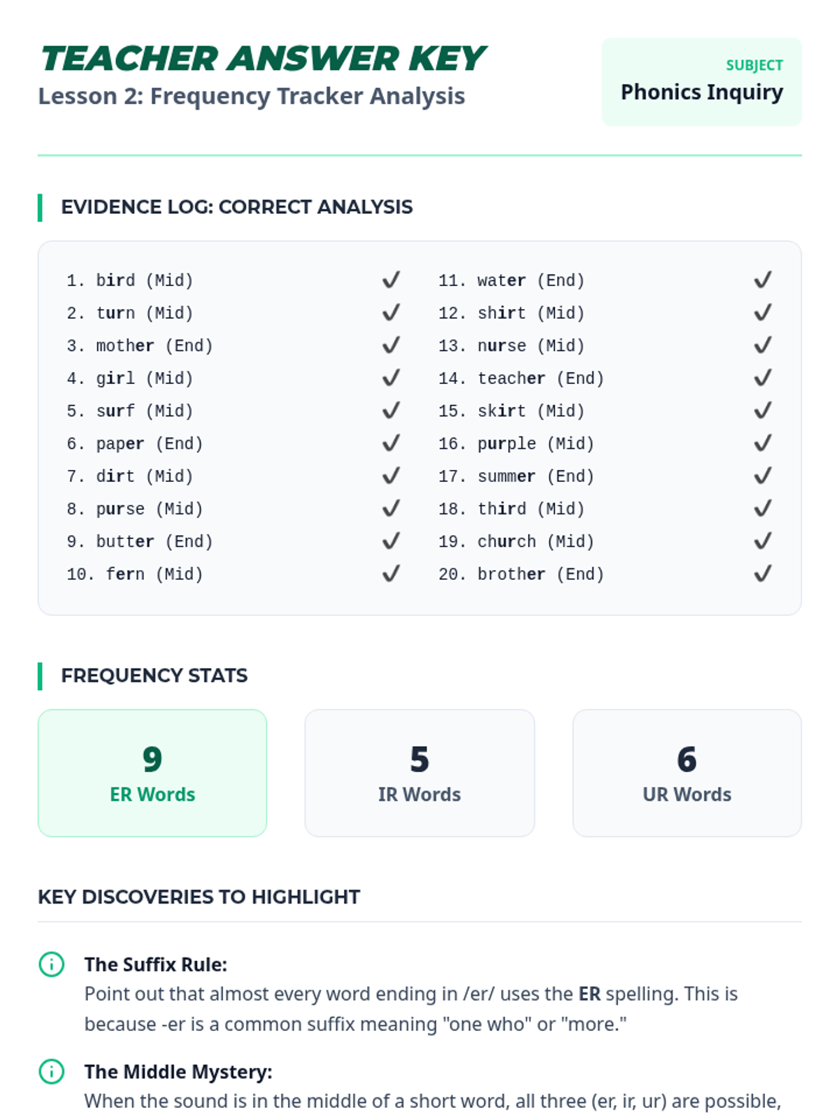 Students analyze word data to discover patterns in position and frequency, learning that 'er' often ends words while 'ir' and 'ur' typically appear in the middle.