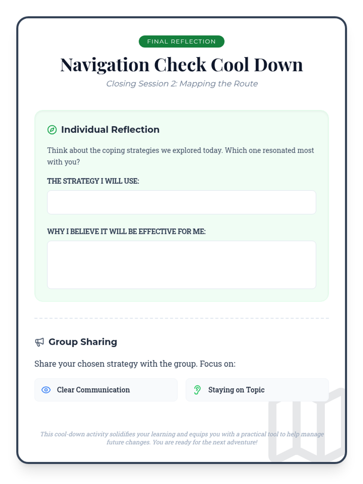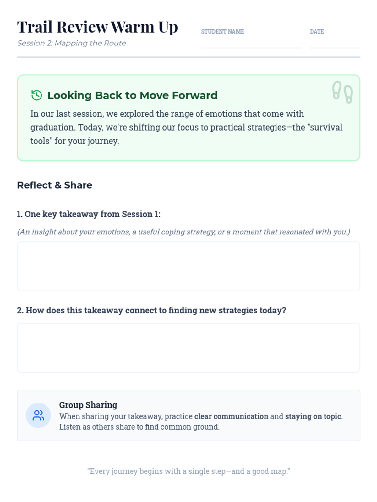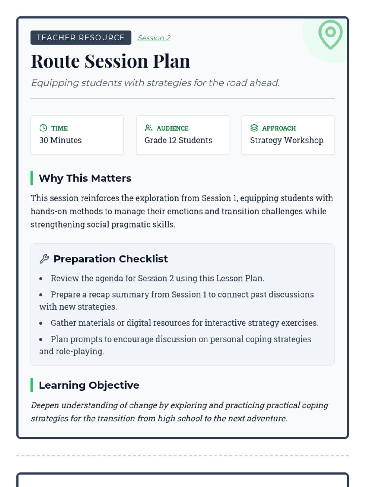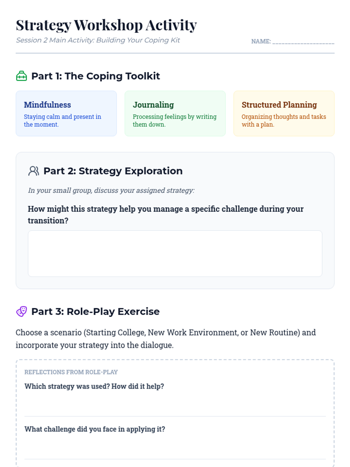 Students learn and practice practical coping strategies for managing the transition from high school to their next adventure through role-play and strategy workshops.