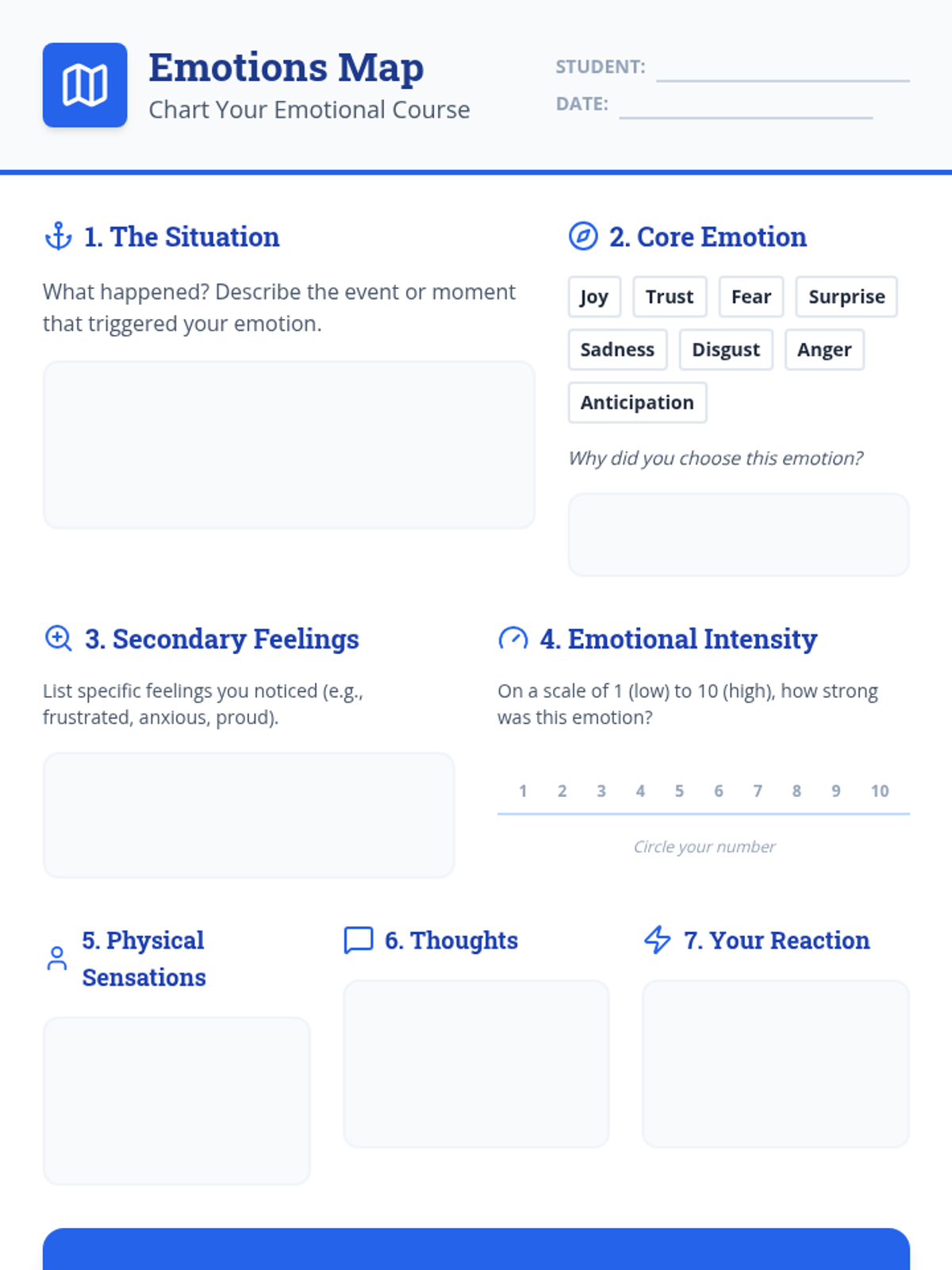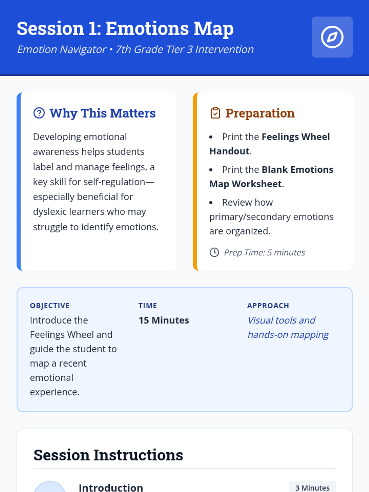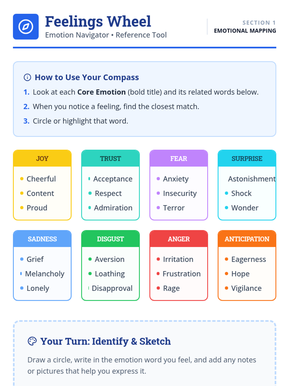 Introduction to emotional awareness using the Feelings Wheel and initial mapping of emotional experiences.