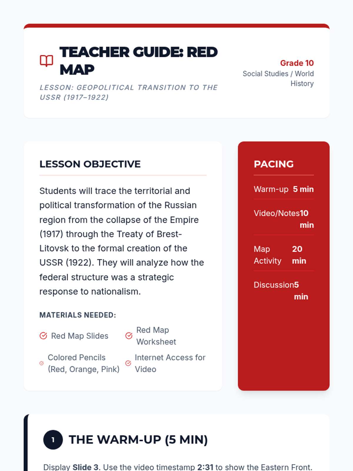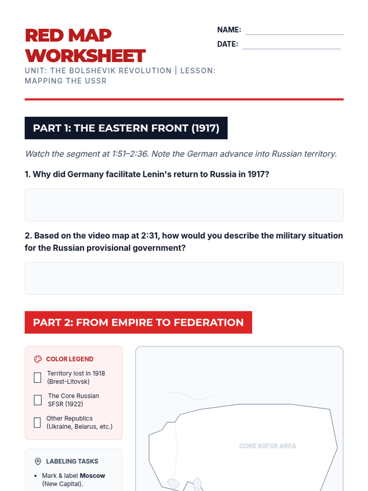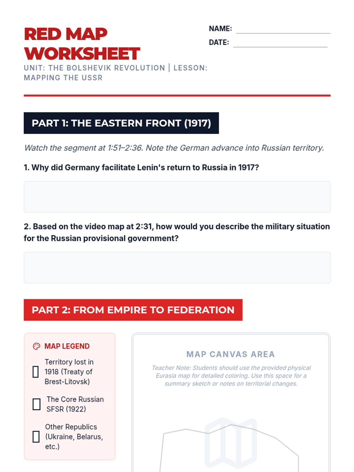 Students will map the transition from the Russian Empire to the USSR, focusing on the territorial losses of the Treaty of Brest-Litovsk and the eventual formation of the Soviet federation in 1922.
