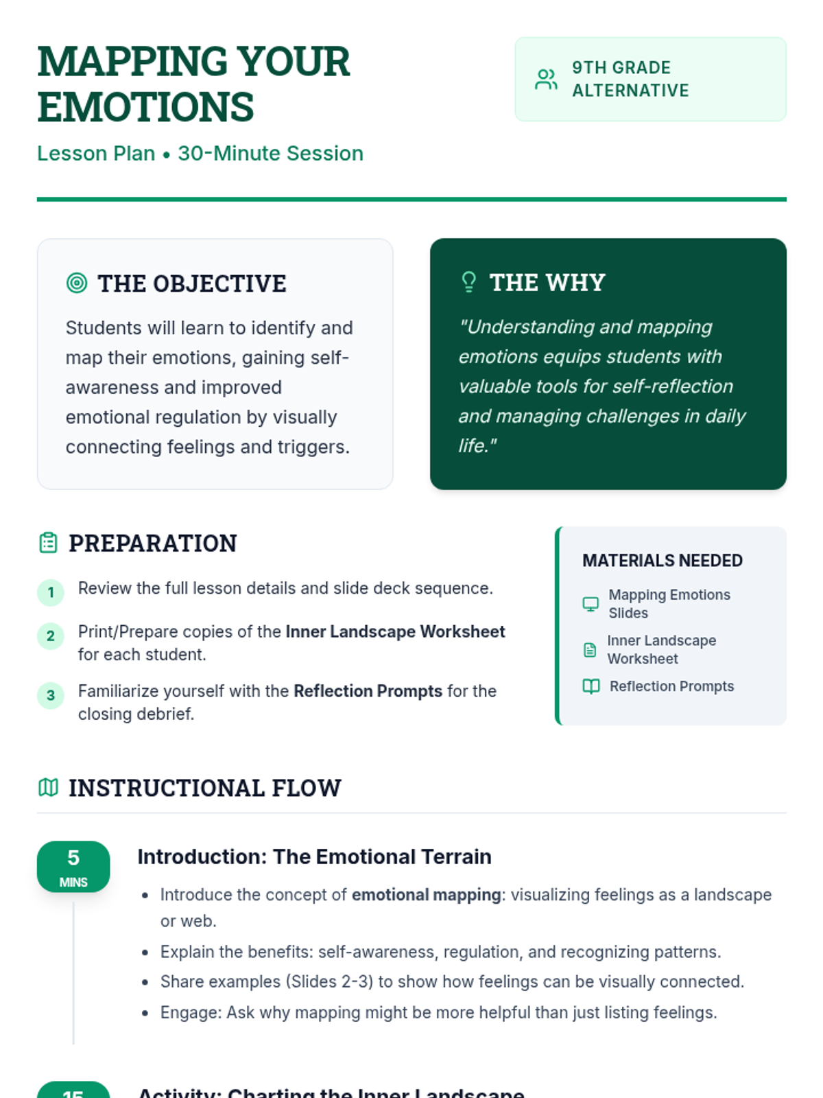 A 30-minute lesson for 9th-grade students in alternative programs, introducing emotional mapping as a tool for self-awareness and regulation through visualization and reflection.