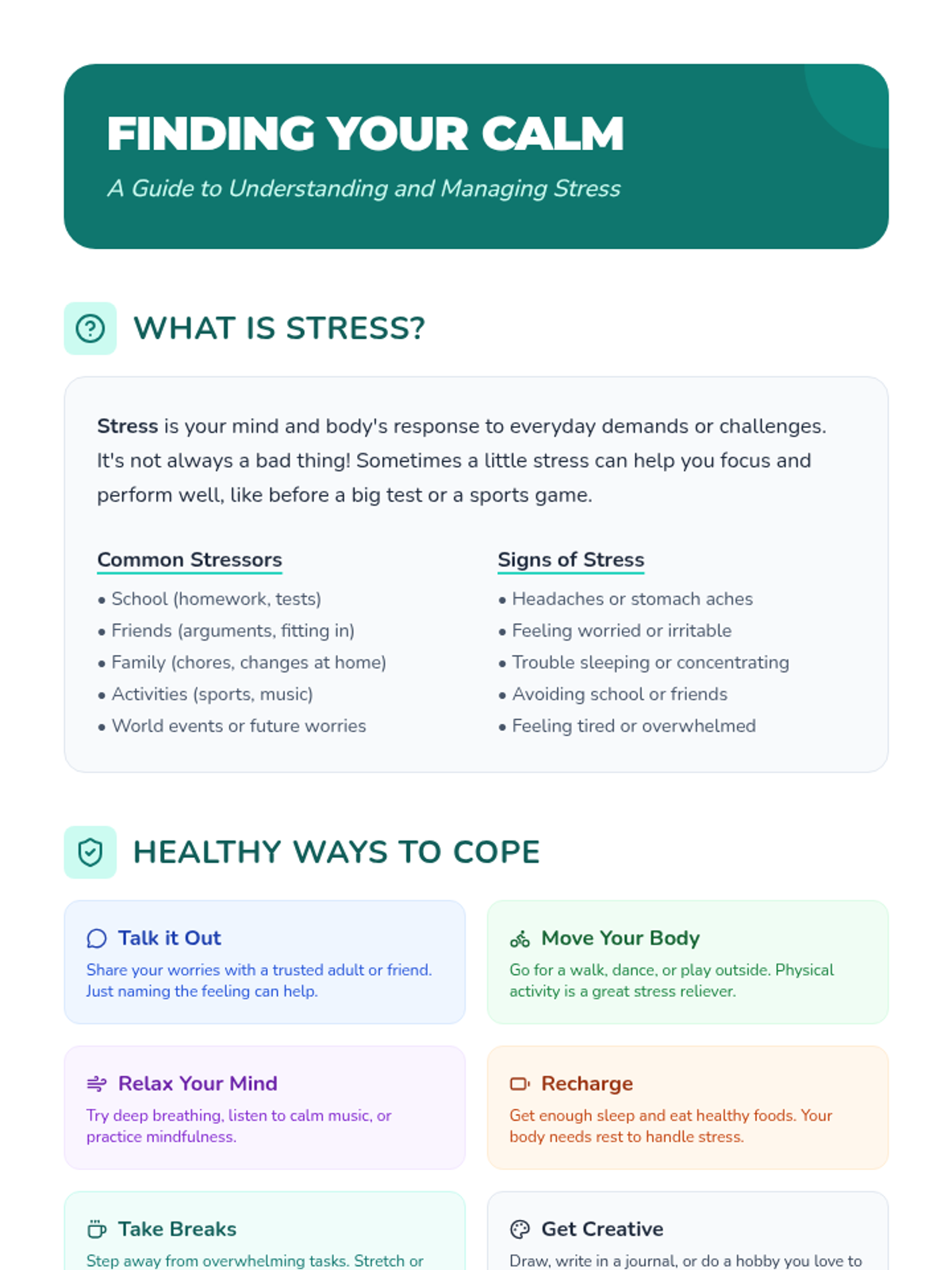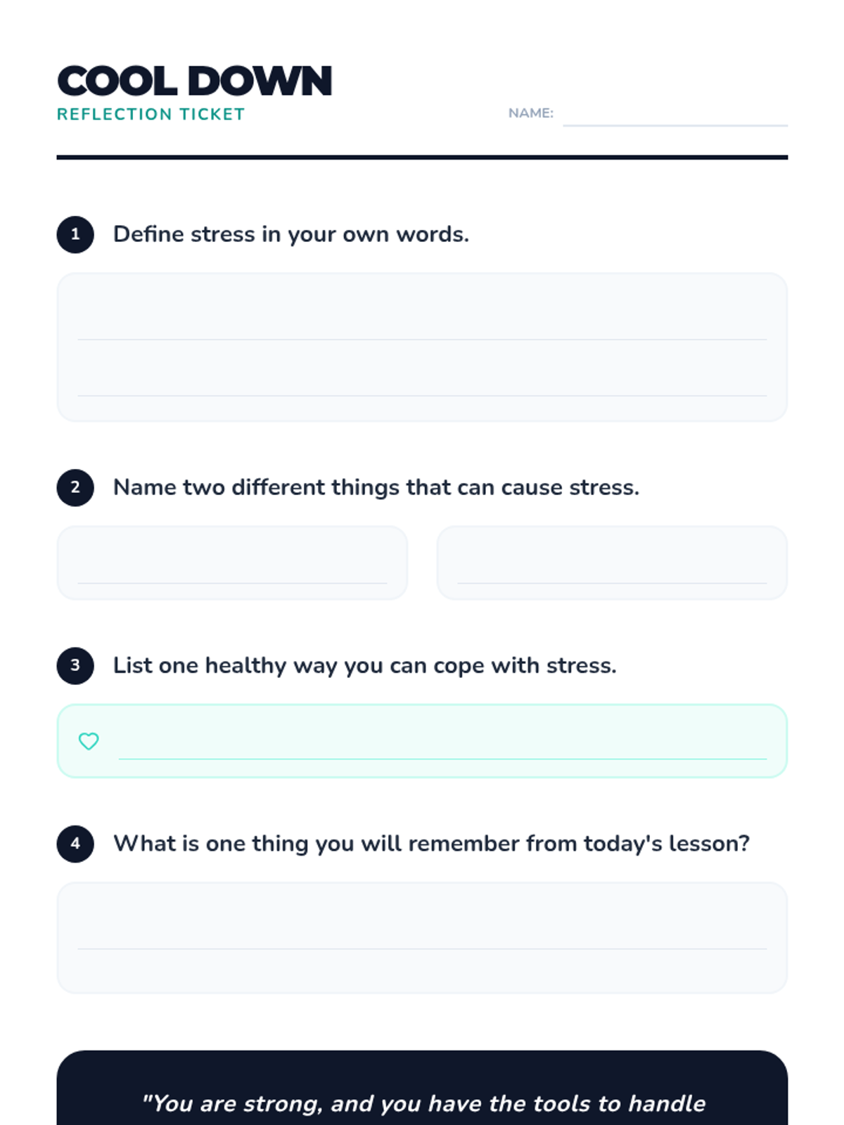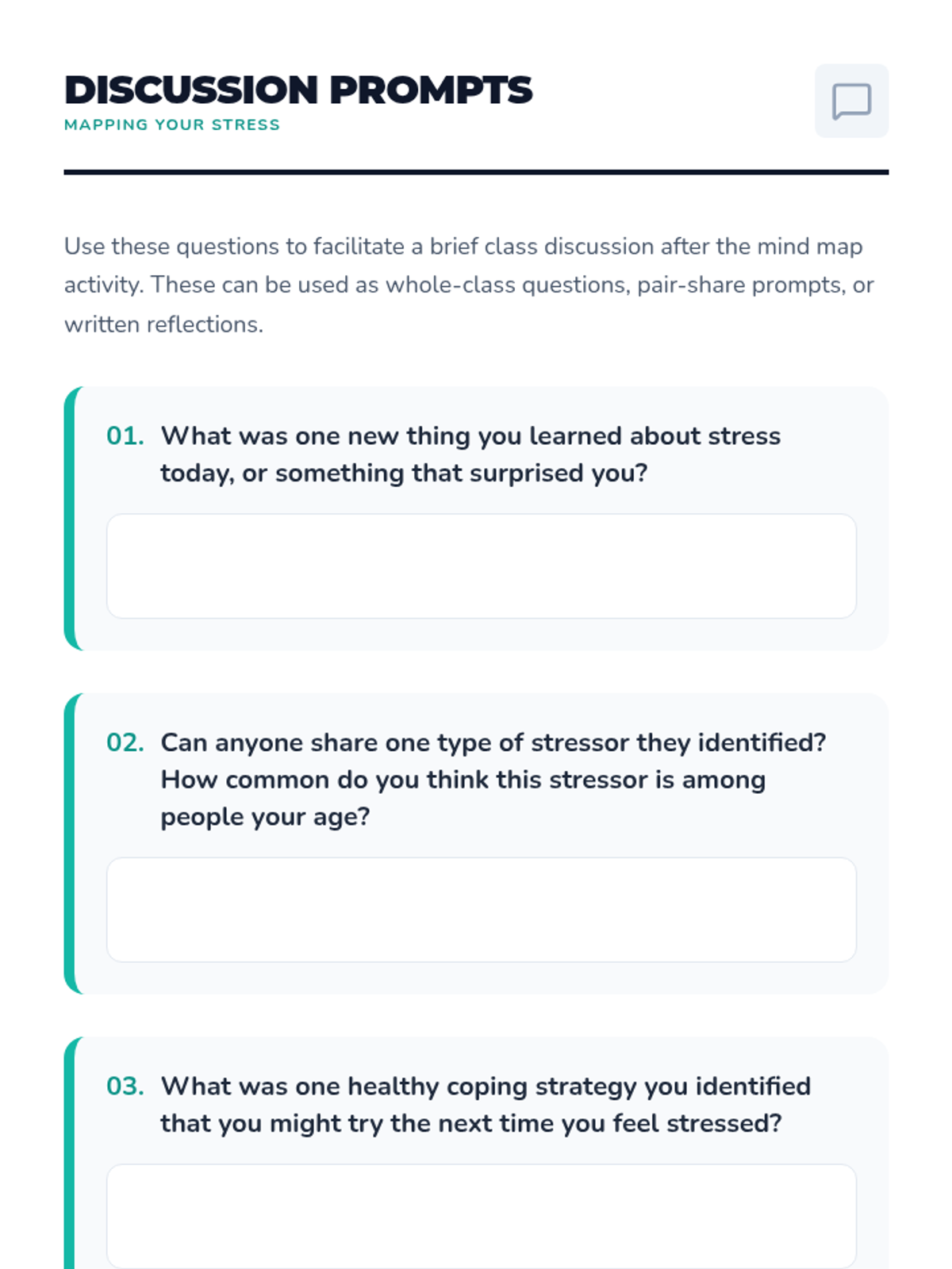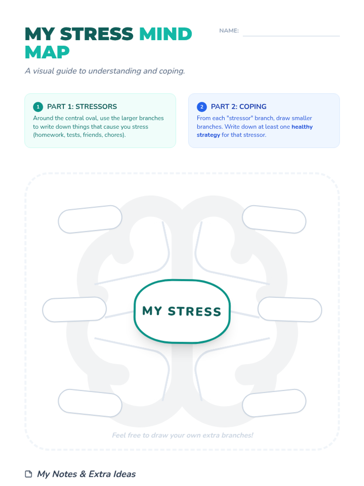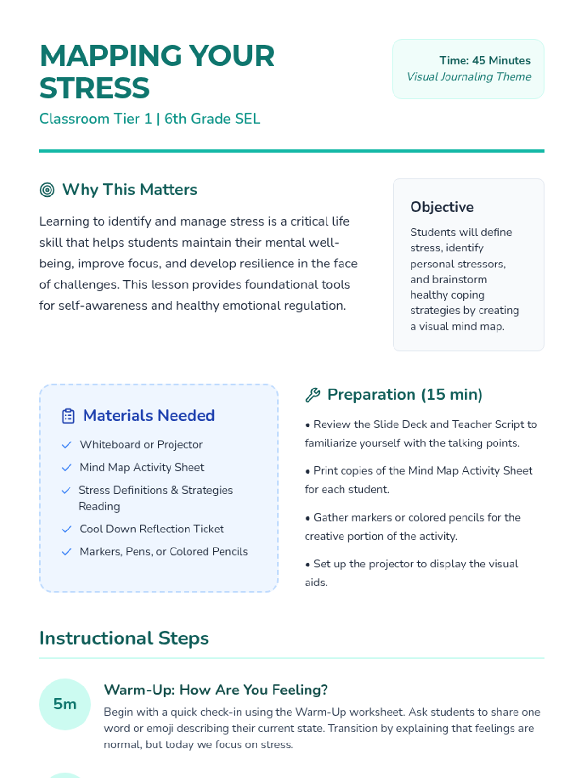 A 45-minute social-emotional learning lesson for 6th graders to identify personal stressors and explore healthy coping mechanisms through visual mind mapping.