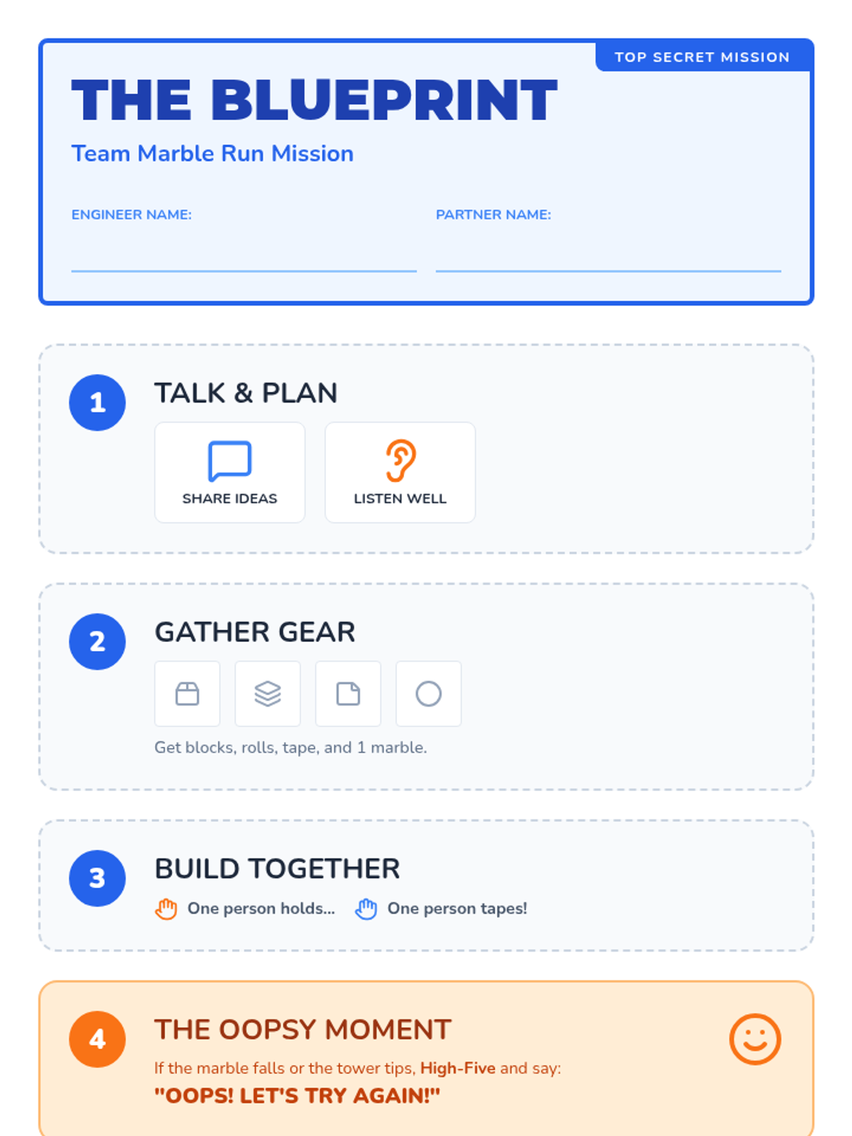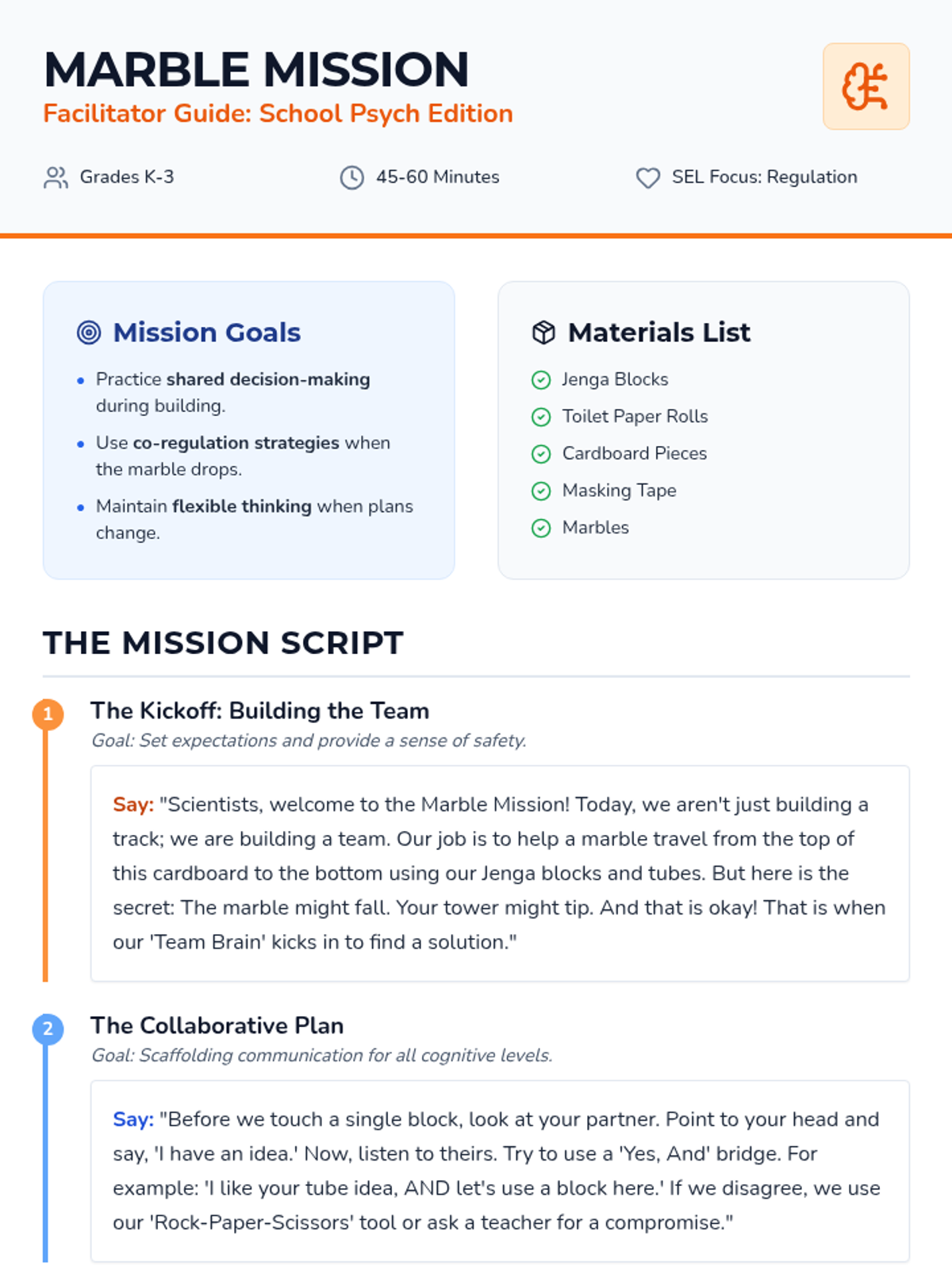 A collaborative building activity for K-3 students focused on teamwork and emotional regulation through the construction of a marble run. Designed with a school psychology lens to support diverse cognitive and behavioral needs.