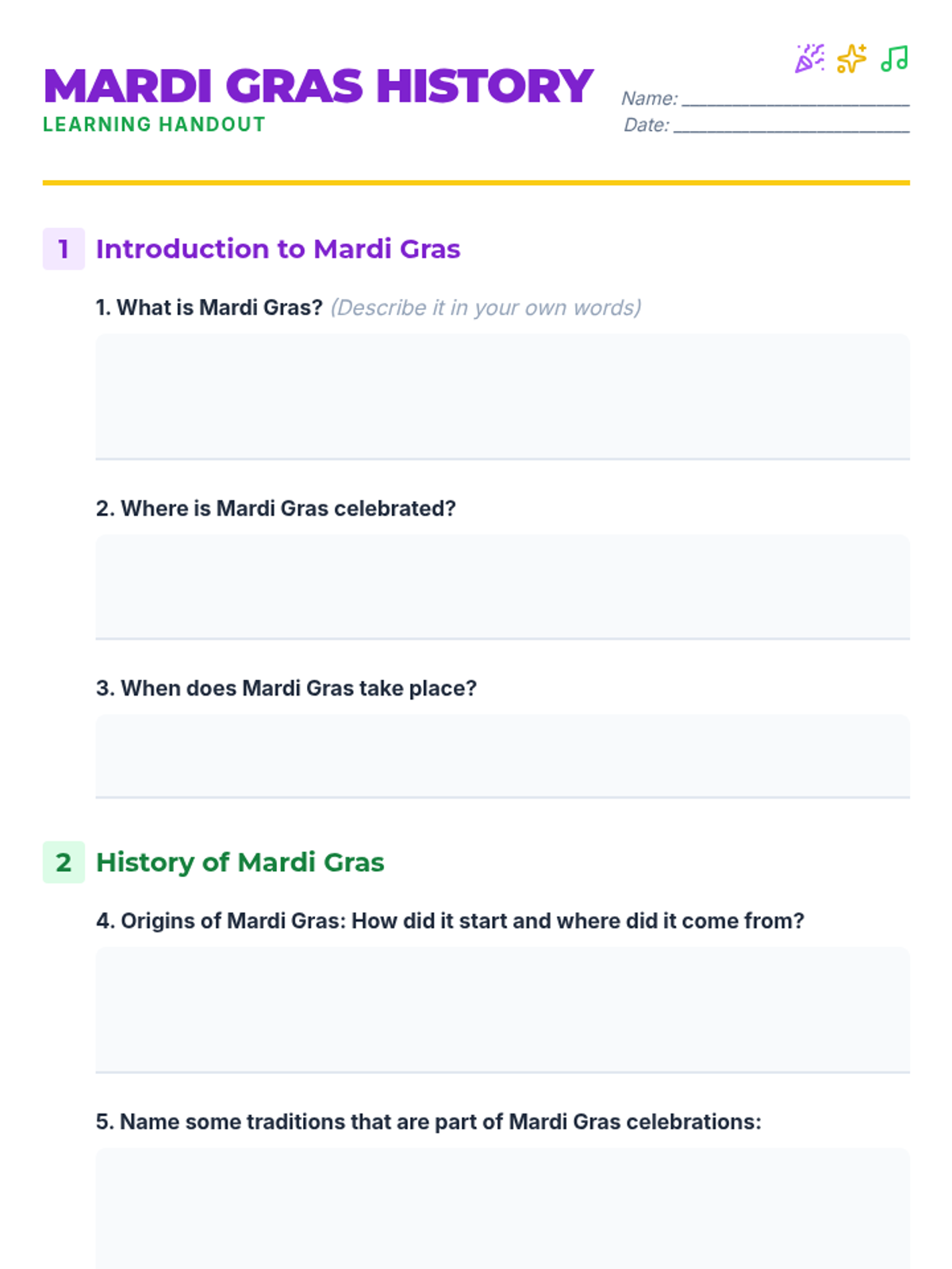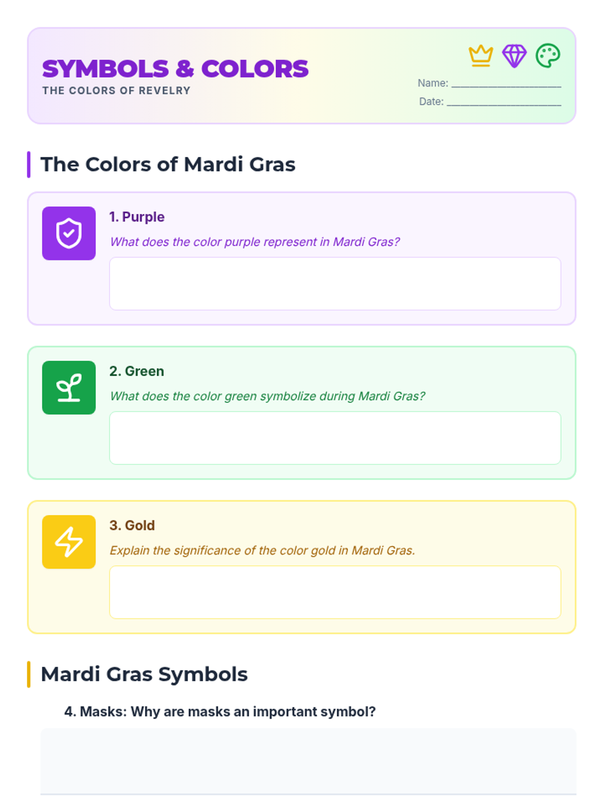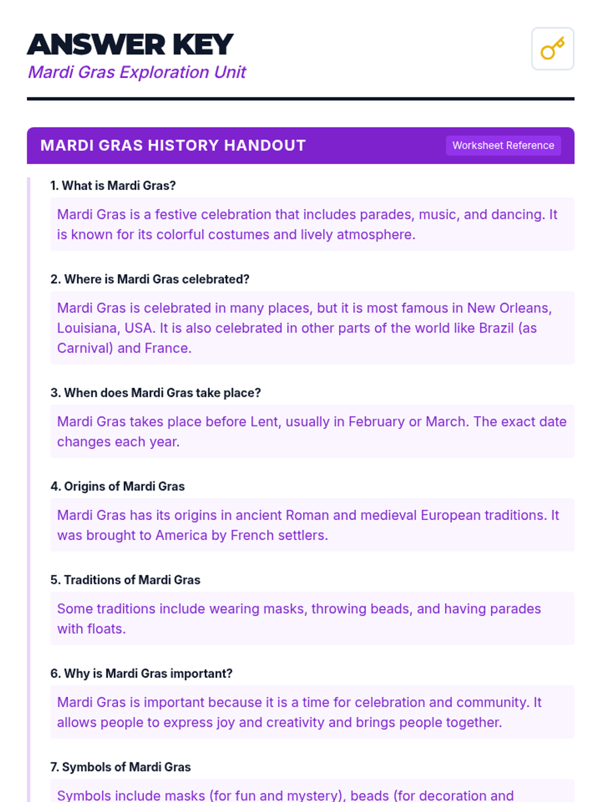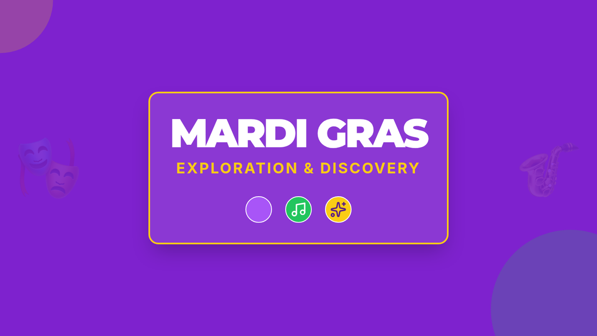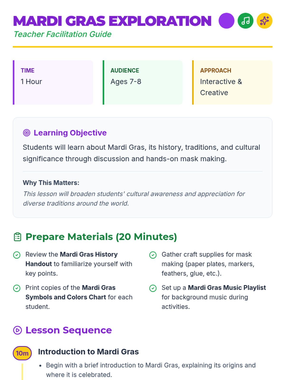 A vibrant 1-hour lesson for 7-8 year olds exploring the history, traditions, and colorful symbols of Mardi Gras through interactive discussion and mask-making.