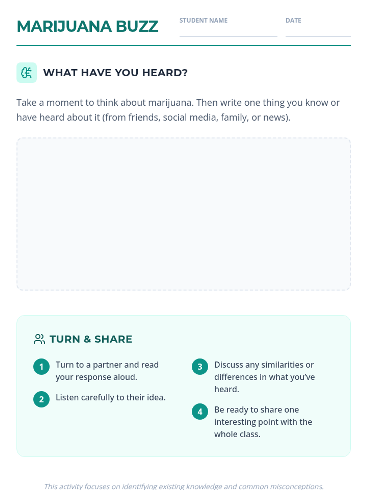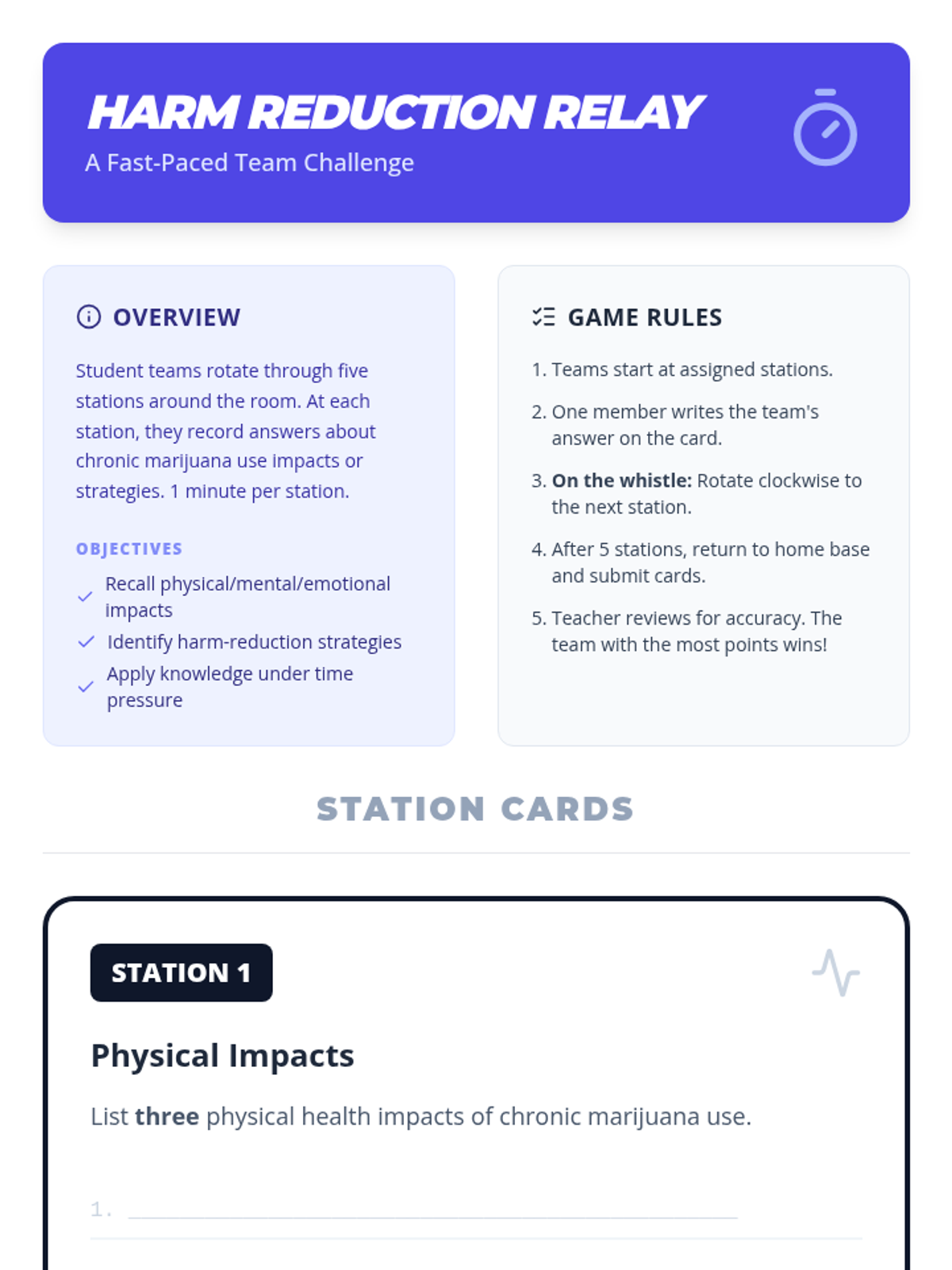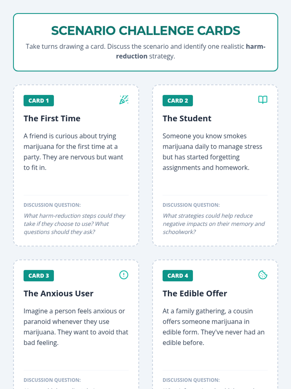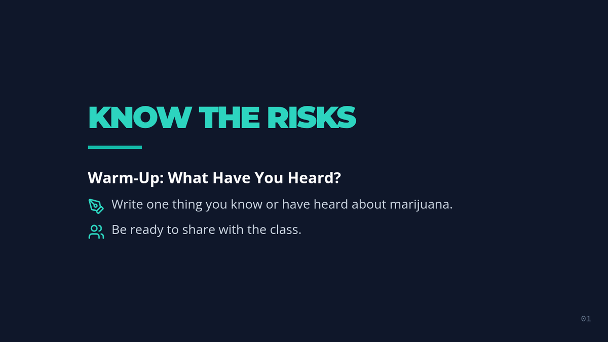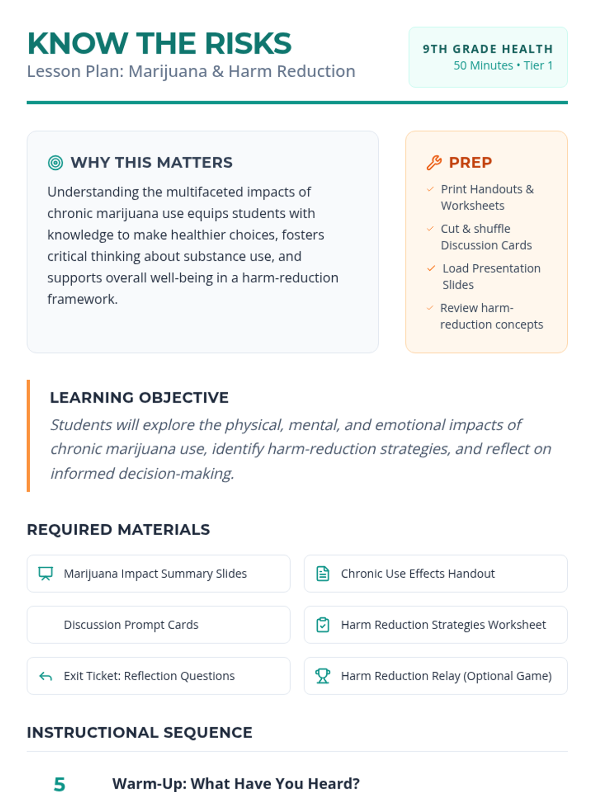 A 50-minute Tier 1 lesson for 9th graders exploring the physical, mental, and emotional impacts of chronic marijuana use through a harm-reduction lens. Students identify risks and develop practical strategies for informed decision-making.