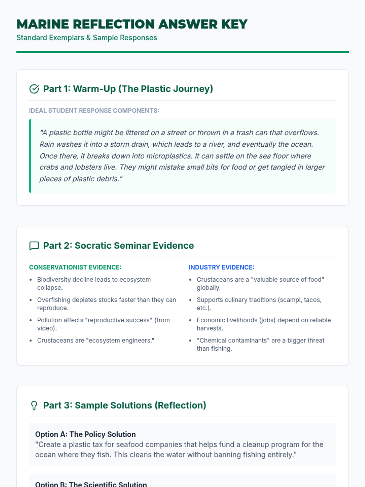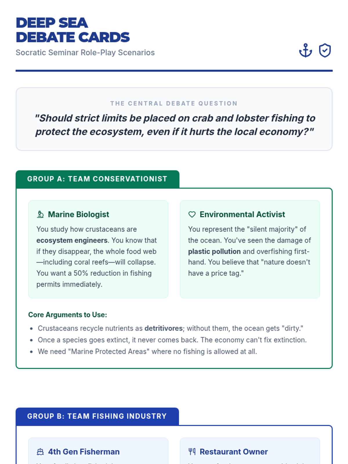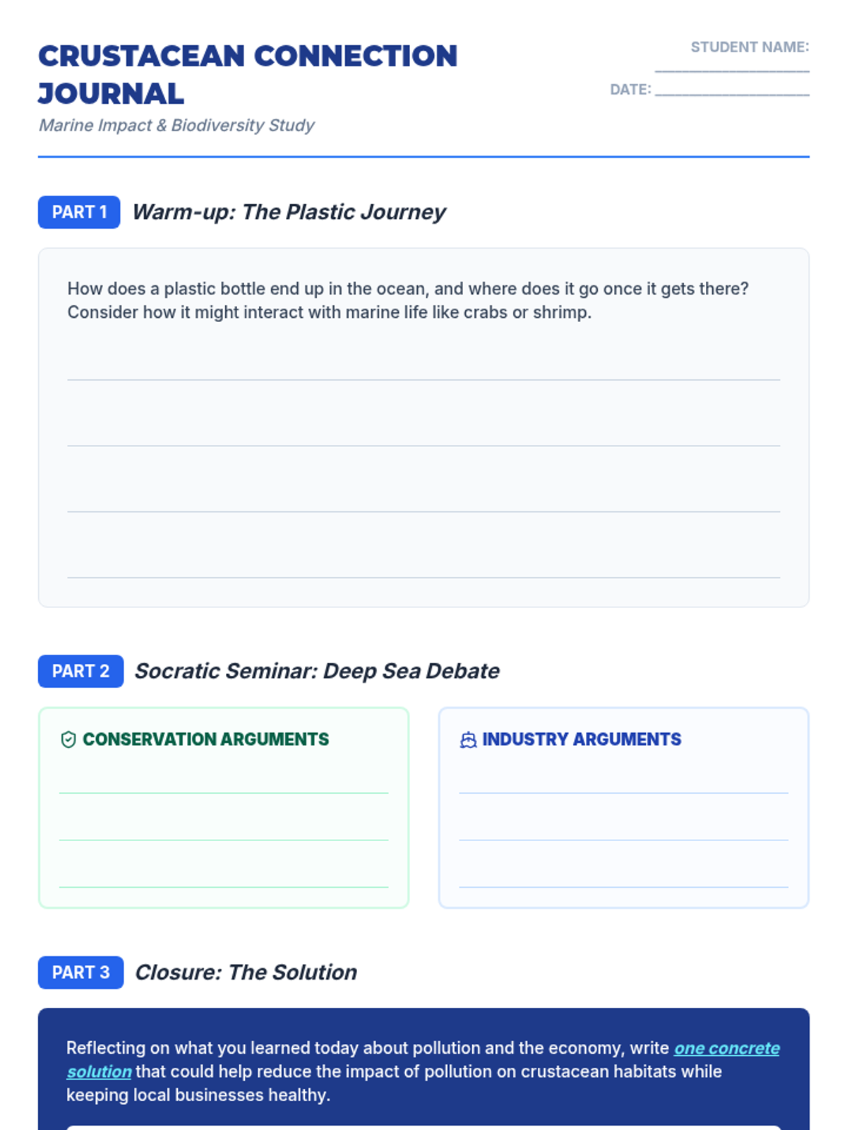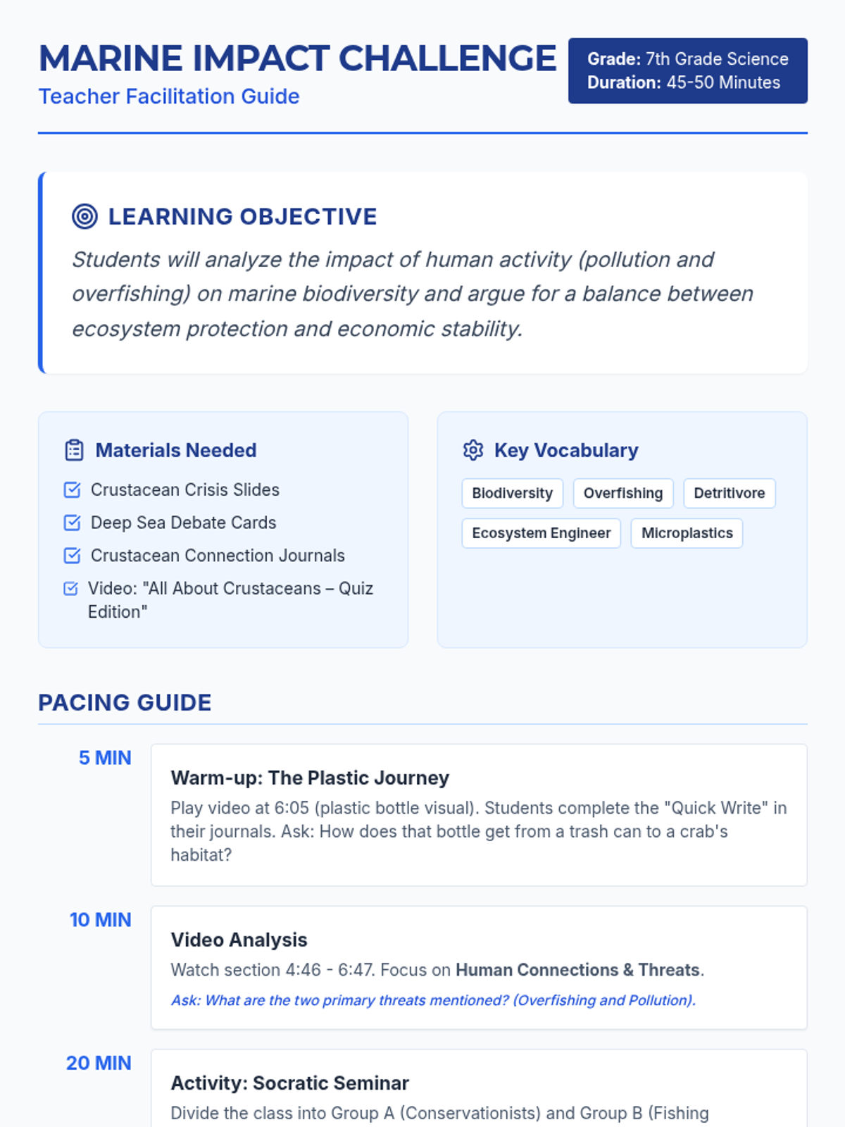 This lesson explores the impact of human activities on marine biodiversity, specifically focusing on crustaceans. Students will engage in a Socratic Seminar to debate the balance between environmental conservation and economic needs after analyzing video evidence of pollution and overfishing.