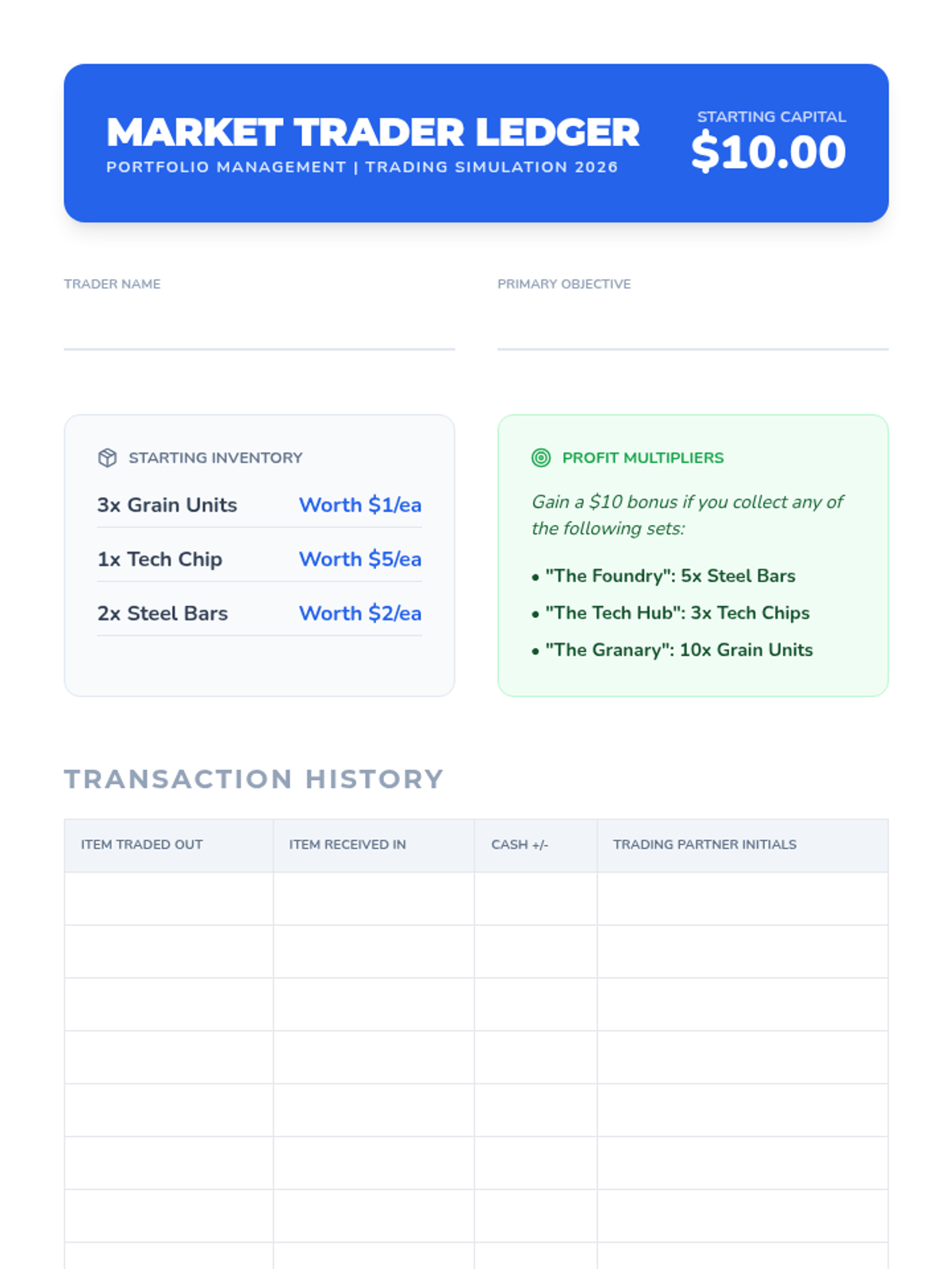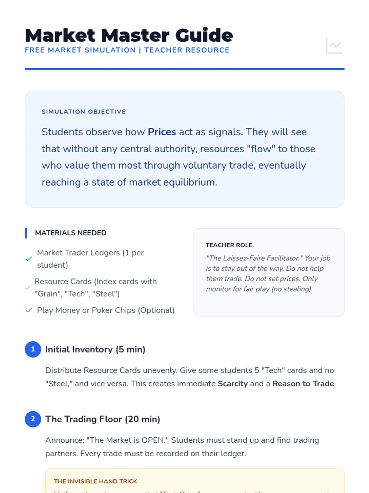 A trading game that demonstrates how supply, demand, and self-interest coordinate resource allocation in a market system.