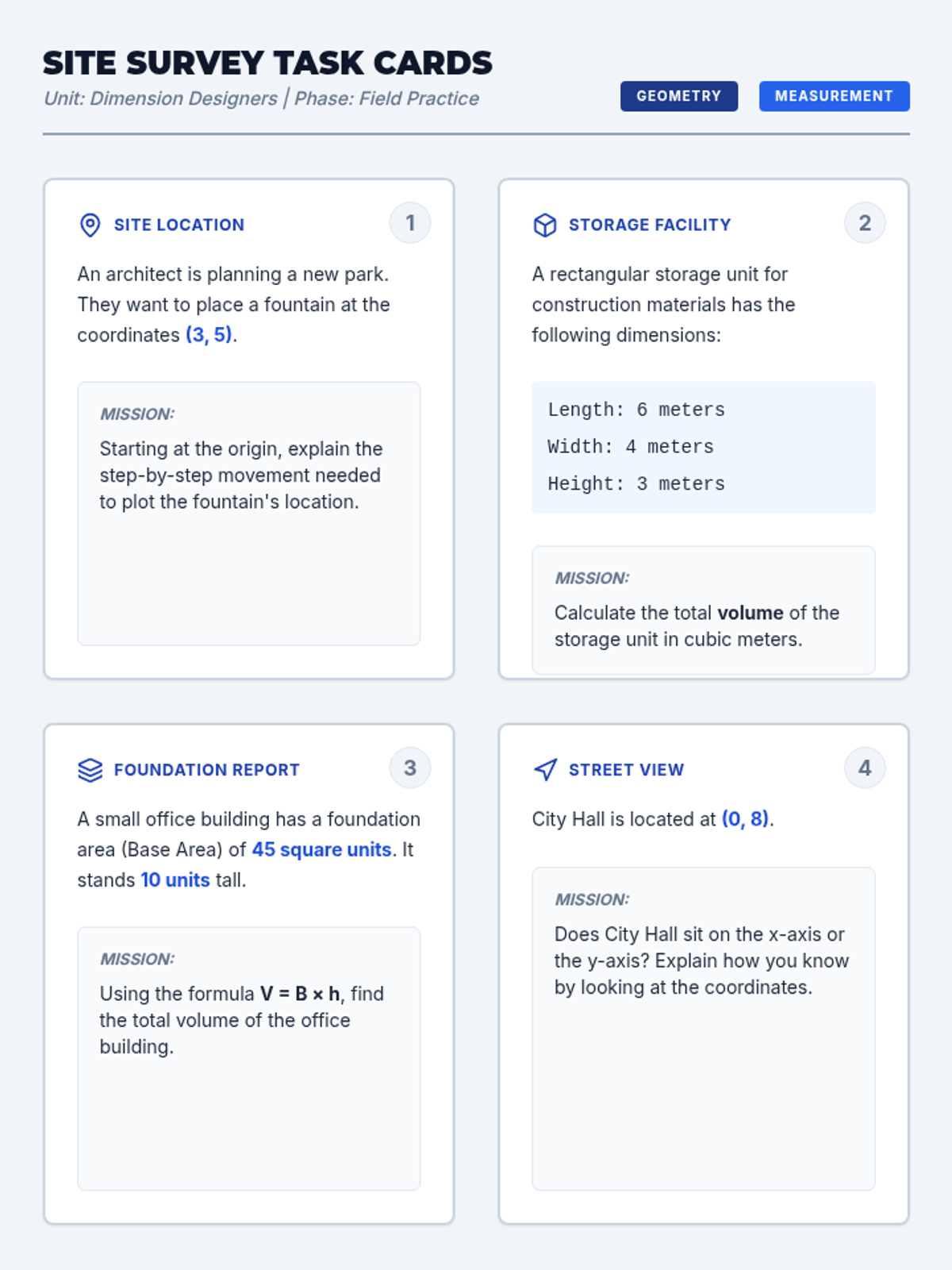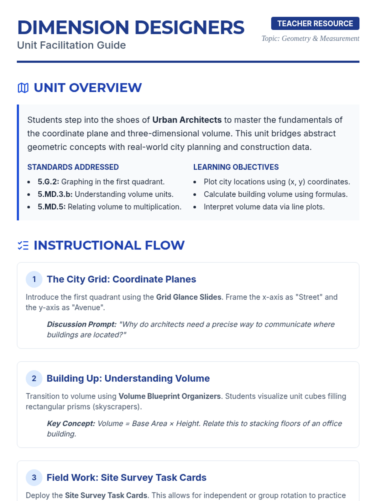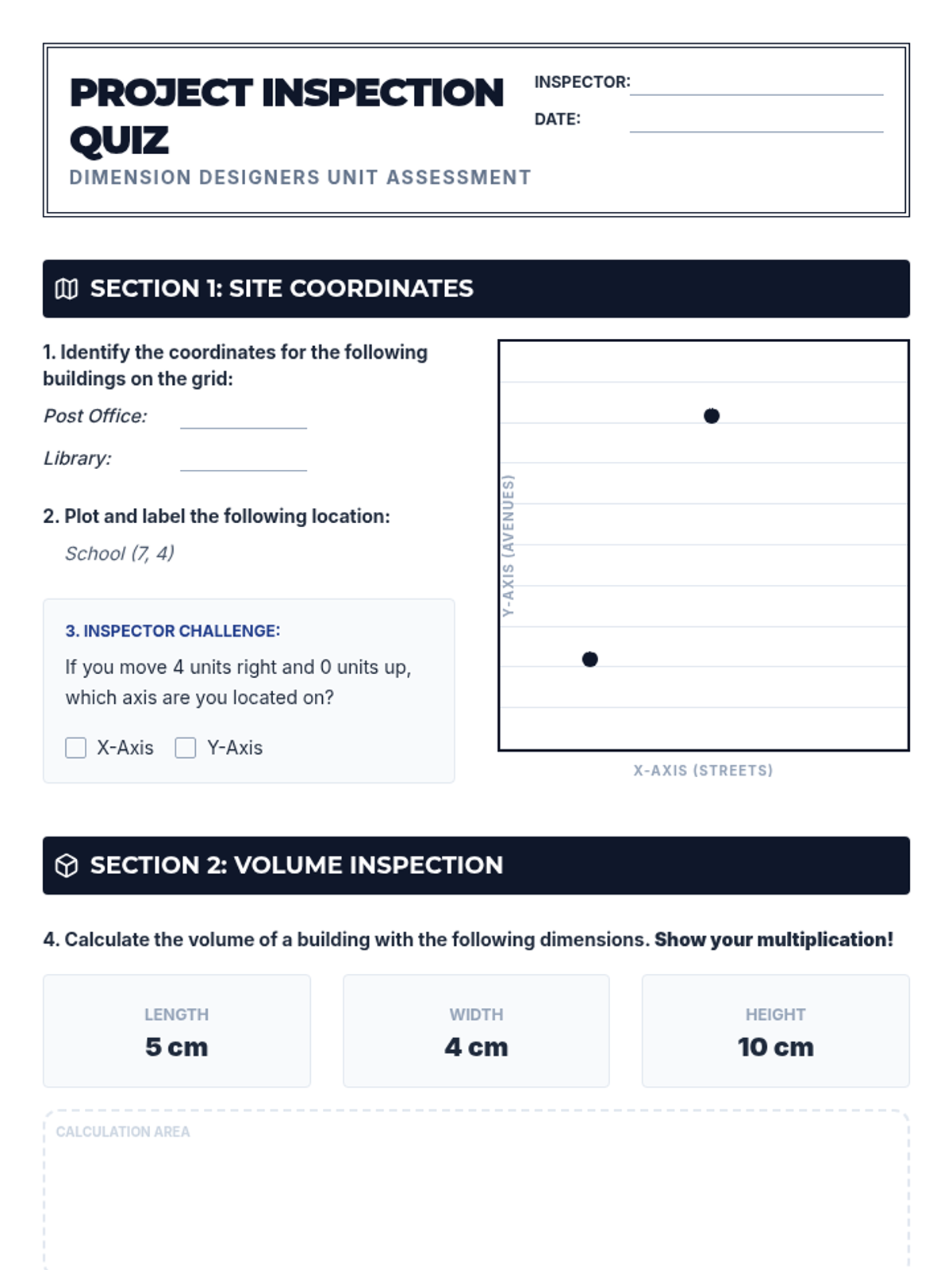 A comprehensive introduction to graphing in the first quadrant and calculating volume through the lens of urban planning and architecture. Students will map out city structures and calculate the space needed for various building designs.